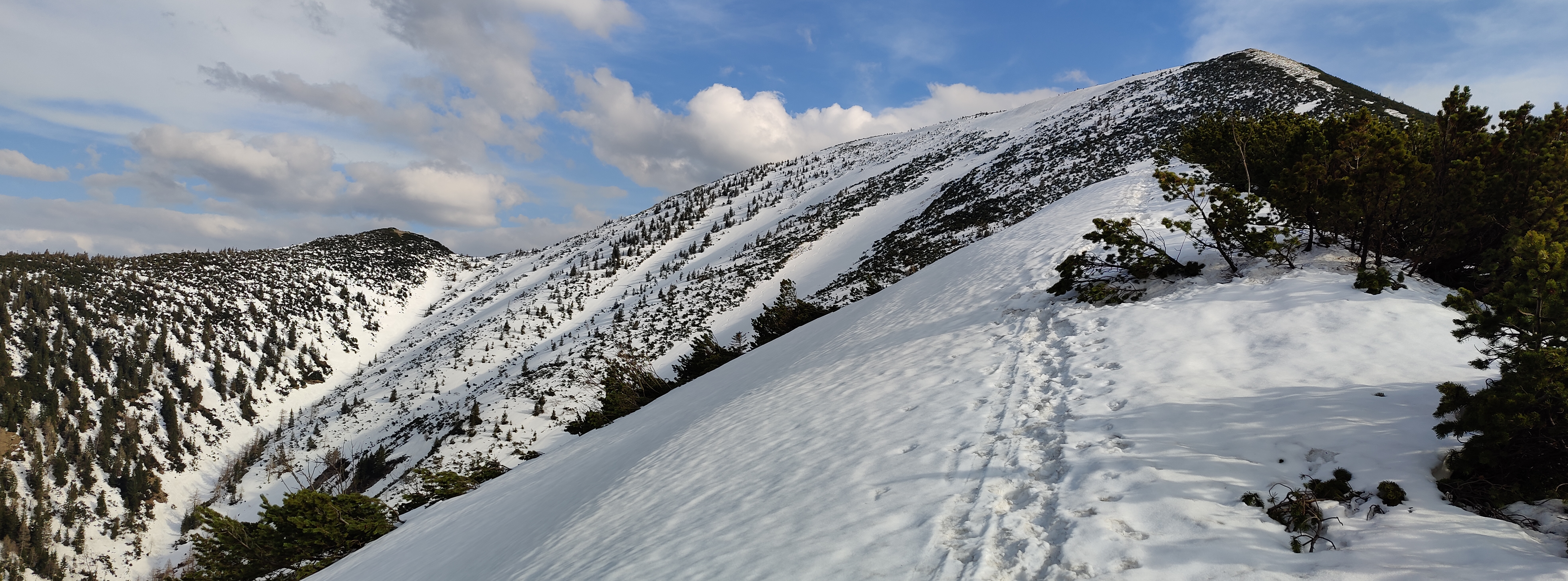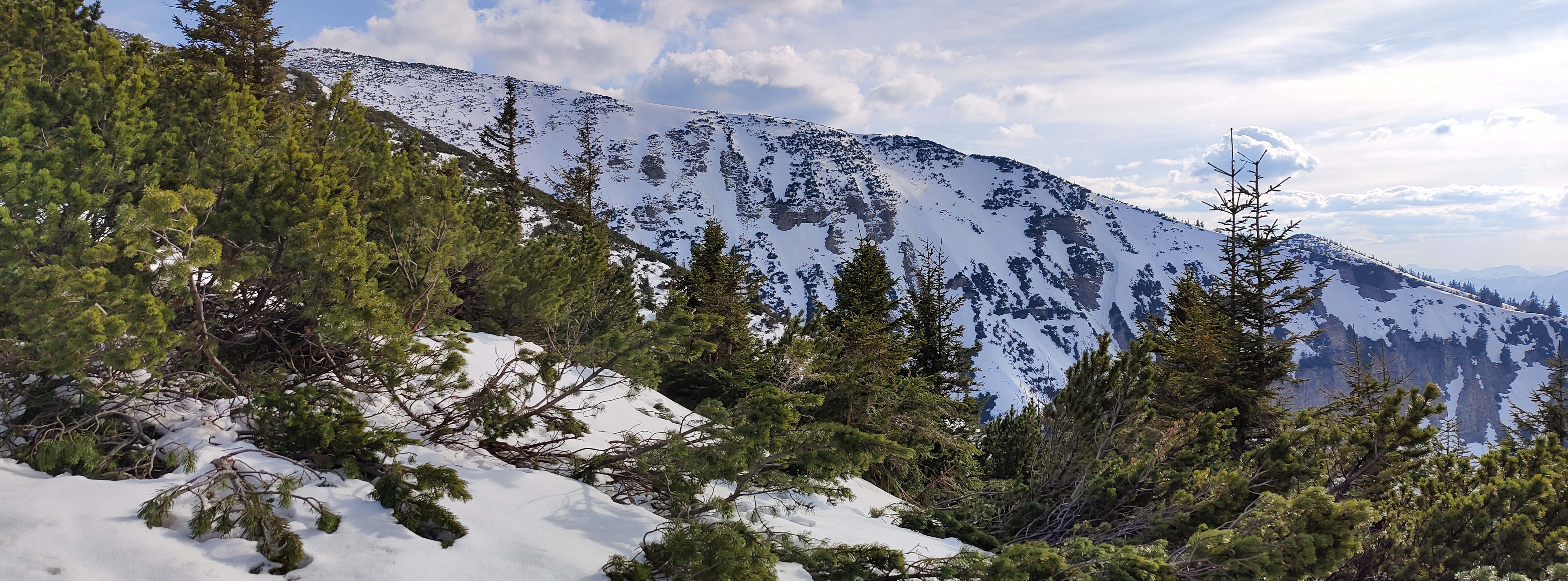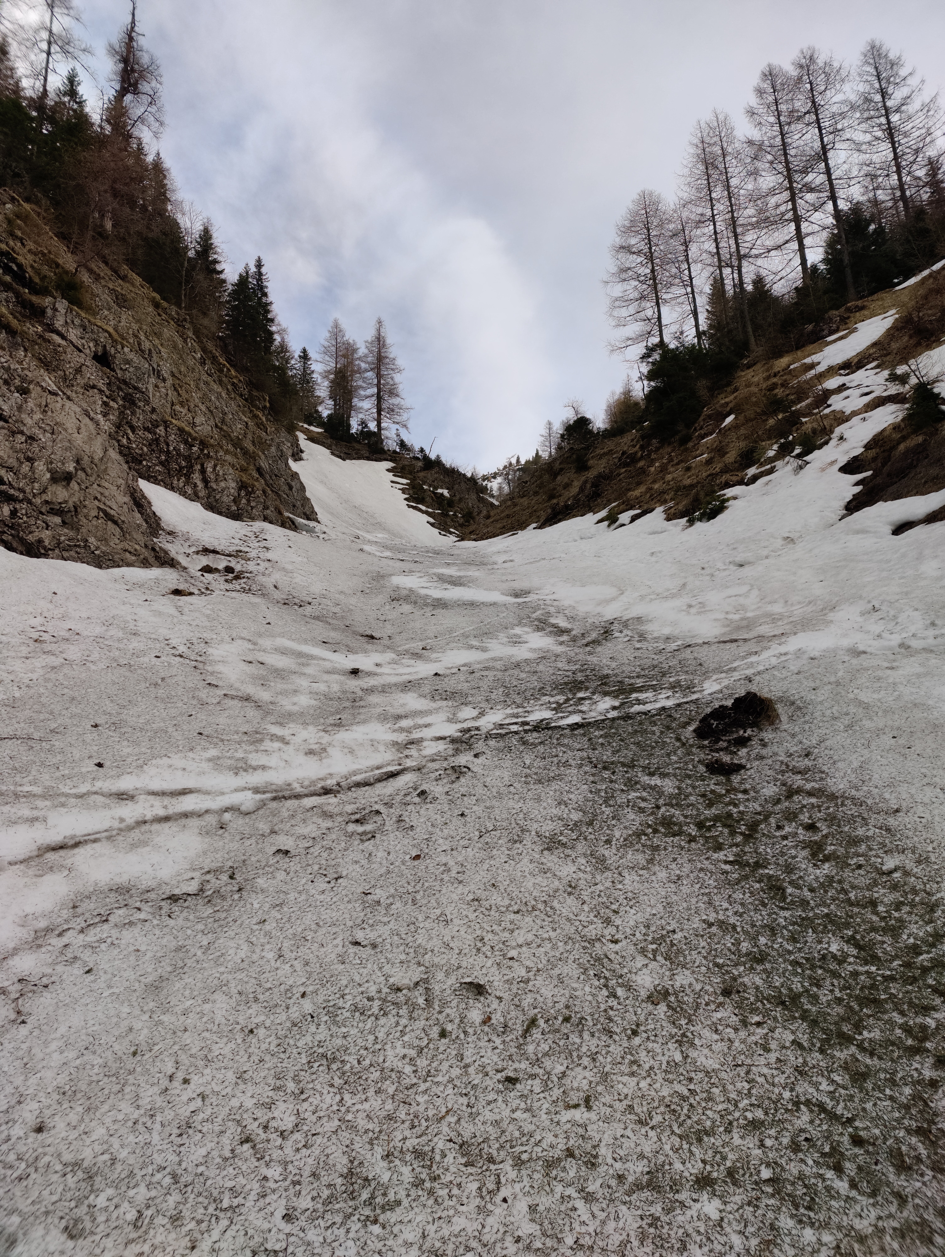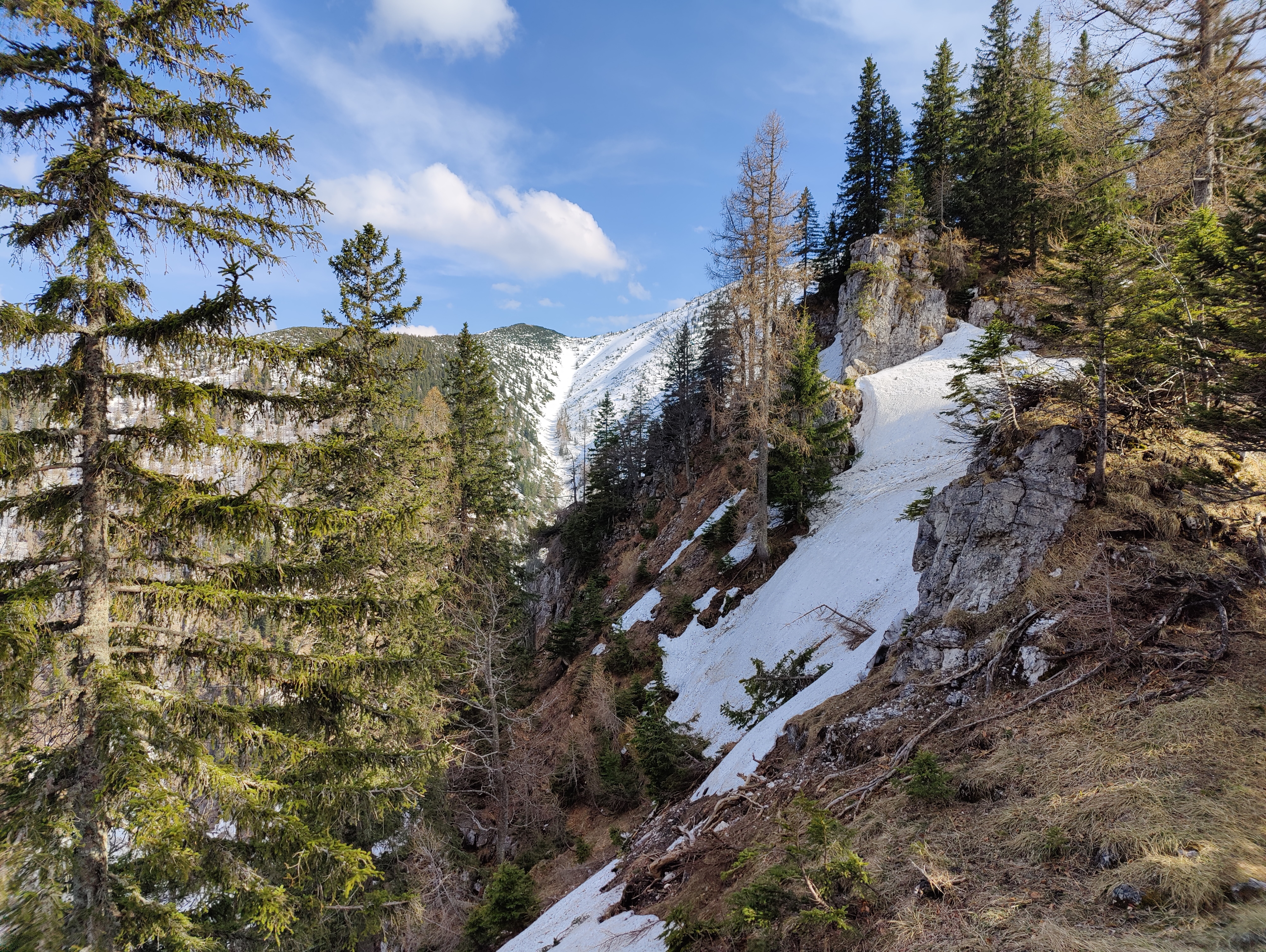 Vom Gscheid auf der Nordseite über Sommerweg auf den Gipfel. Der Weg ist bis kurz nach dem Gesenger schneefrei, danach ist anschnallen möglich, ich habe es nicht gemacht. 1. Abfahrt Richtung Schindleralm direkt vom Gipfel möglich. Vor der Engstelle Abfahrt beendet und Wiederaufstieg zum Gipfel. 2. Abfahrt über die Hühnerkralle in den Göllergraben. Abfahrt bis ca. 1200 Meter möglich, 30 Minuten Ski tragen bis zum Parkplatz.