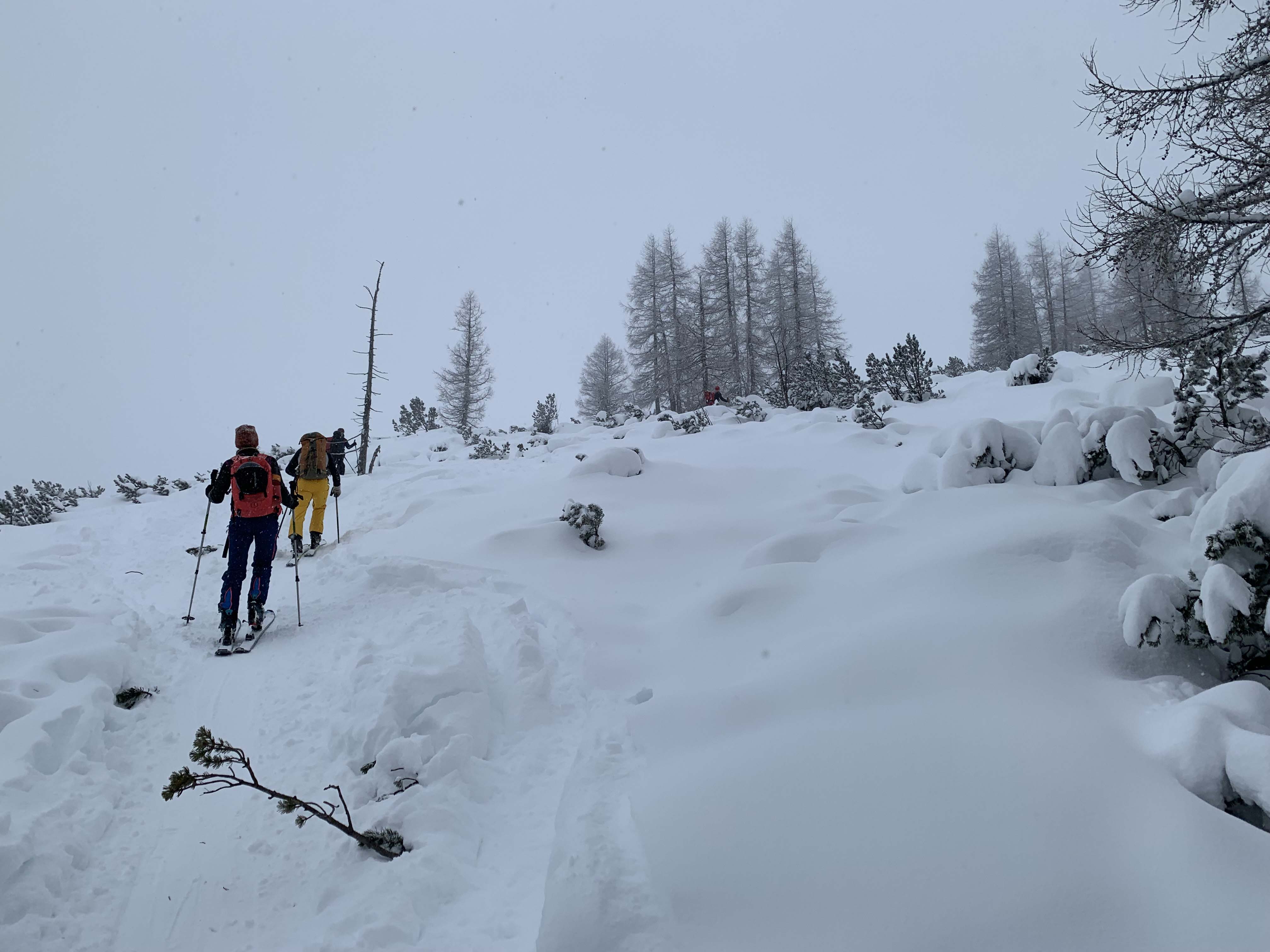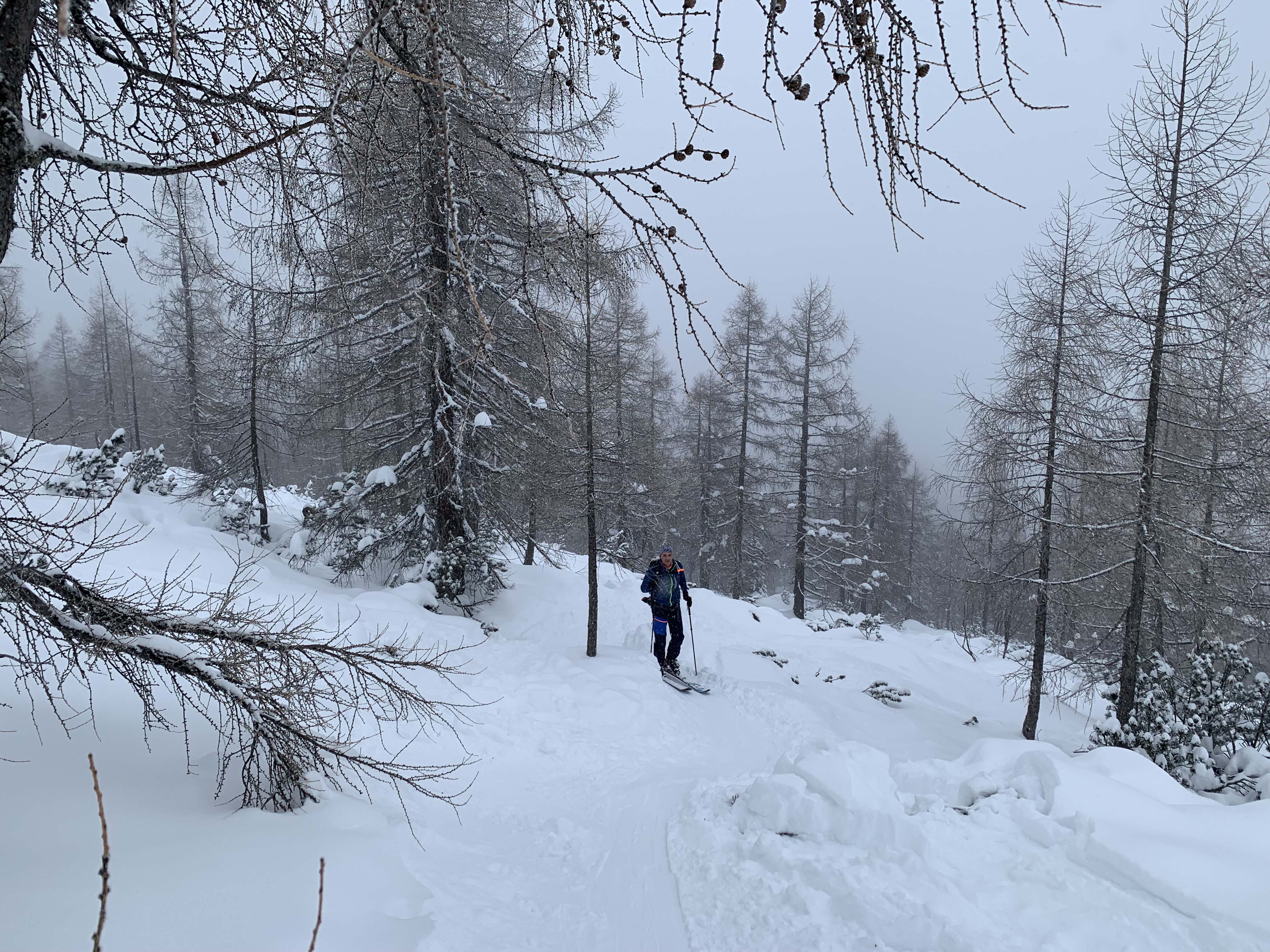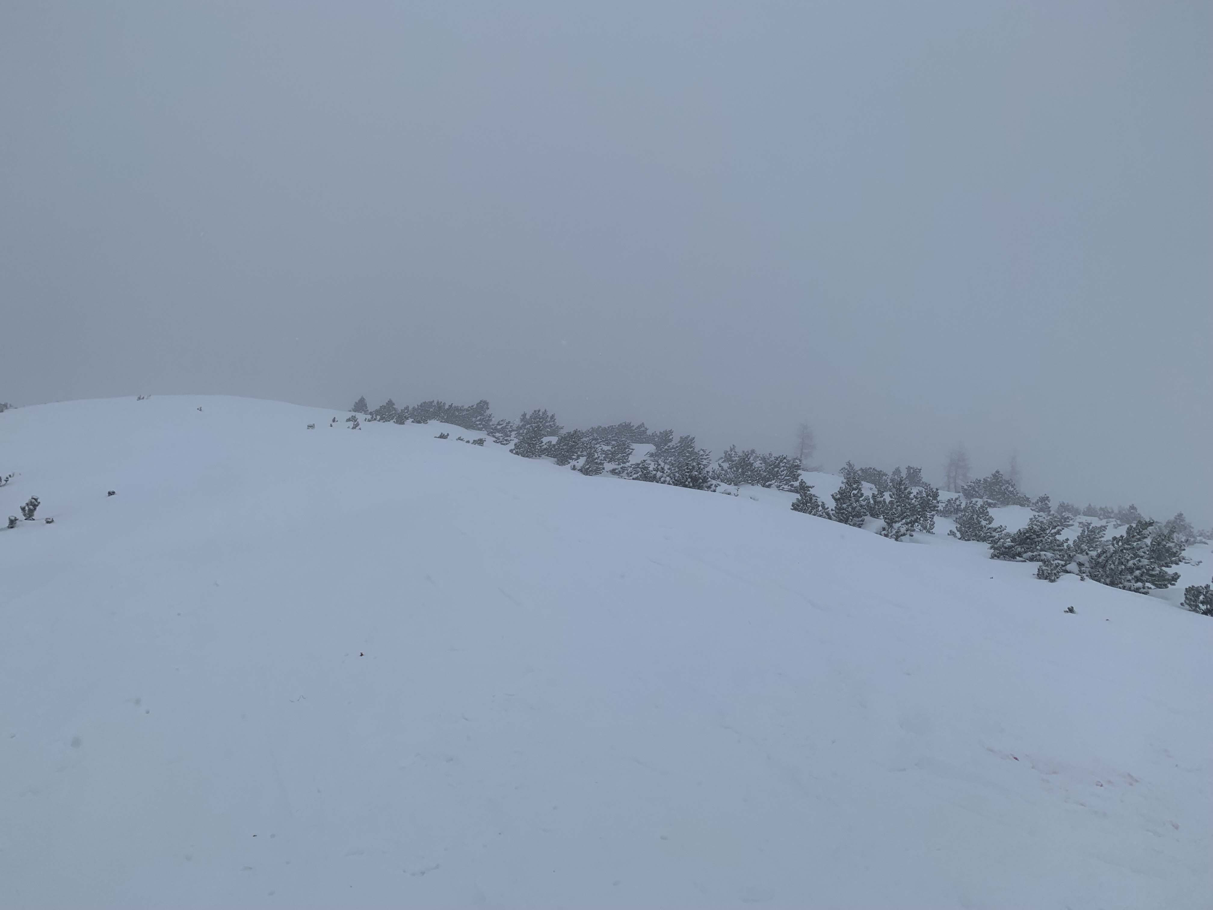 Der Parkplatz (EUR 5 für 5 Stunden) war gut gefüllt. Ausreichend Schnee vom Start weg. Im Bereich der Hackl-Lifte stark verspurt. Im Hohlweg war beim Aufstieg noch genügend Schnee, durch das Abscheren der zuvor Abgefahrenen kam bei der Abfahrt dort an wenigen Stellen aber der eine oder Stein zum Vorschein - guter Normalzustand. Ansonsten Powder zum Genießen. Die Latschen im Gipfelbereich sind meist noch nicht mit Schnee überdeckt. Wetter: -2°C am Start. Kaum Wind. Leichter Schneefall bei Sichtweite von ca. 100m.