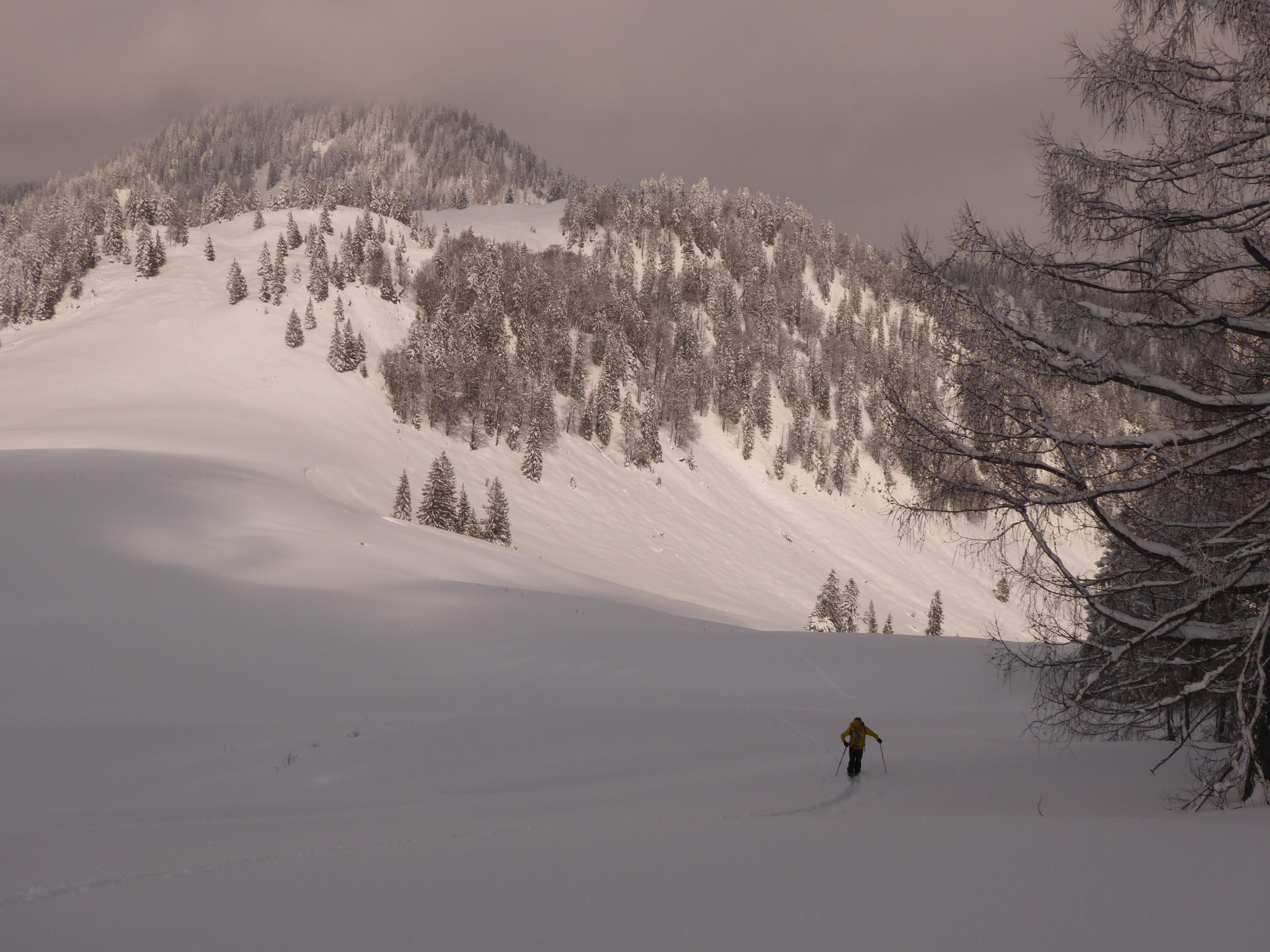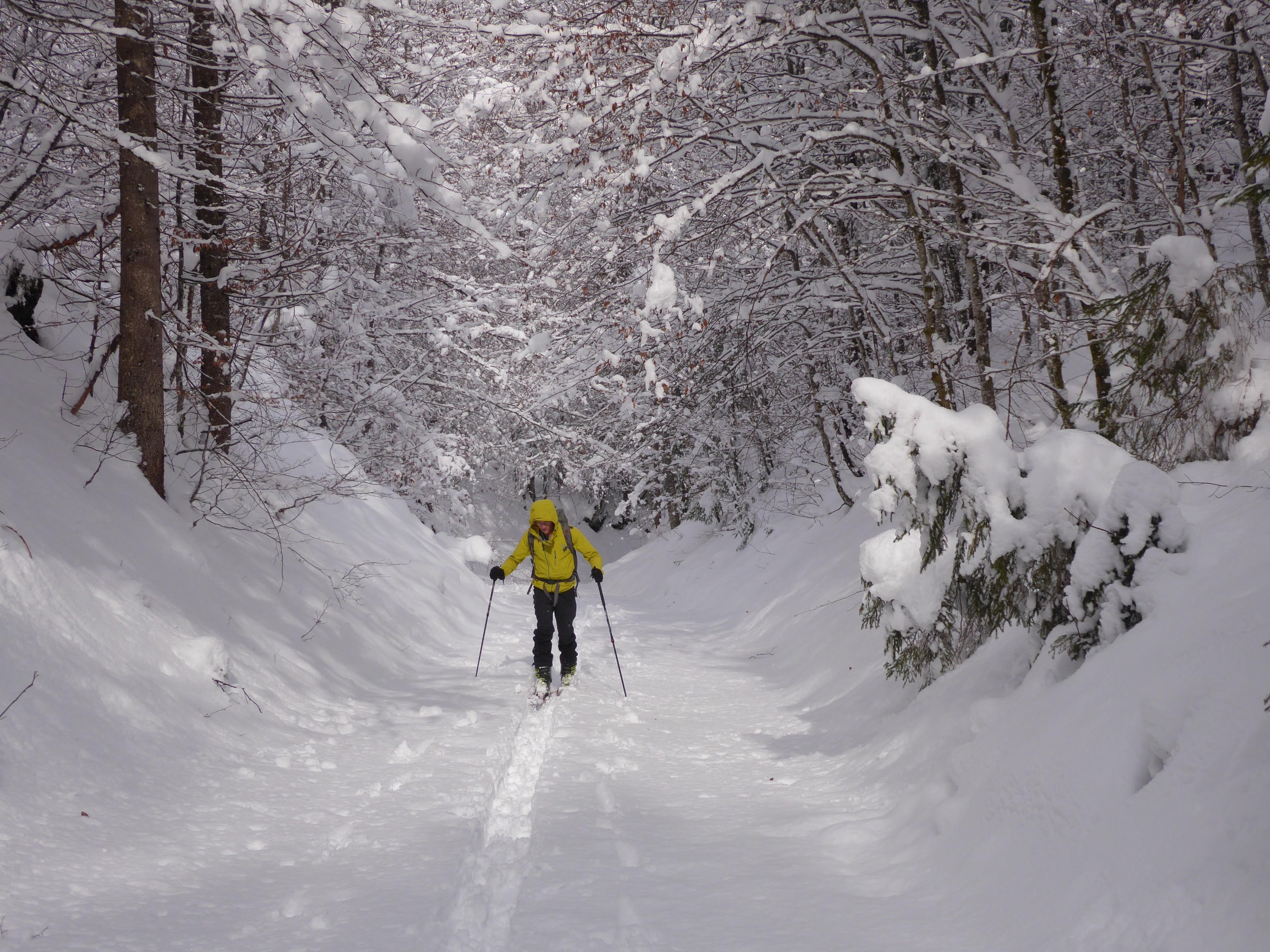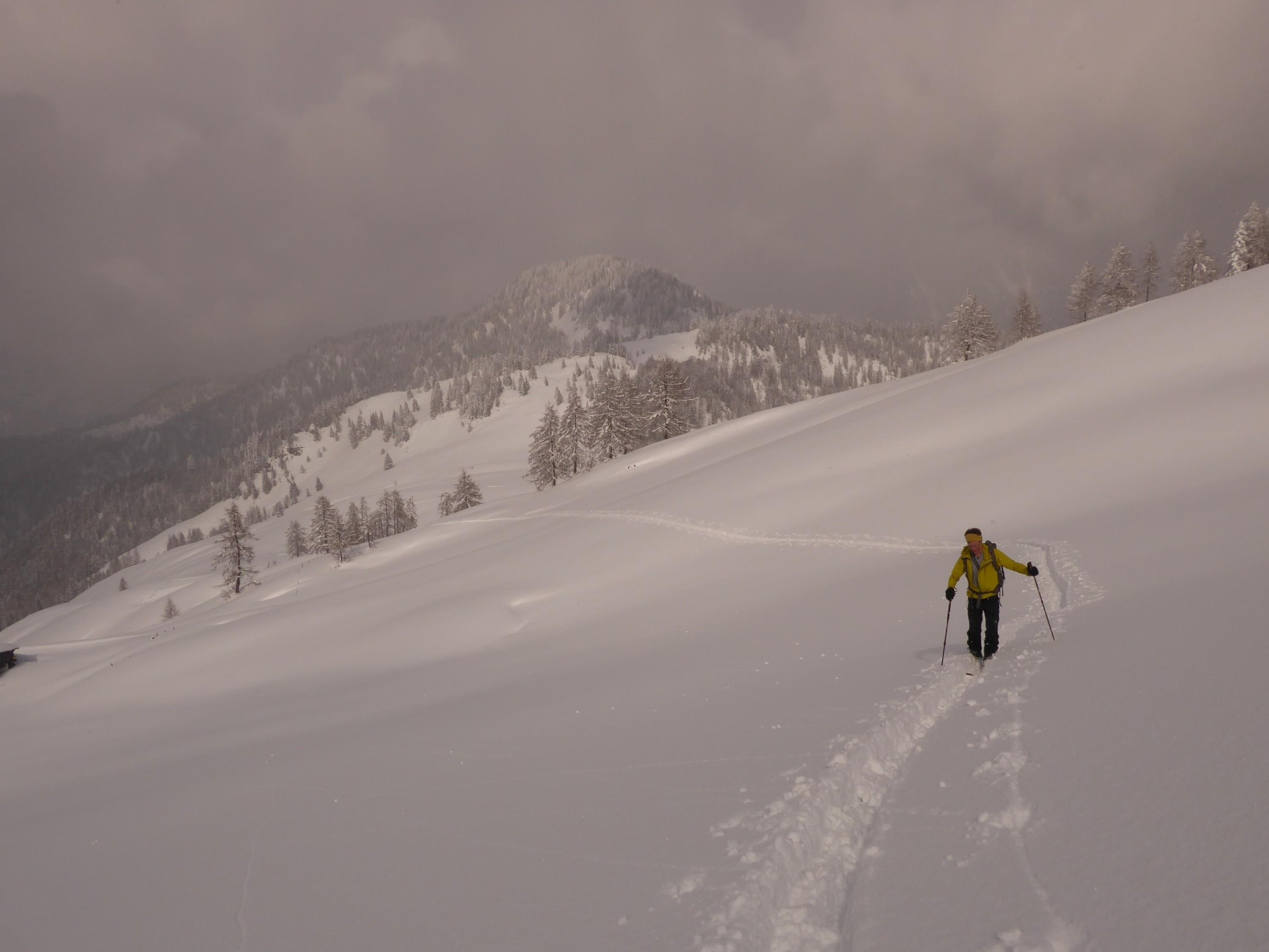 Schnee: In Mengen. Im unteren Teil auf der (gut eingeschneiten) Rodelbahn schon stark angefeuchtet und bis zur Abfahrt bereits....na ja, wo ich aufgewachsen bin, nennt man das "a Lettn", also grauslig zu fahren. Besser, mit dem Auto zur Kapelle rauffahren und dort starten, bis dorthin versäumt man nichts bei diesen Bedingungen. Nach der flachen Forststraße ab Raineralm immer noch sehr dicht und schwer, nach obenhin immer besser (und trockener) werdend, aber bei der Abfahrt bleibt man in den flacheren Passagen fast stecken. Zu spuren wars auch nicht grade leicht.