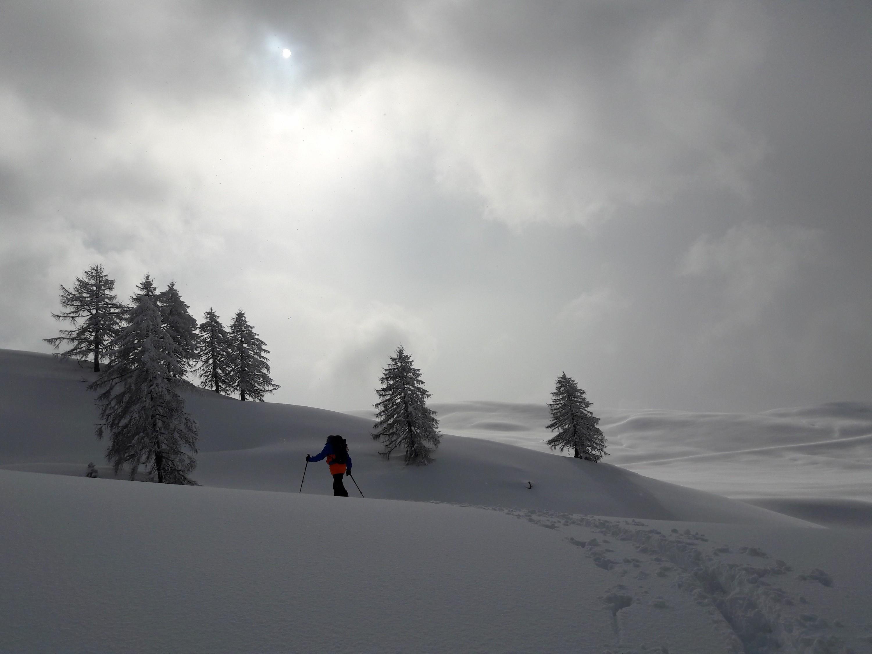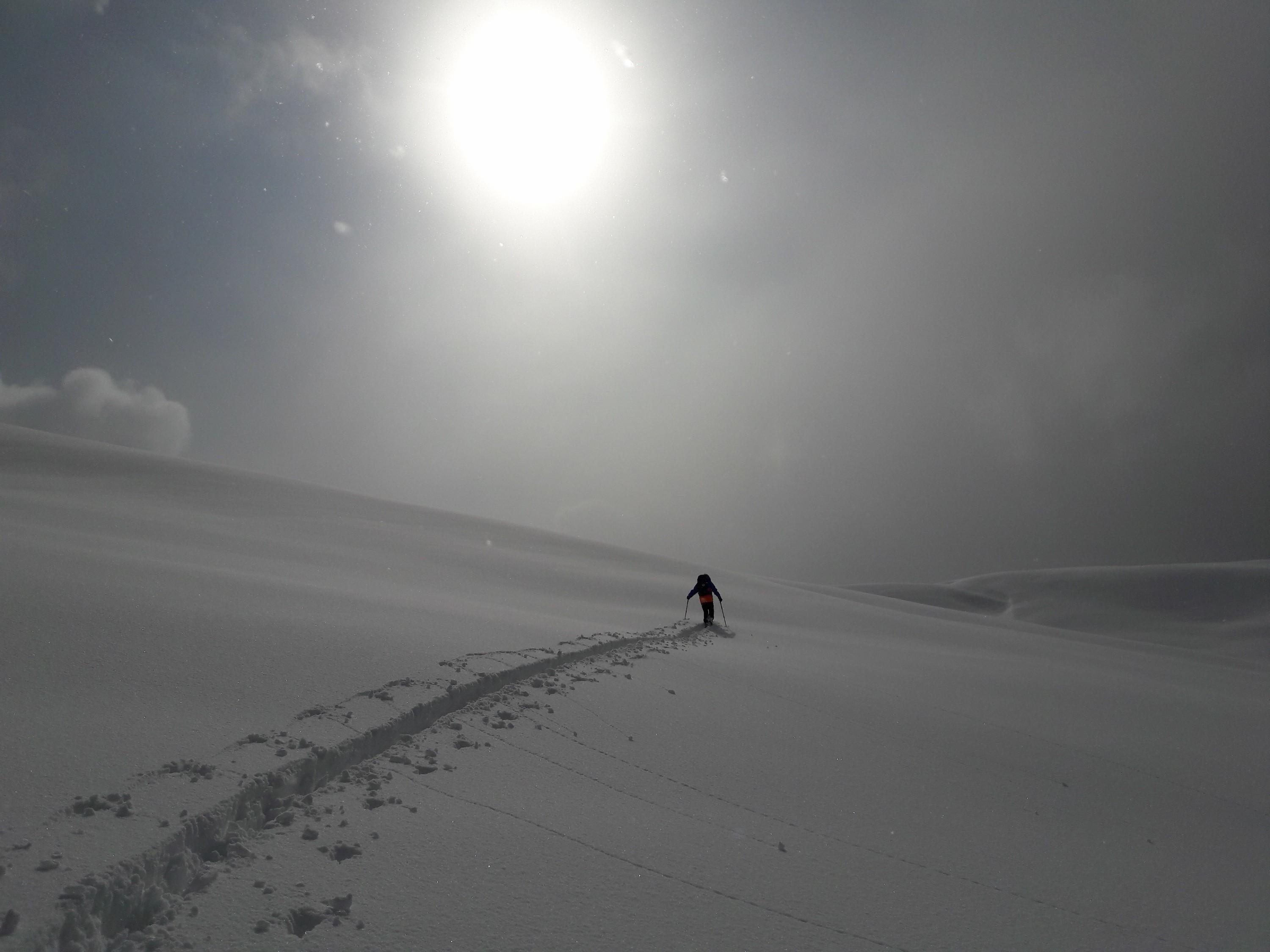 Andrang: Aufstieg war einzuspuren, also nur wir beide, beim Kreuz ist dann ein Pärchen nachgekommen und bei der Abfahrt kamen Spuren von Schafelberg-Überschreitern dazu. Fazit: Wenn auch die Abfahrt nicht das Gelbe vom Ei war, war es trotzdem sehr schön, aus dem Schneegestöber am Vormittag in die Sonnenfenster hochzuspuren. So mag ich's...