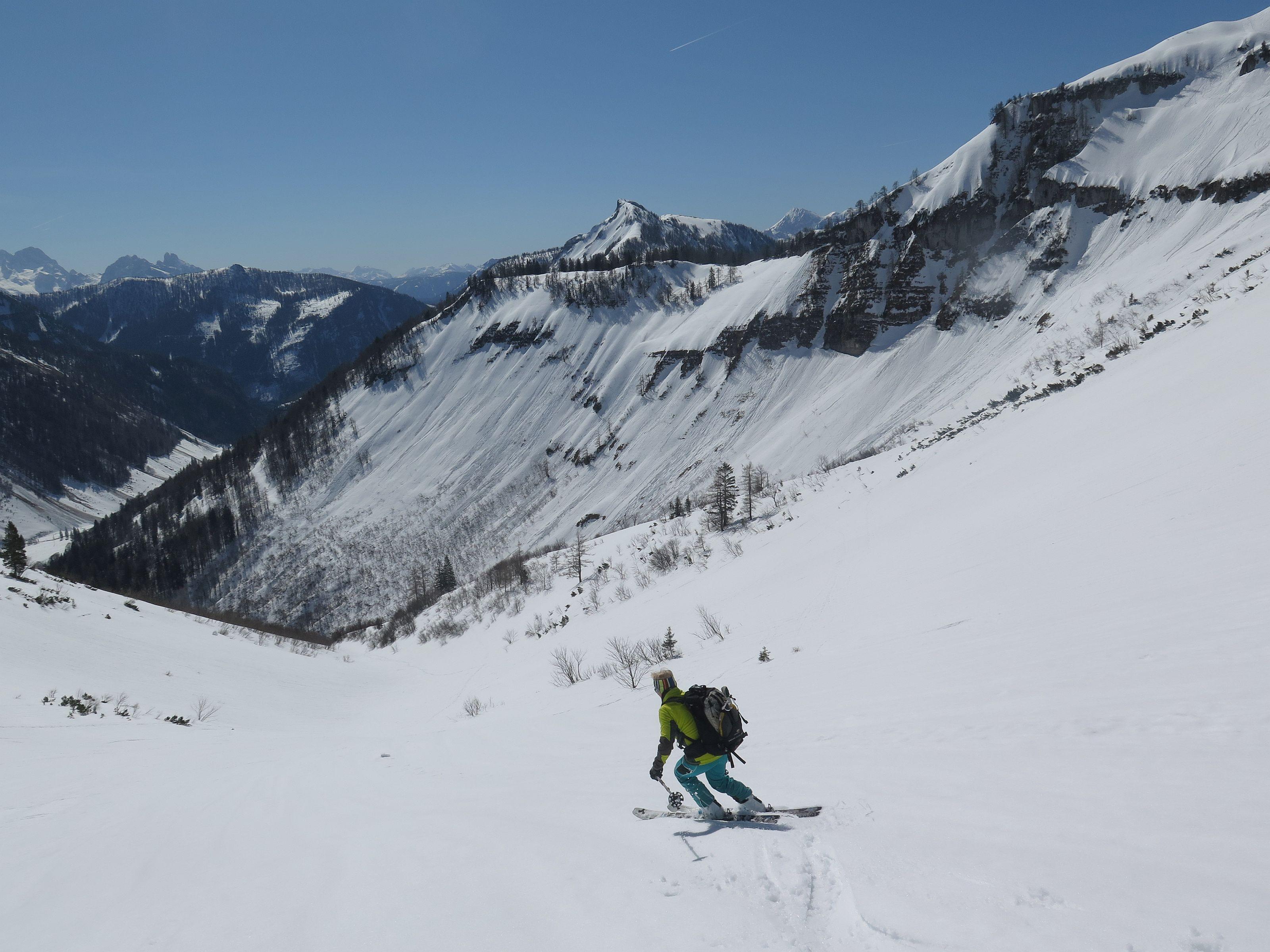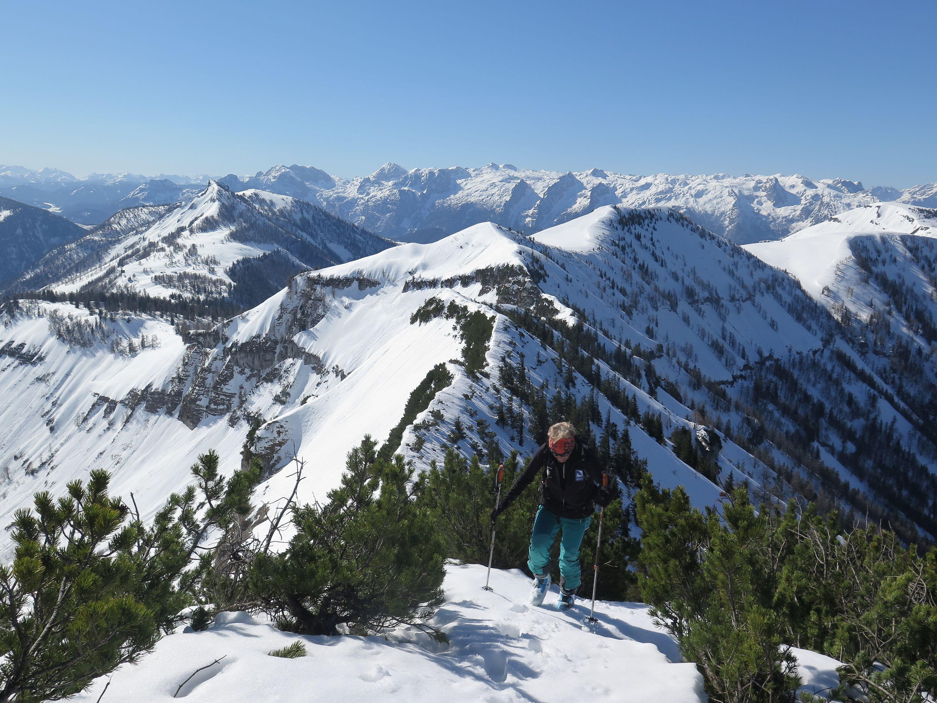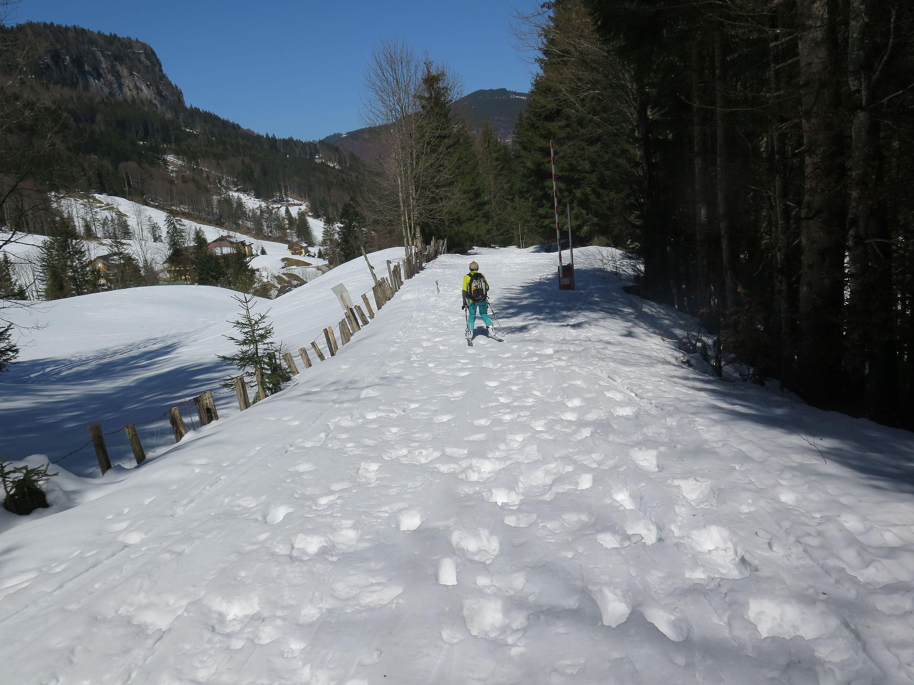 Schwieriger Osterhorngipfel, wird im Winter sehr selten besucht, waren laut Gipfelbuch heuer erst die 4 Partie. Die Forststraße zur Genneralm hat noch eine durchgehende Schneedecke, ist aber durch tiefe Fußspuren zu einer Waschrumpel geworden und ist schlecht zu fahren. Wetter wie gestern, sonnig und warm. Schnee am Ostgrat stellenweise schon etwas weich, die weitere Abfahrt allgemein aber noch gut zu fahren.