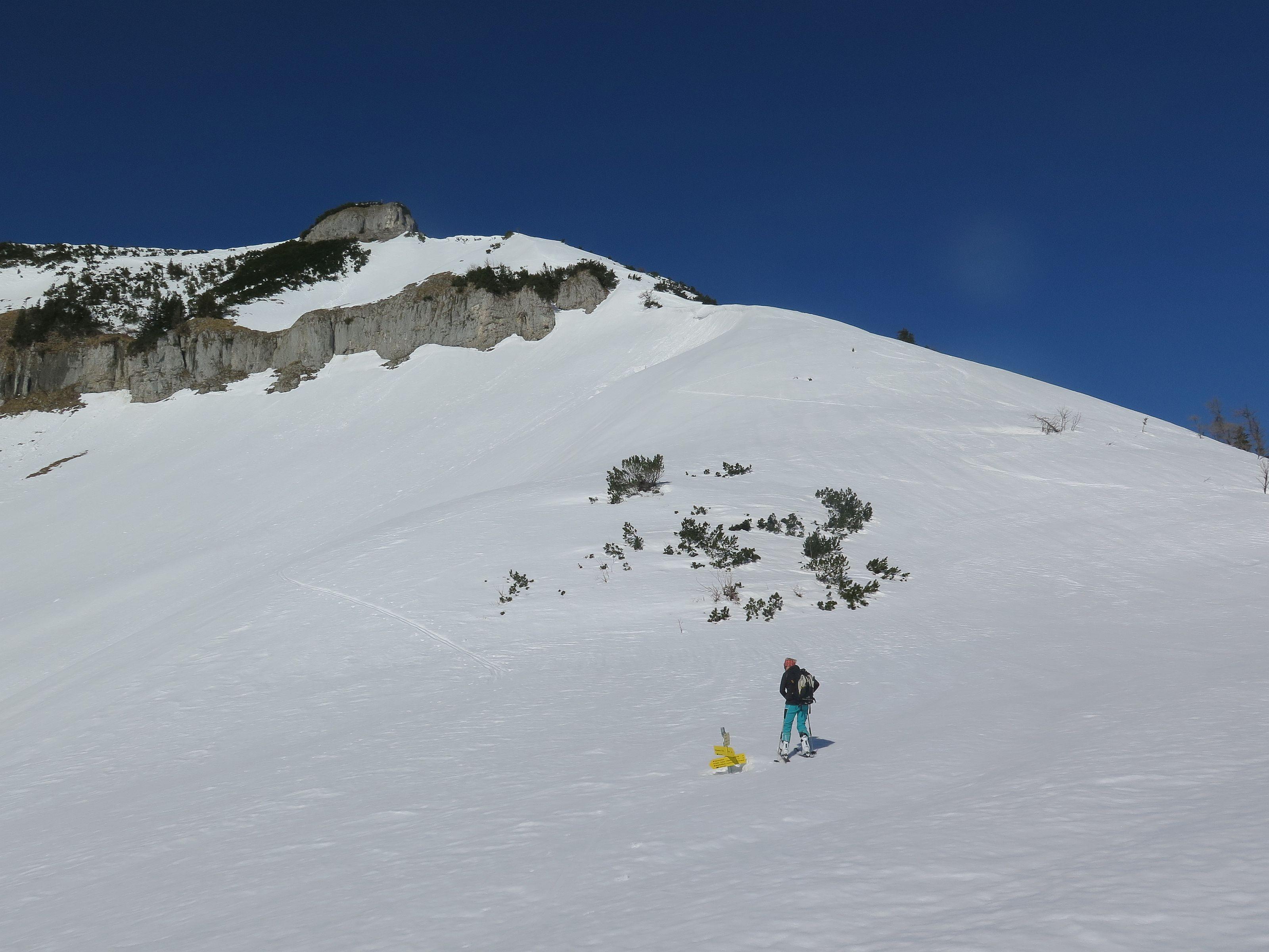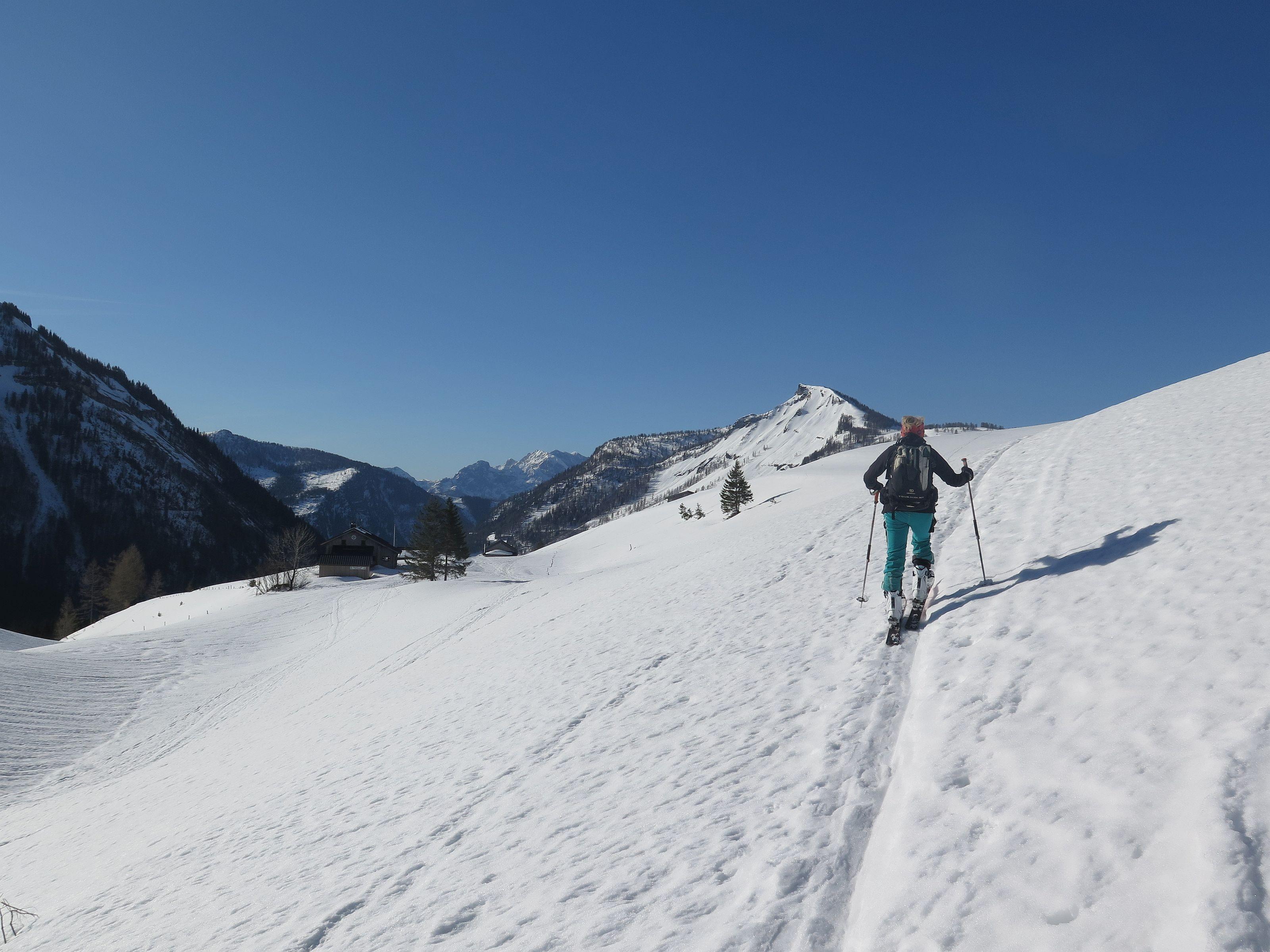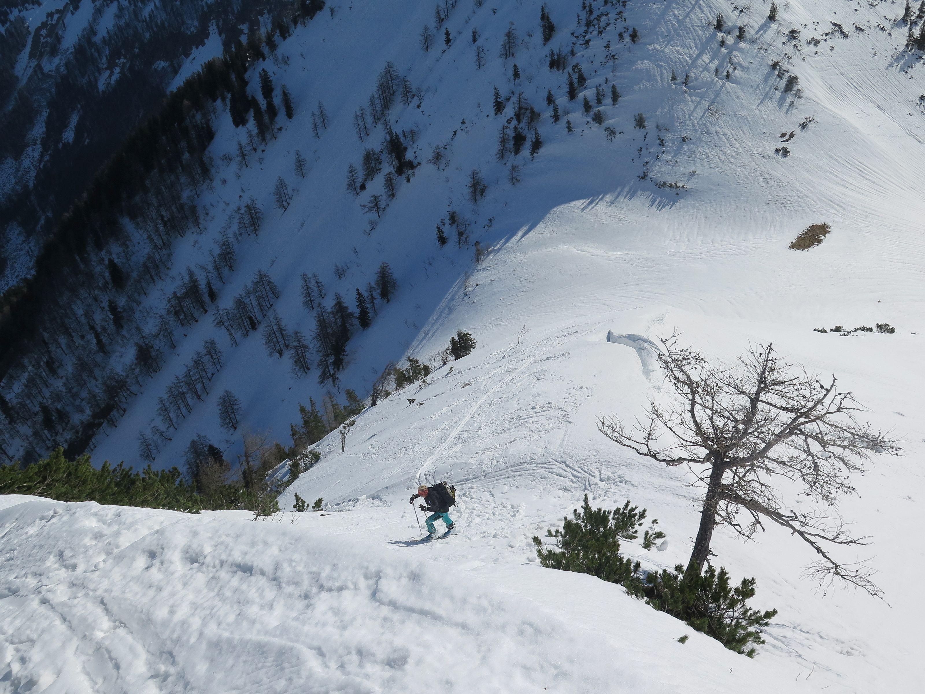 Schwieriger Osterhorngipfel, wird im Winter sehr selten besucht, waren laut Gipfelbuch heuer erst die 4 Partie. Die Forststraße zur Genneralm hat noch eine durchgehende Schneedecke, ist aber durch tiefe Fußspuren zu einer Waschrumpel geworden und ist schlecht zu fahren. Wetter wie gestern, sonnig und warm. Schnee am Ostgrat stellenweise schon etwas weich, die weitere Abfahrt allgemein aber noch gut zu fahren.
