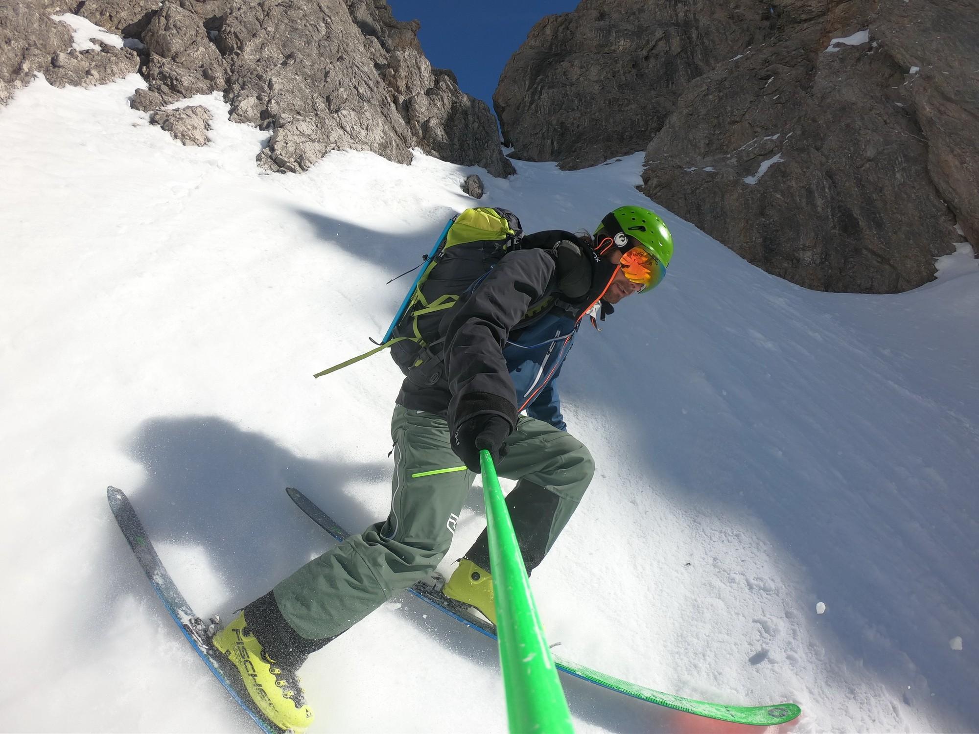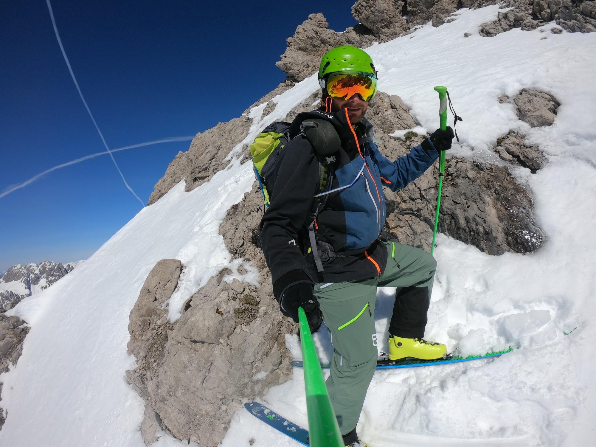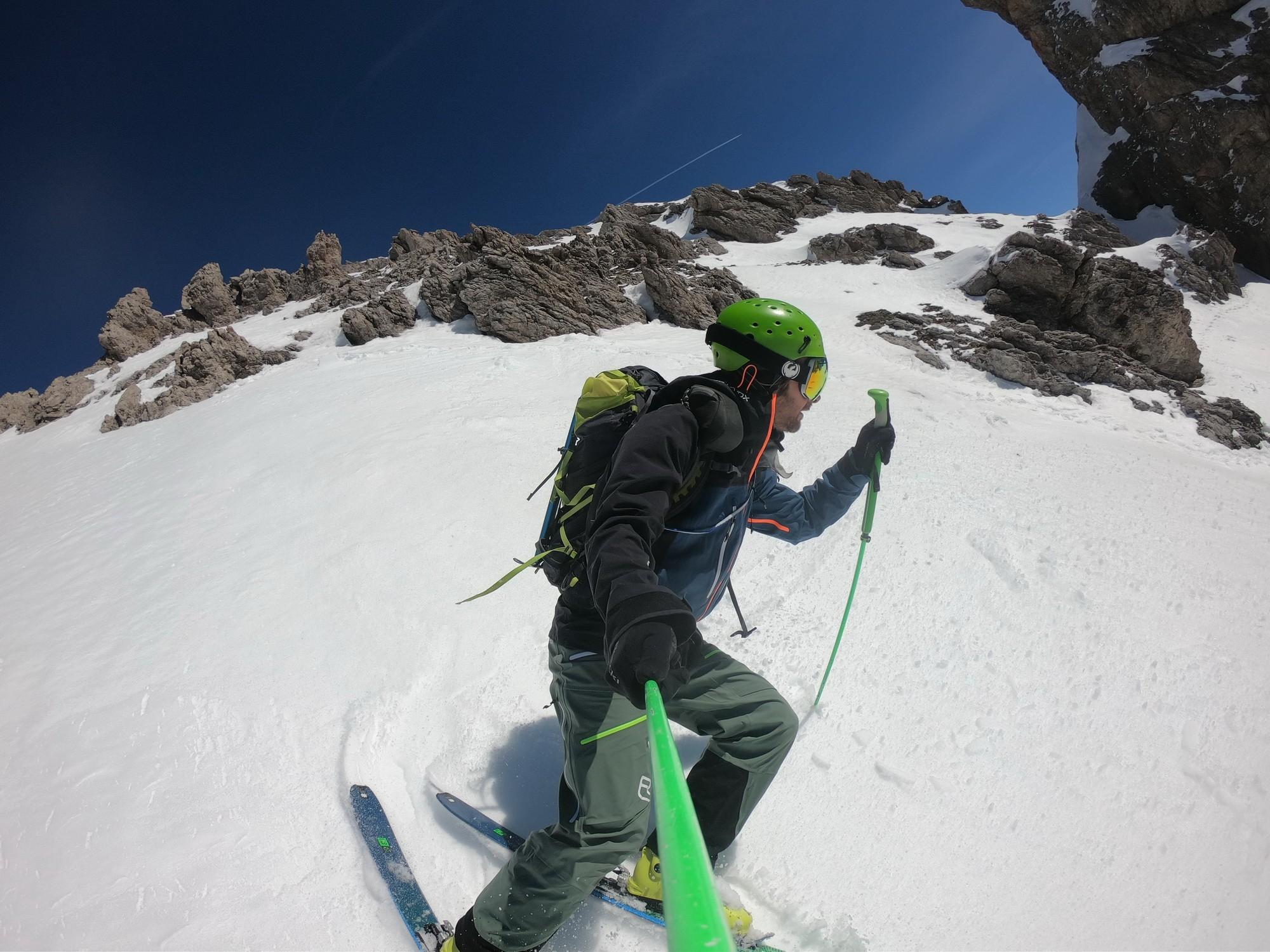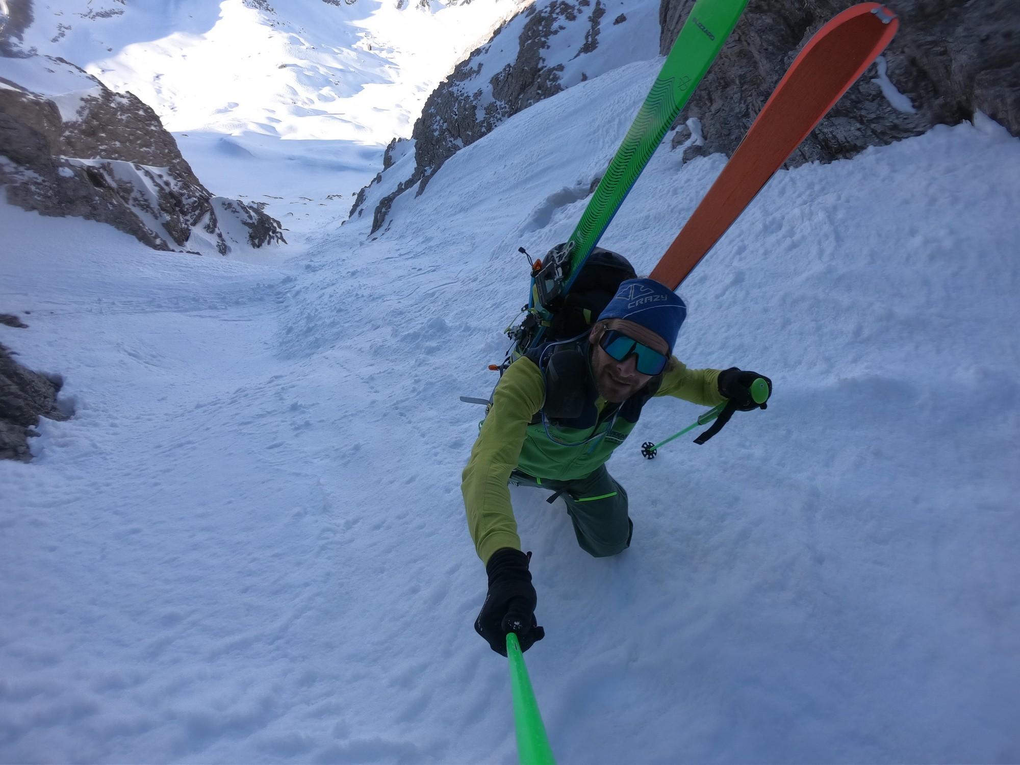 Noch immer gibt es unmengen von Schnee im großen Lasezkessel. Die Schneedecke hat sich gut stabilisiert und man findet in vielen Bereichen schon einen tragfähigen Harschdeckel vor. Beim Aufstieg war die Schneedecke noch relativ hart und so habe ich bereits vor der kurzen Rinne auf die Steigeisen gewechselt. Kurz darüber war dann schon die Sonne im Hang und es wurde zunehmend griffiger. Bei der Abfahrt hat der obere Teil bereits perfekt aufgefirnt und war richtig angenehm zu fahren. Die kurze Rinne war zwar noch im Schatten, der Schnee dort aber gut griffig und auch hier problemlos zum Abfahren.