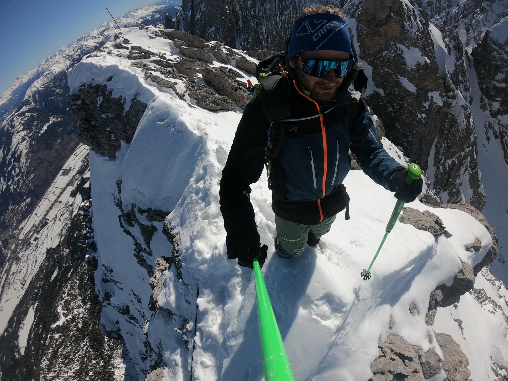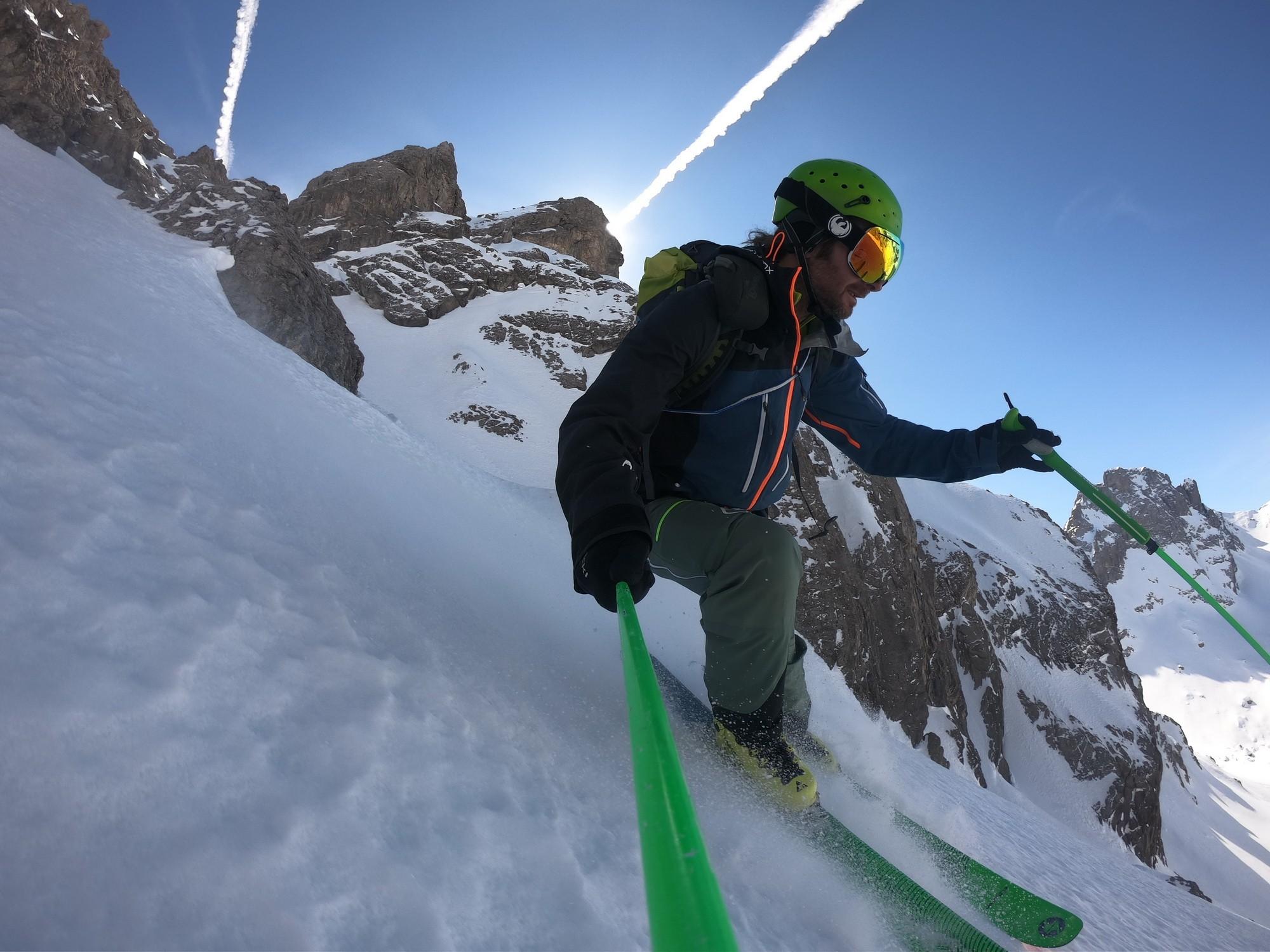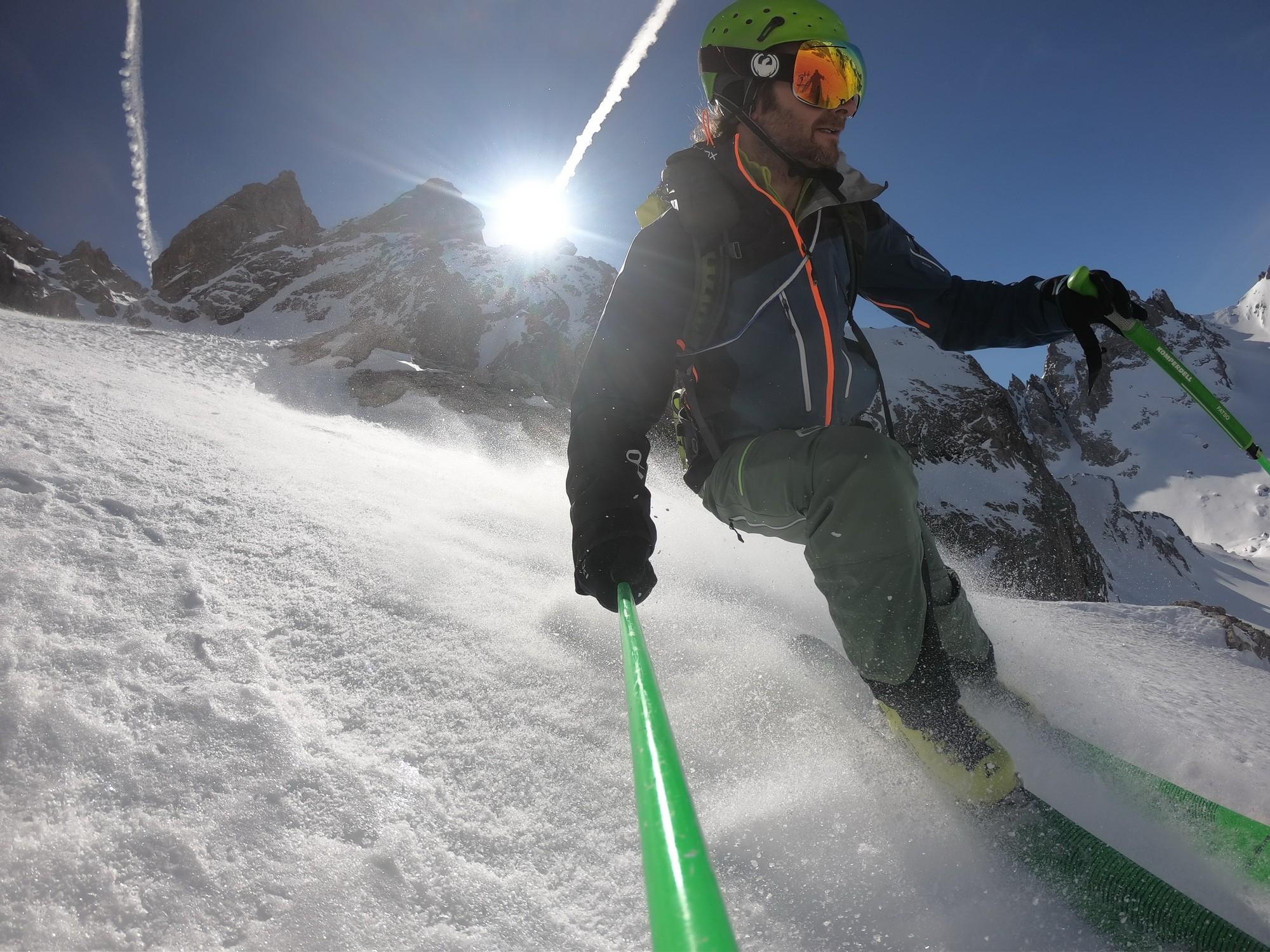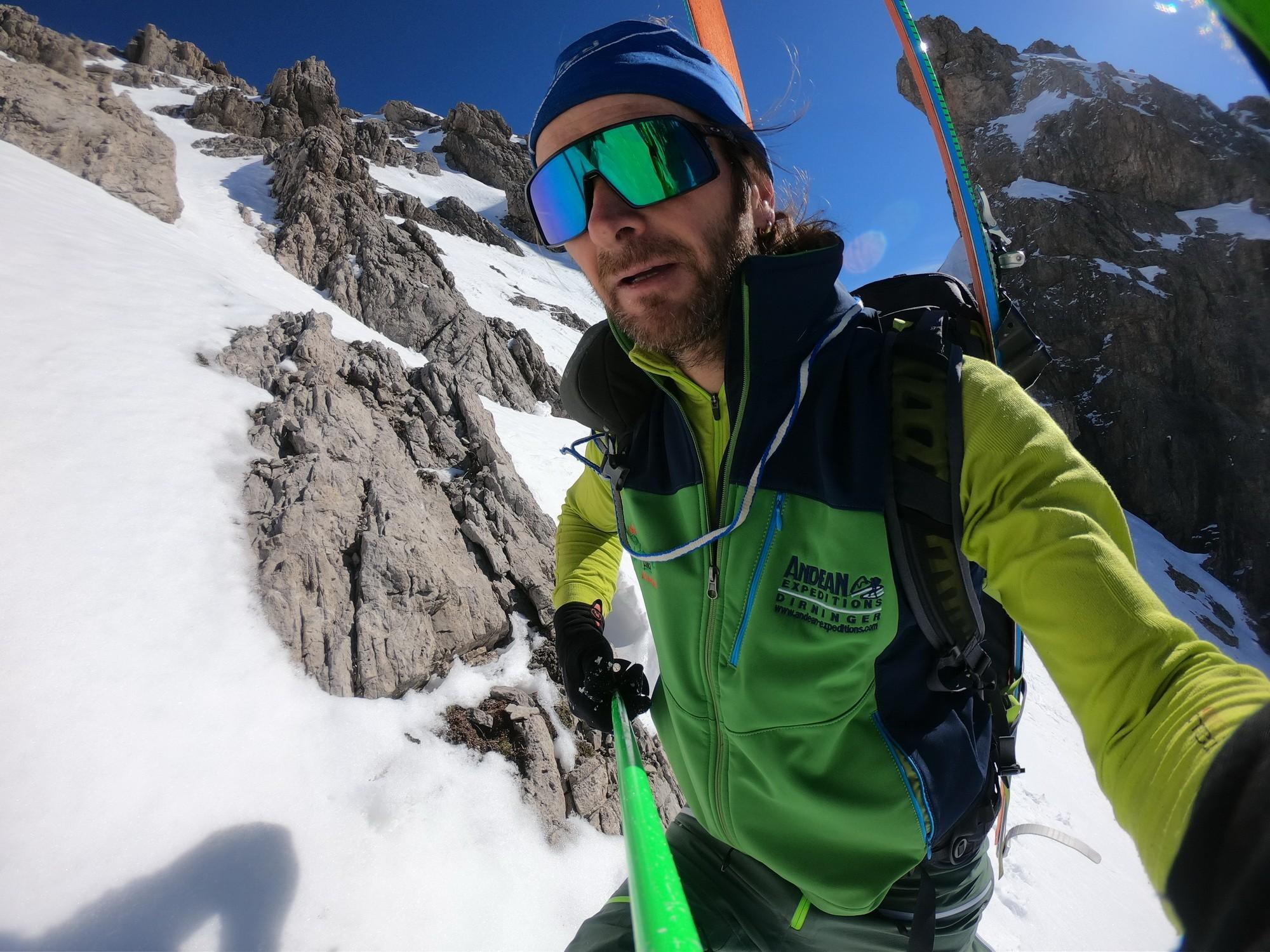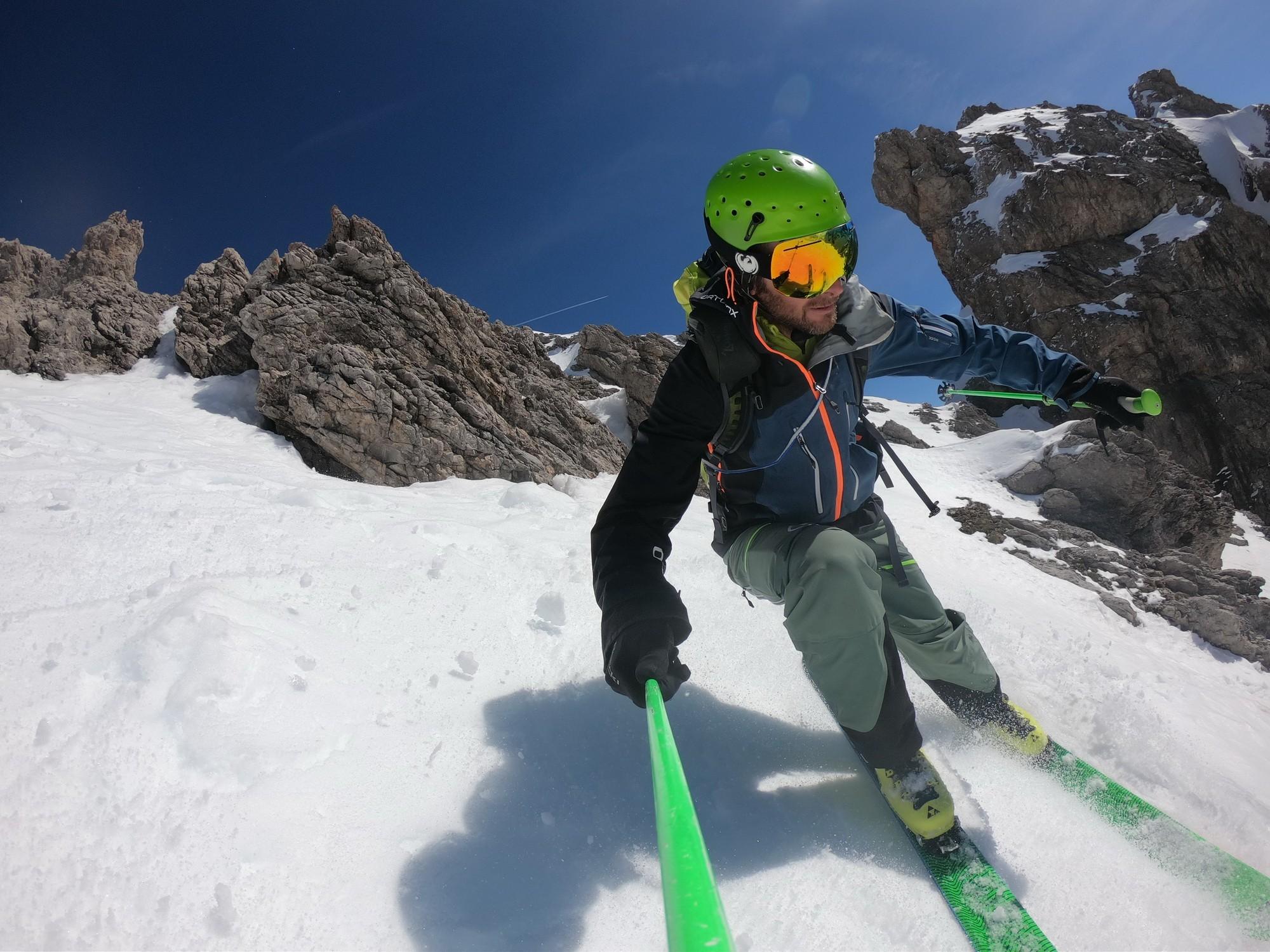 Noch immer gibt es unmengen von Schnee im großen Lasezkessel. Die Schneedecke hat sich gut stabilisiert und man findet in vielen Bereichen schon einen tragfähigen Harschdeckel vor. Beim Aufstieg war die Schneedecke noch relativ hart und so habe ich bereits vor der kurzen Rinne auf die Steigeisen gewechselt. Kurz darüber war dann schon die Sonne im Hang und es wurde zunehmend griffiger. Bei der Abfahrt hat der obere Teil bereits perfekt aufgefirnt und war richtig angenehm zu fahren. Die kurze Rinne war zwar noch im Schatten, der Schnee dort aber gut griffig und auch hier problemlos zum Abfahren.