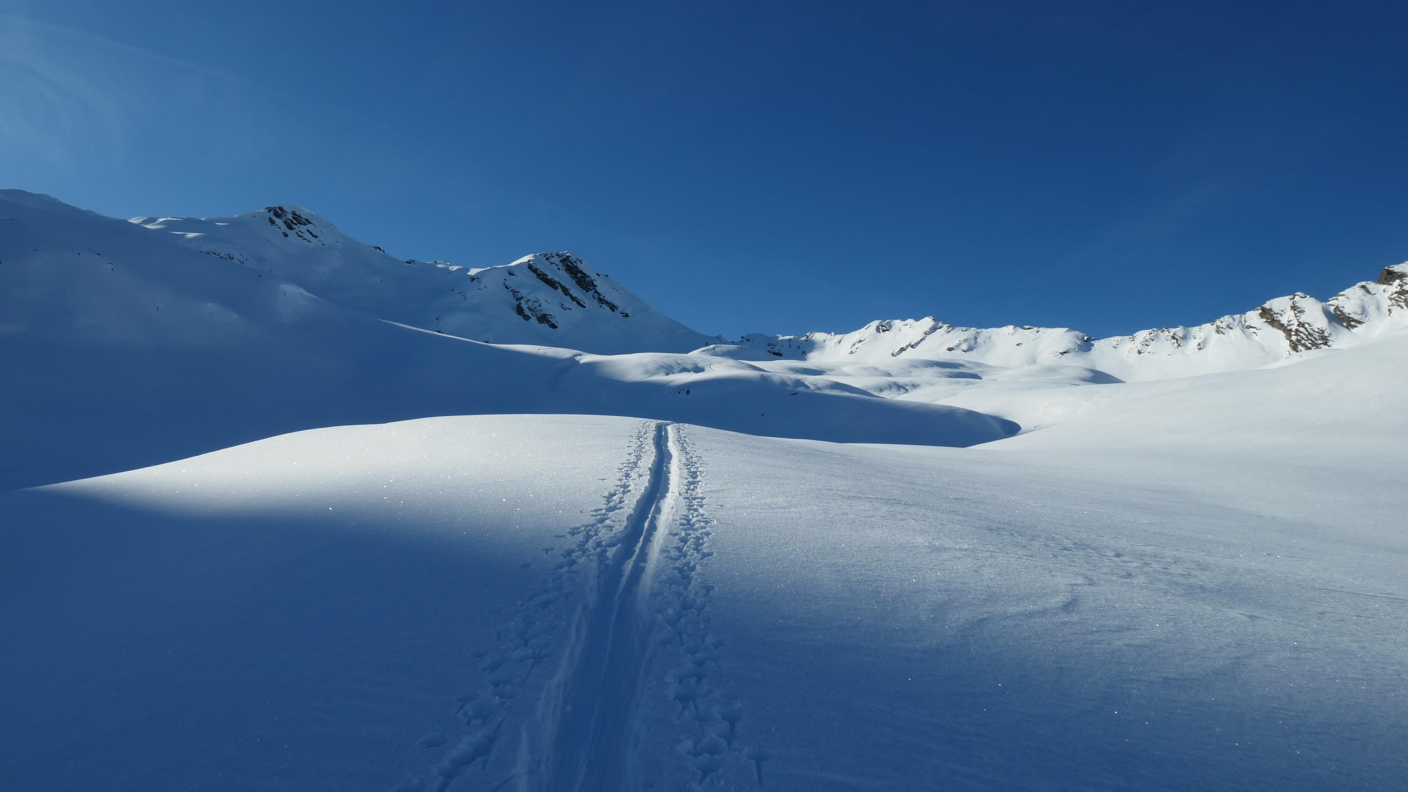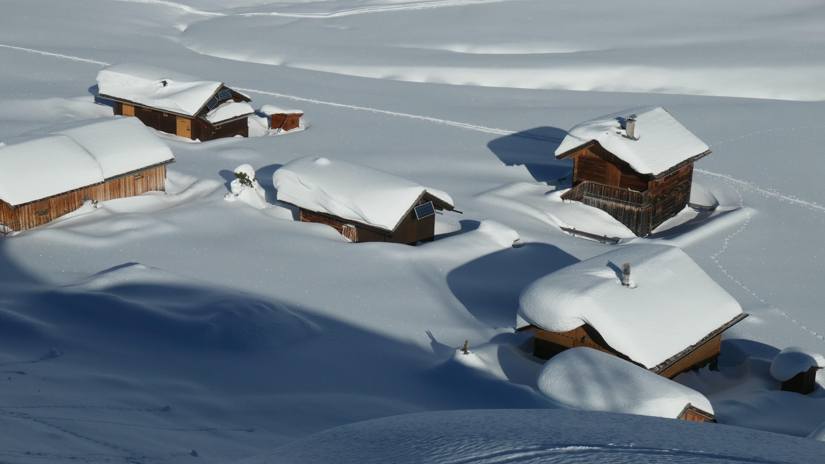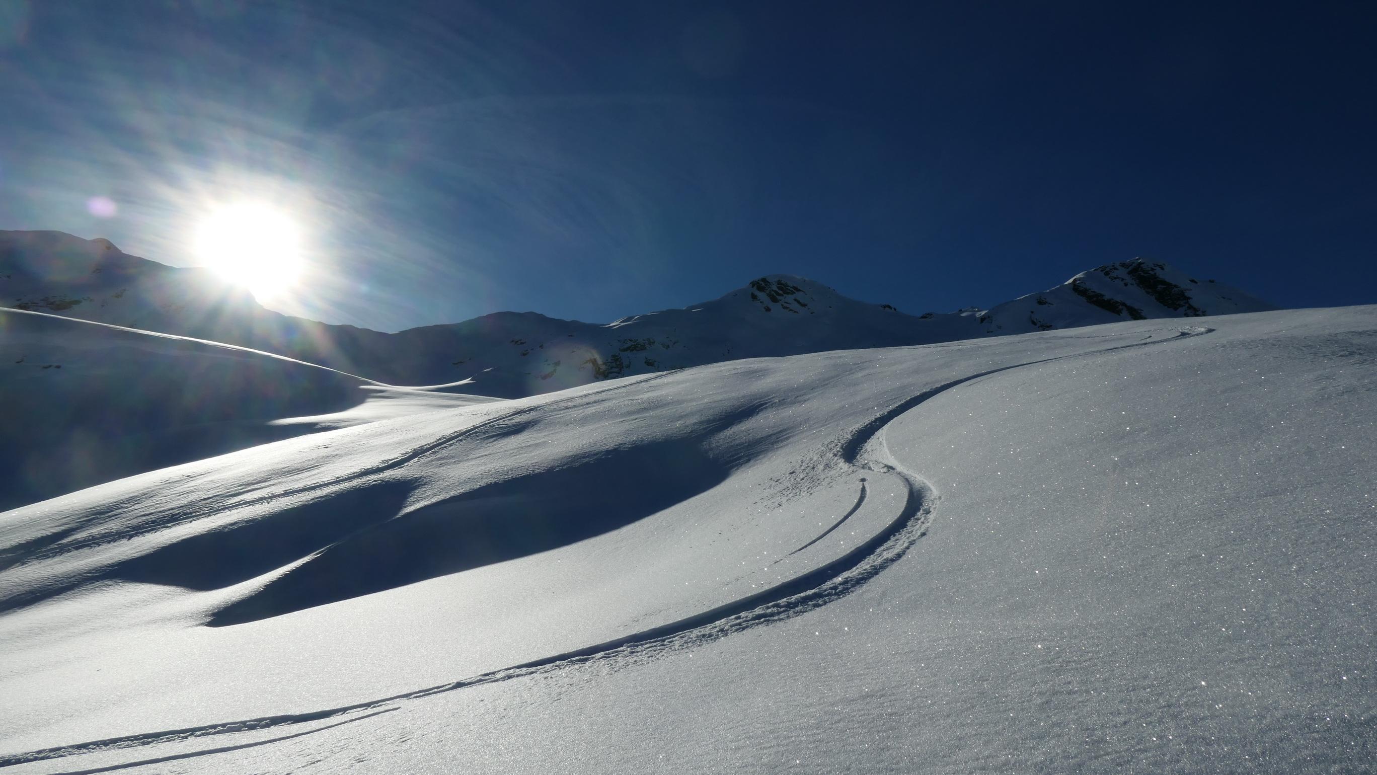 Aufgrund der ziemlich hohen Schneelage ist die Straße zur Zeit nur bis zum Kraftwerk geräumt. Ab hier führt dann eine gut angelegte Spur hinauf bis zur Staller Wölla. Durchgehend fanden wir eigentlich wirklich gute Schneebedingungen vor und sogar der zuerst etwas mühsam aussehende Waldgürtel war im Endeffekt kein Problem. Oberhalb der Wölla fanden wir nahezu perfekte Bedingungen vor, wo noch viel Platz für neue Spuren ist. Lawinentechnisch konnten wir keine besonderen Merkmale erkennen. Allerdings hat sich ab einer Höhe von ca. 2300m ein mehrere cm dicker Oberflächenreif gebildet, welcher bei Neuschnee eventuell zu einem Problem werden könnte.