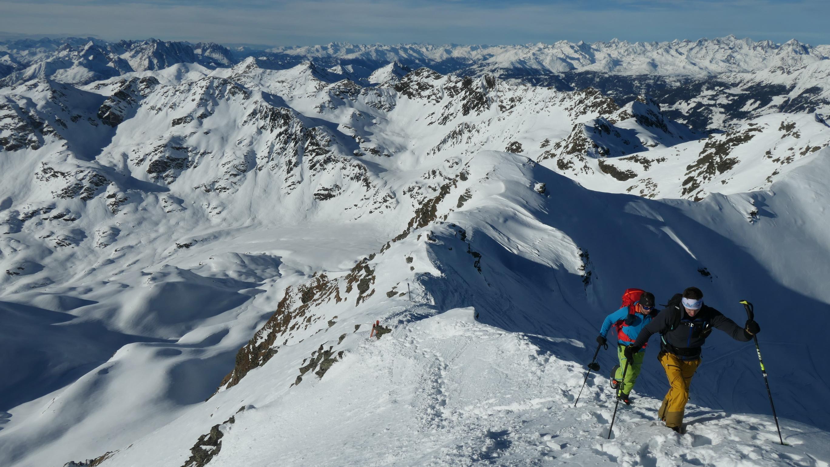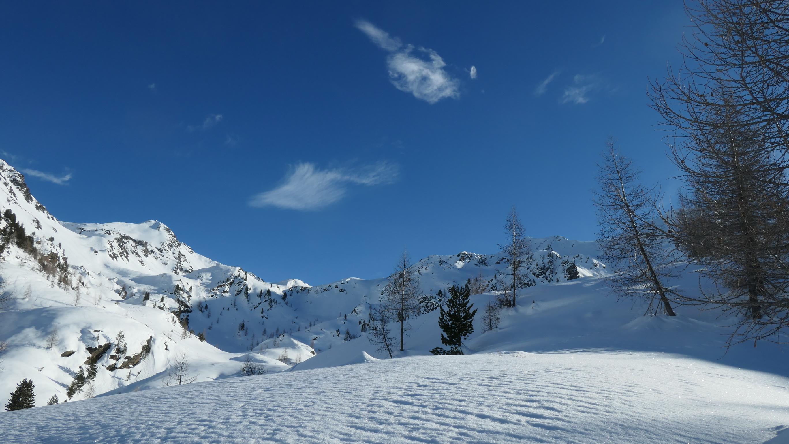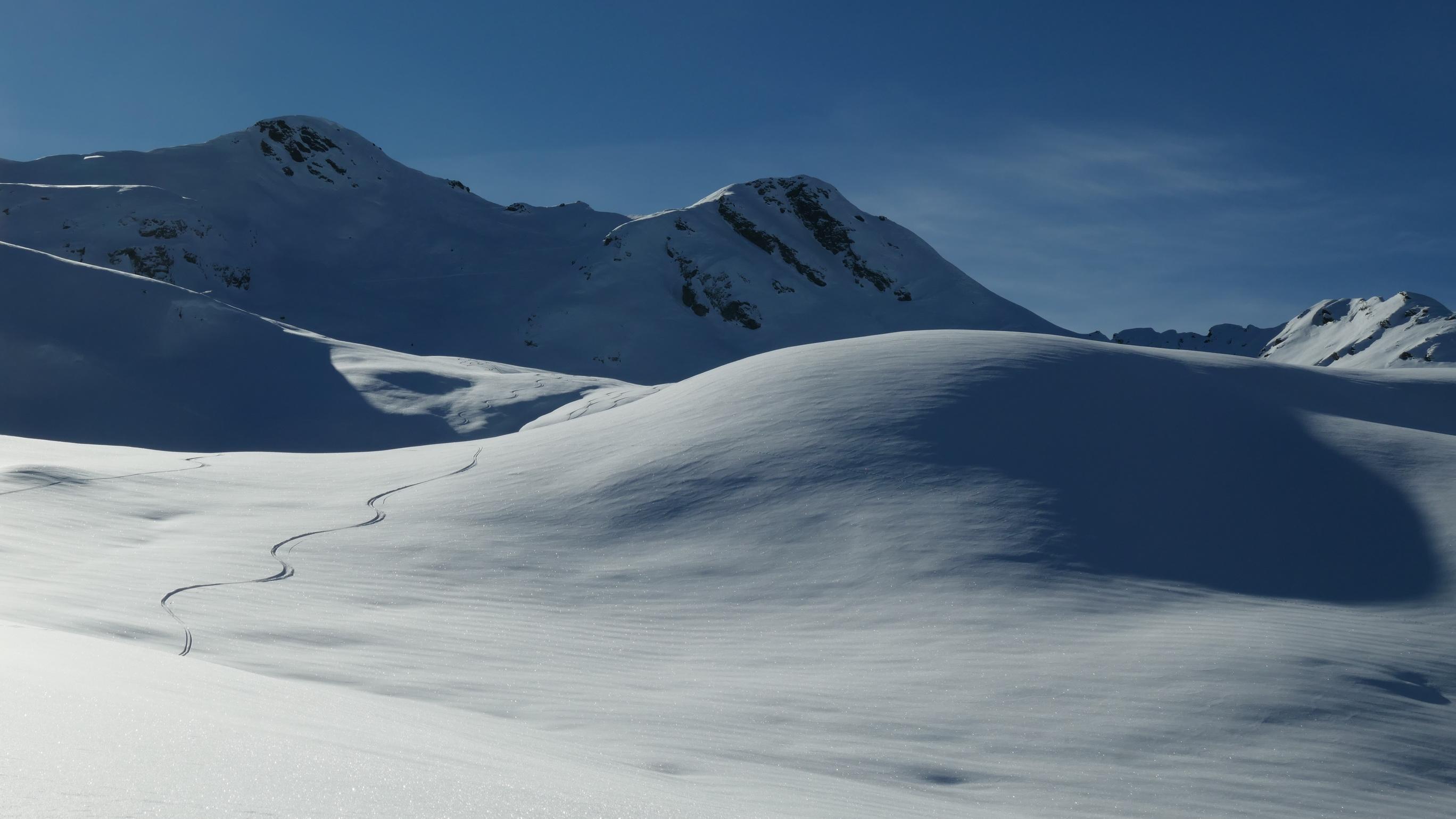 Aufgrund der ziemlich hohen Schneelage ist die Straße zur Zeit nur bis zum Kraftwerk geräumt. Ab hier führt dann eine gut angelegte Spur hinauf bis zur Staller Wölla. Durchgehend fanden wir eigentlich wirklich gute Schneebedingungen vor und sogar der zuerst etwas mühsam aussehende Waldgürtel war im Endeffekt kein Problem. Oberhalb der Wölla fanden wir nahezu perfekte Bedingungen vor, wo noch viel Platz für neue Spuren ist. Lawinentechnisch konnten wir keine besonderen Merkmale erkennen. Allerdings hat sich ab einer Höhe von ca. 2300m ein mehrere cm dicker Oberflächenreif gebildet, welcher bei Neuschnee eventuell zu einem Problem werden könnte.