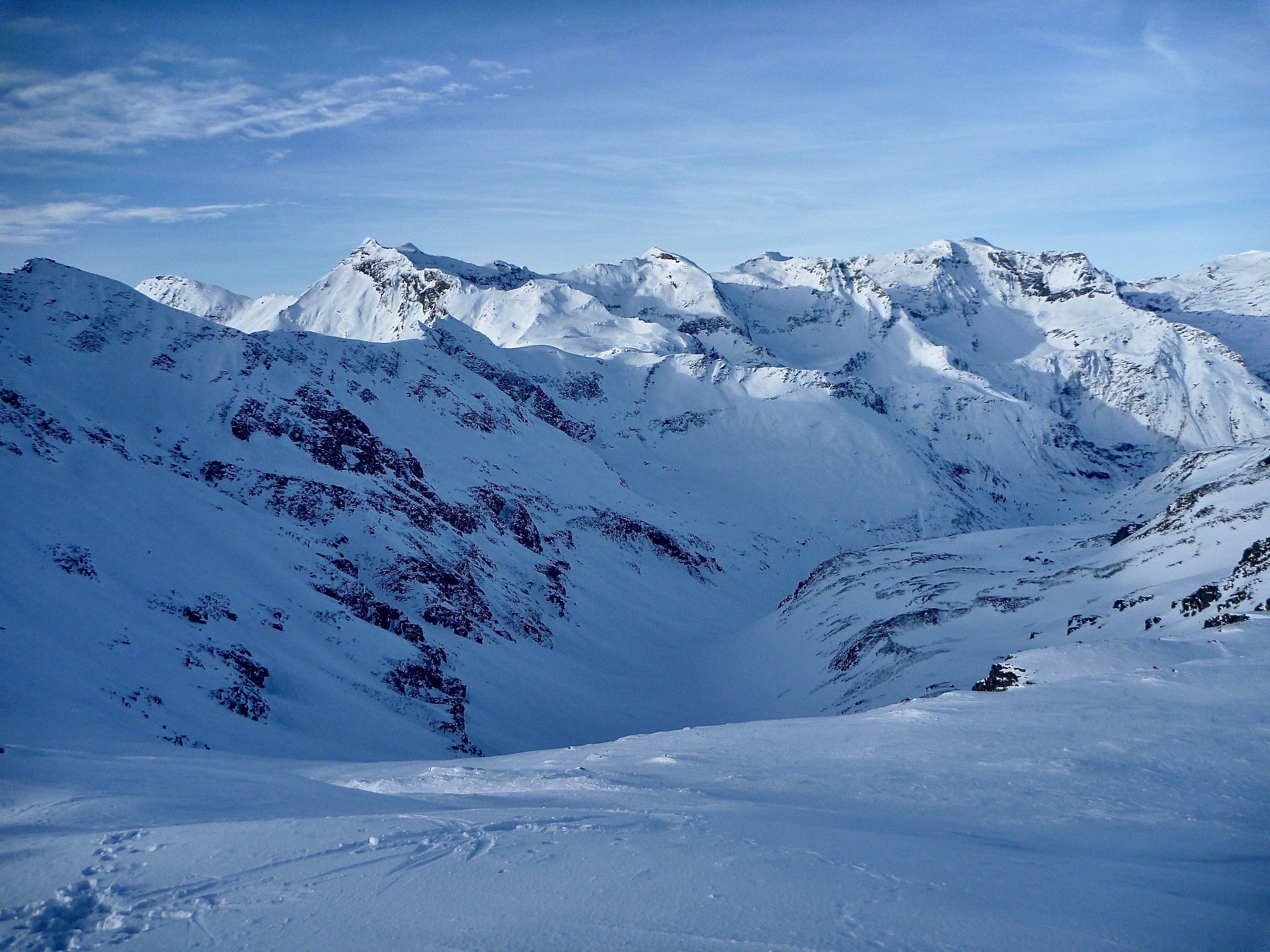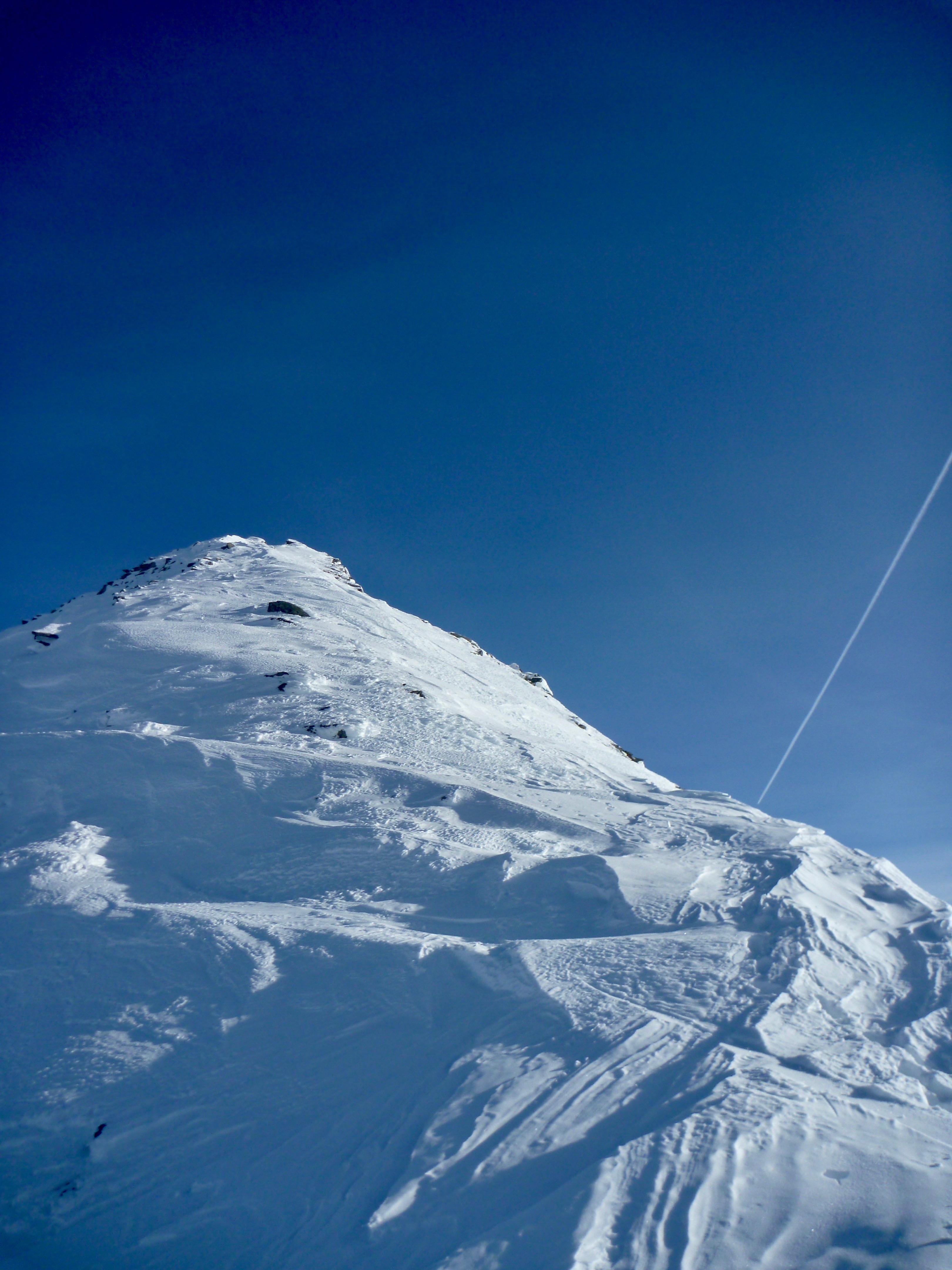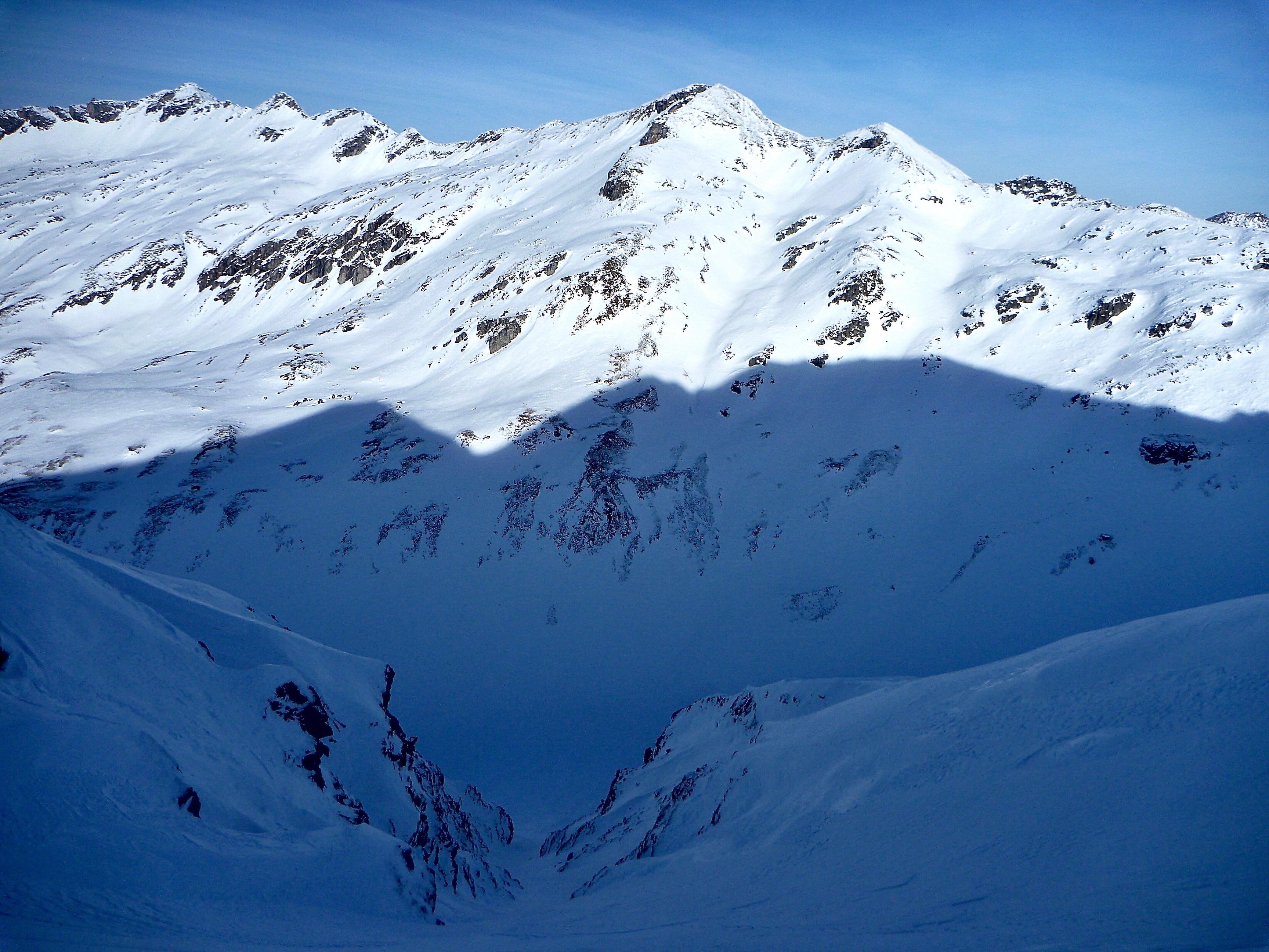 Schneeverhältnisse: super verfestigte Schneedecke, griffig bis hart v.a. in Wind- und Sonnenhängen, später in der Sonne soft, nicht tief. Nordseitig perfekter Stapfpulver, keine Steine. Einige alte Lawinenkegel, aktuell alles stabil.