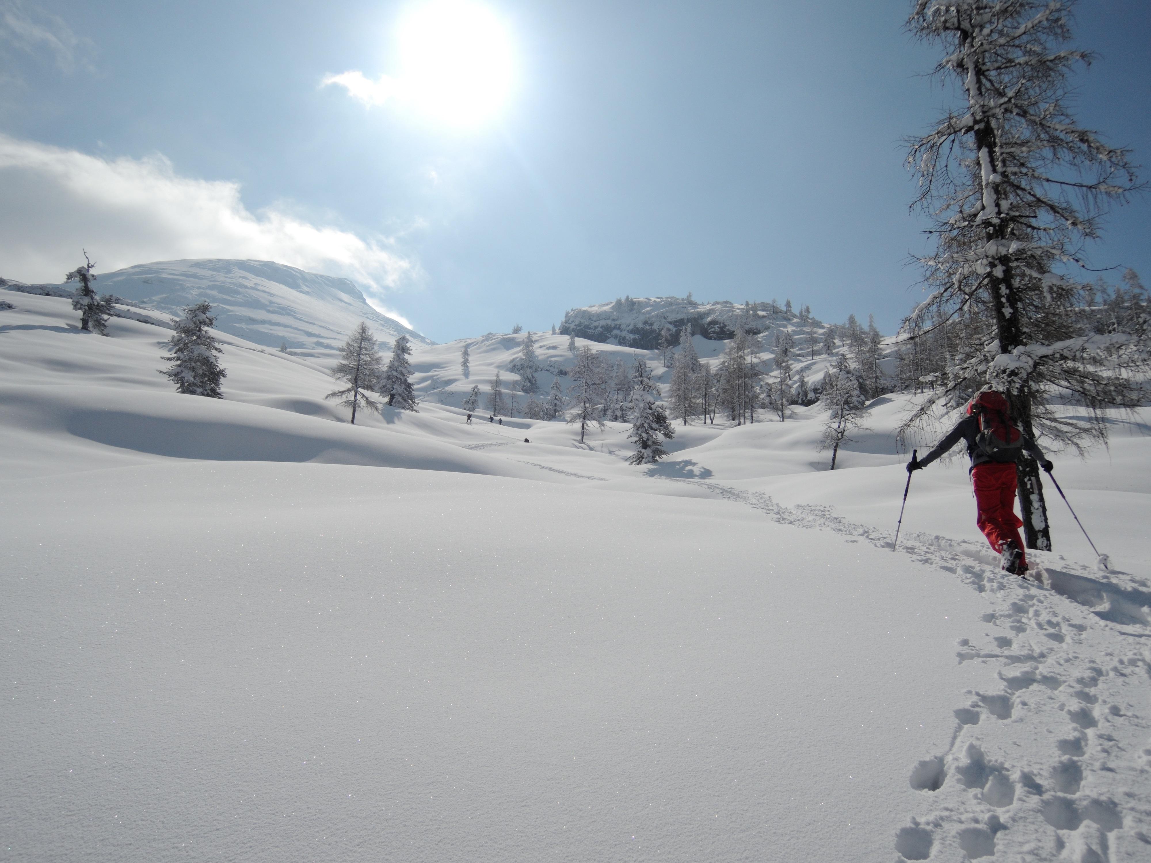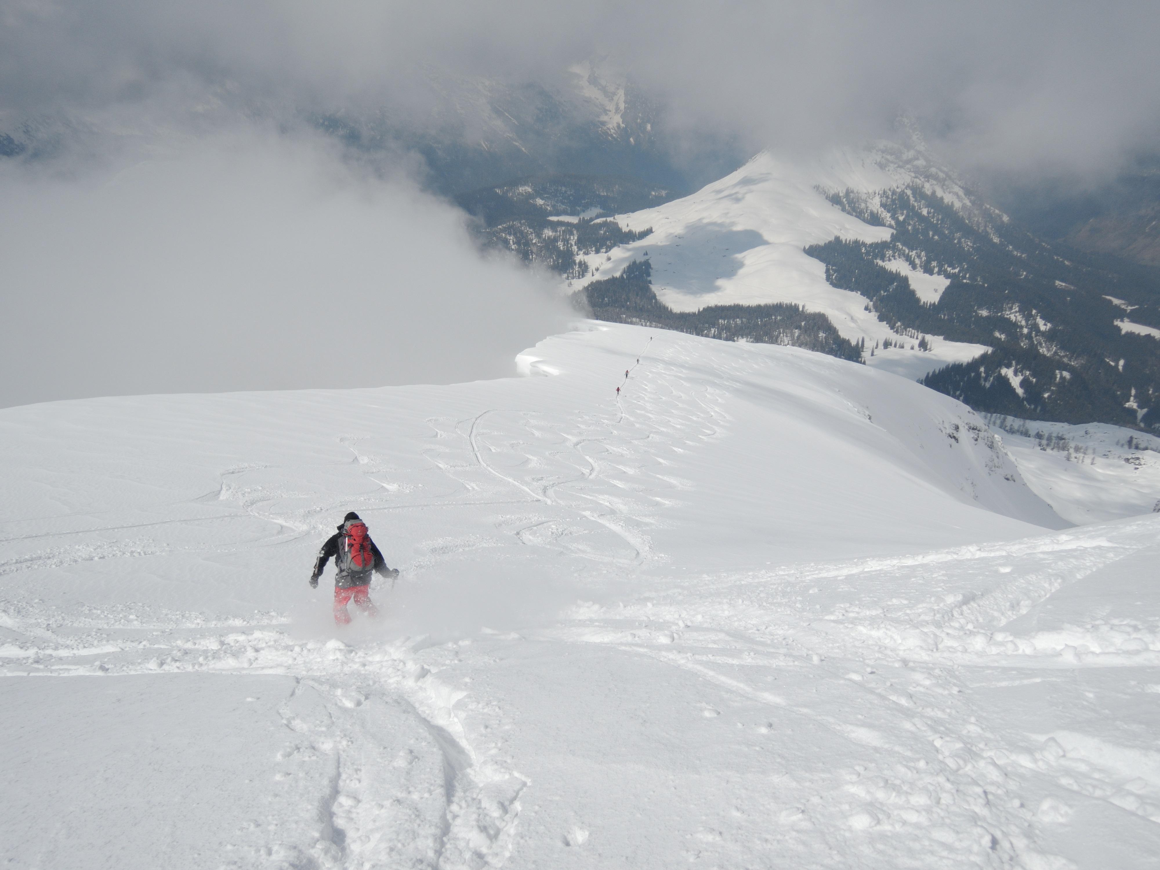 Ab den Almen ca. 40 cm Neuschnee. Zuerst noch feucht wurde die Qualität nach oben hin immer besser und trockener. Oberhalb der Waldgrenze dann schöner Pulver. Am Gipfelhang dann ca. 10 - 20 cm, ein wenig vom Wind abgetragen.
