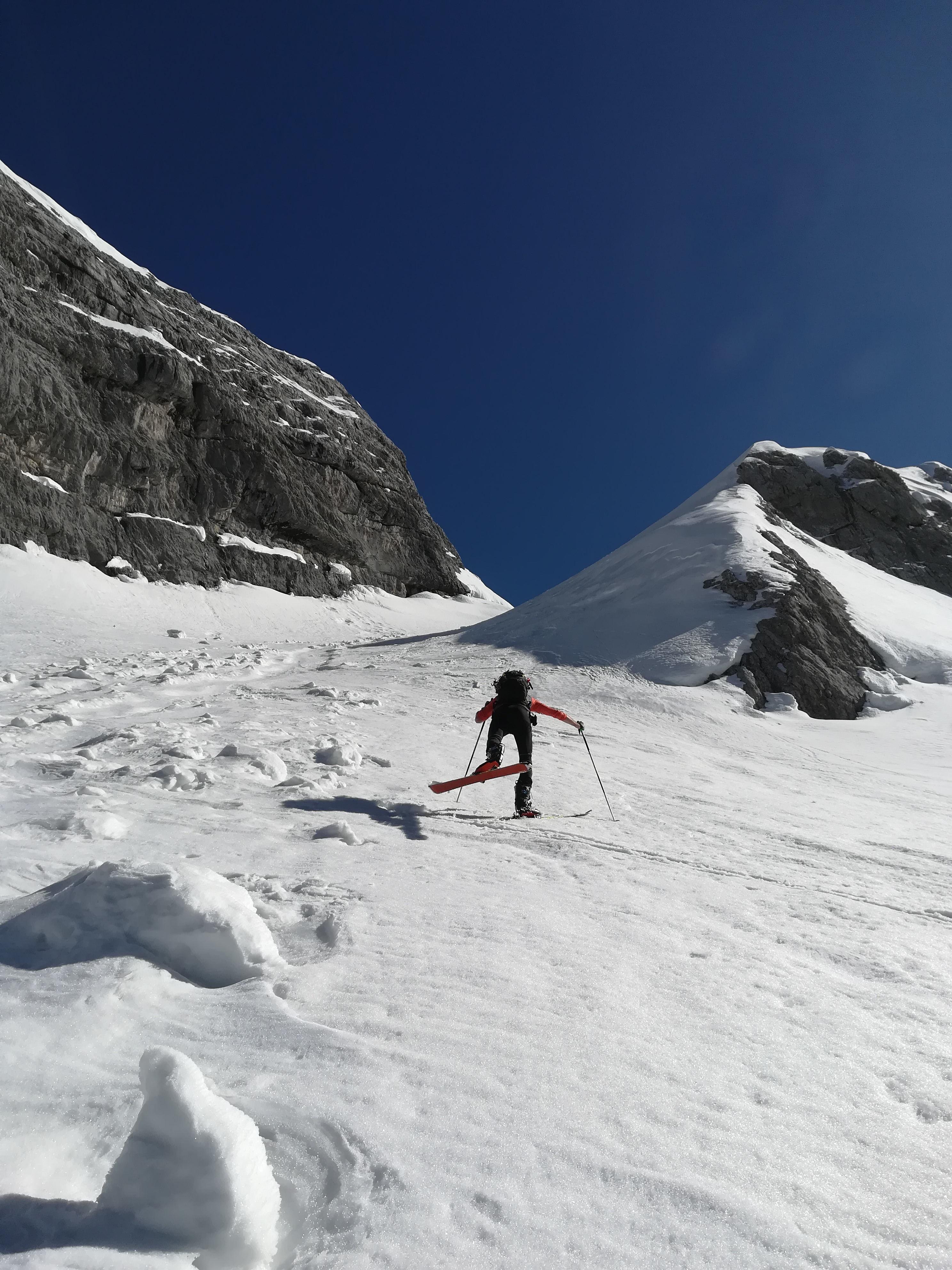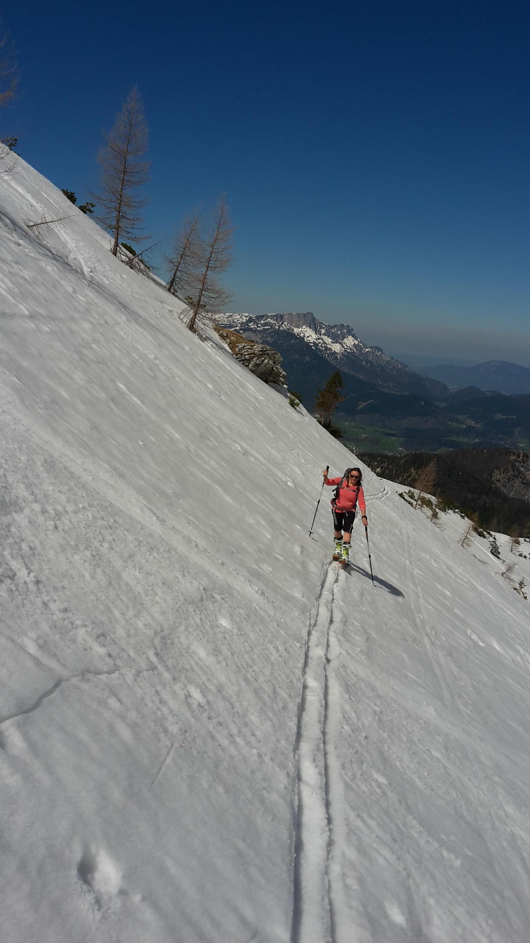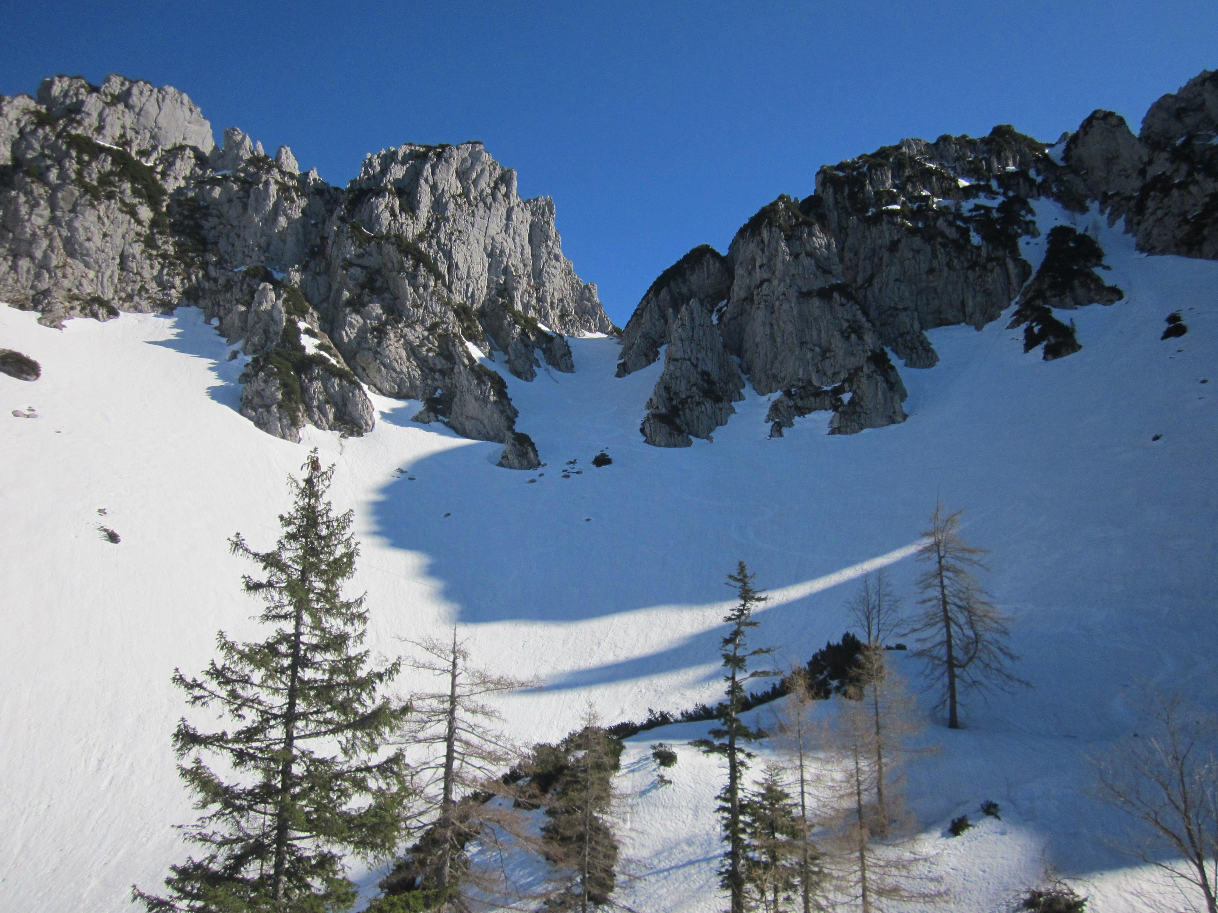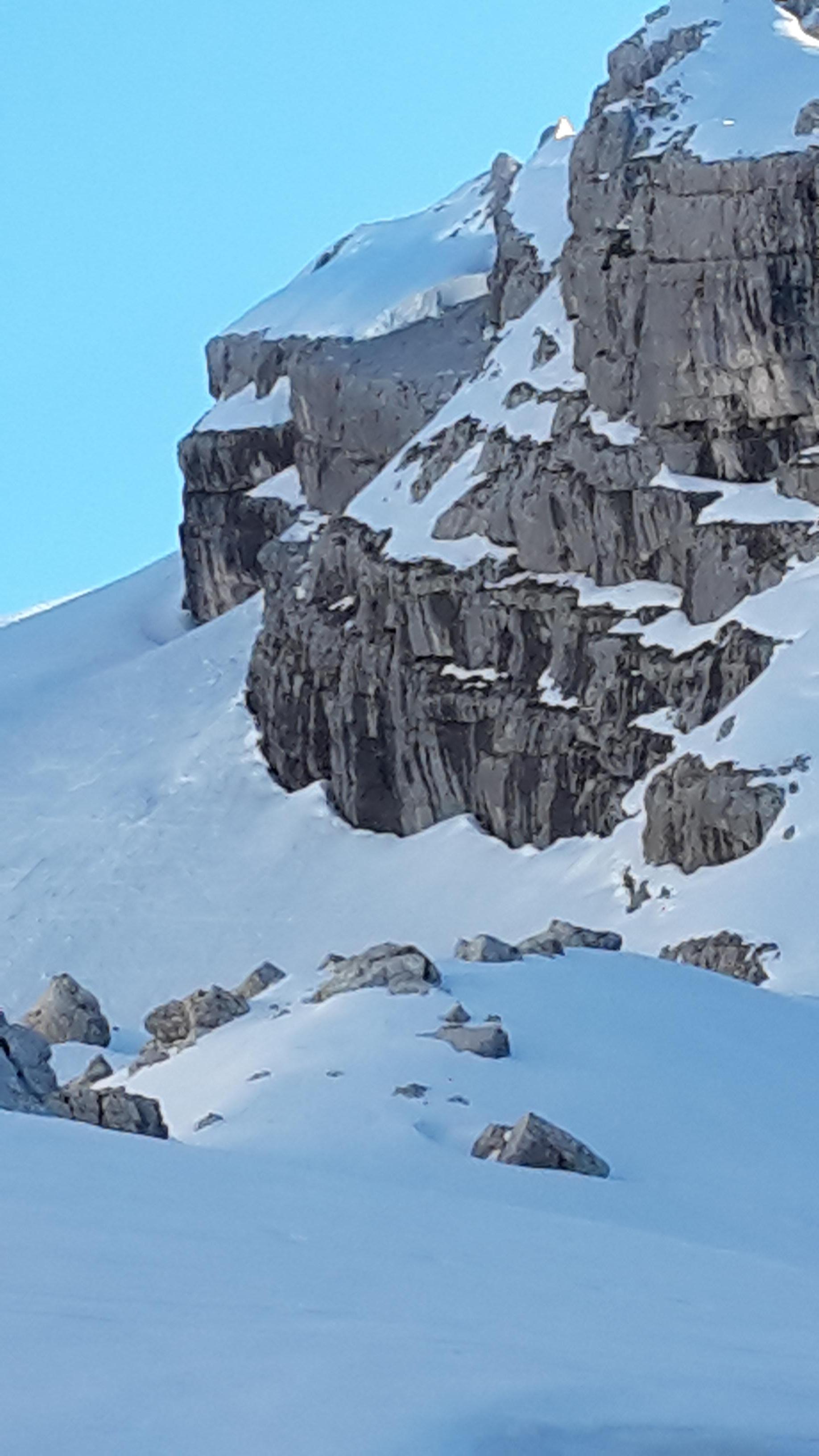 Was ich für wichtig halte: Watzmannfrau, erstes, zweites und viertes Kind haben auf ihren Platten noch sehr viel Schnee. Wenn der großflächig runter kommt, dürfte die Lawinenbahn sehr breit und lang sein. Wir sind daher im großen Abstand zur Frau rauf und an der Jungfrau rechts abgebogen.