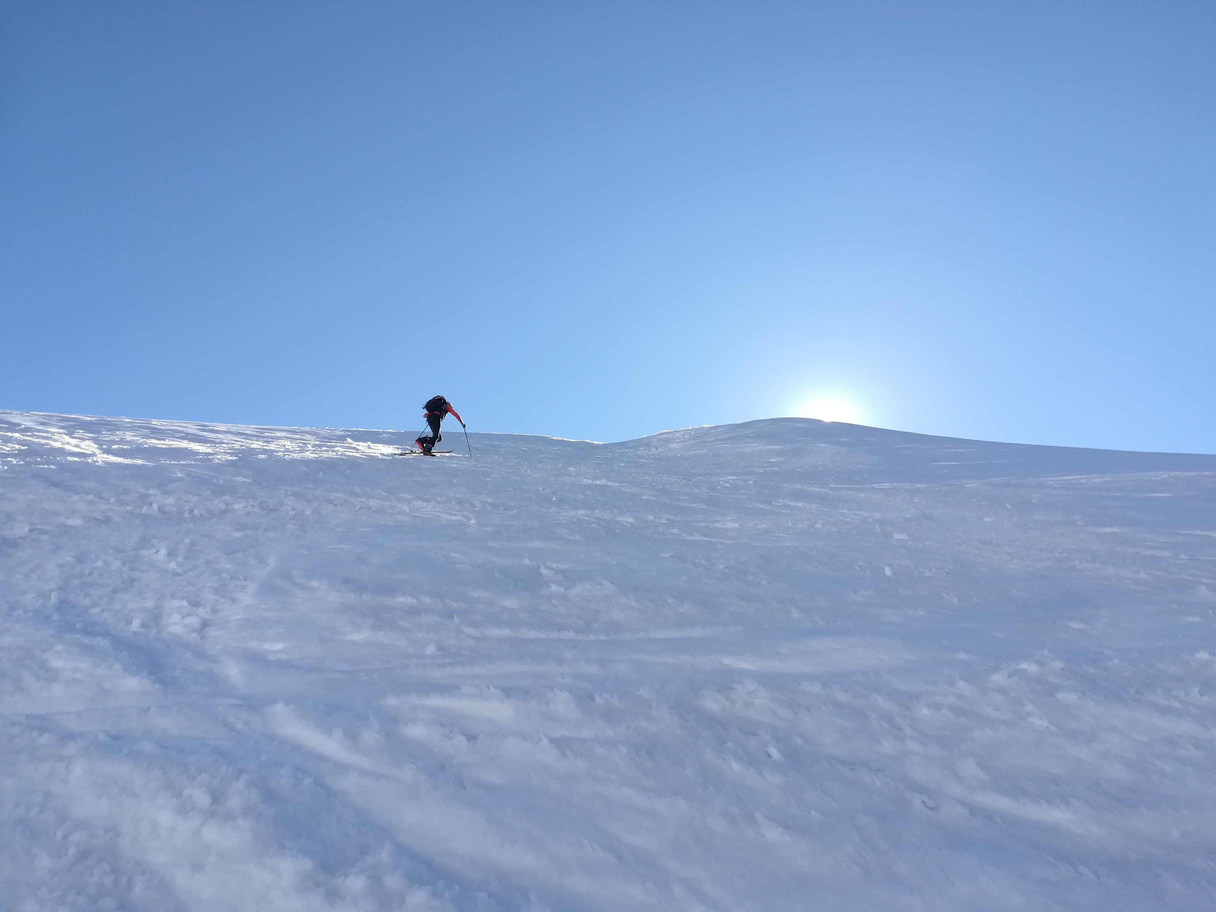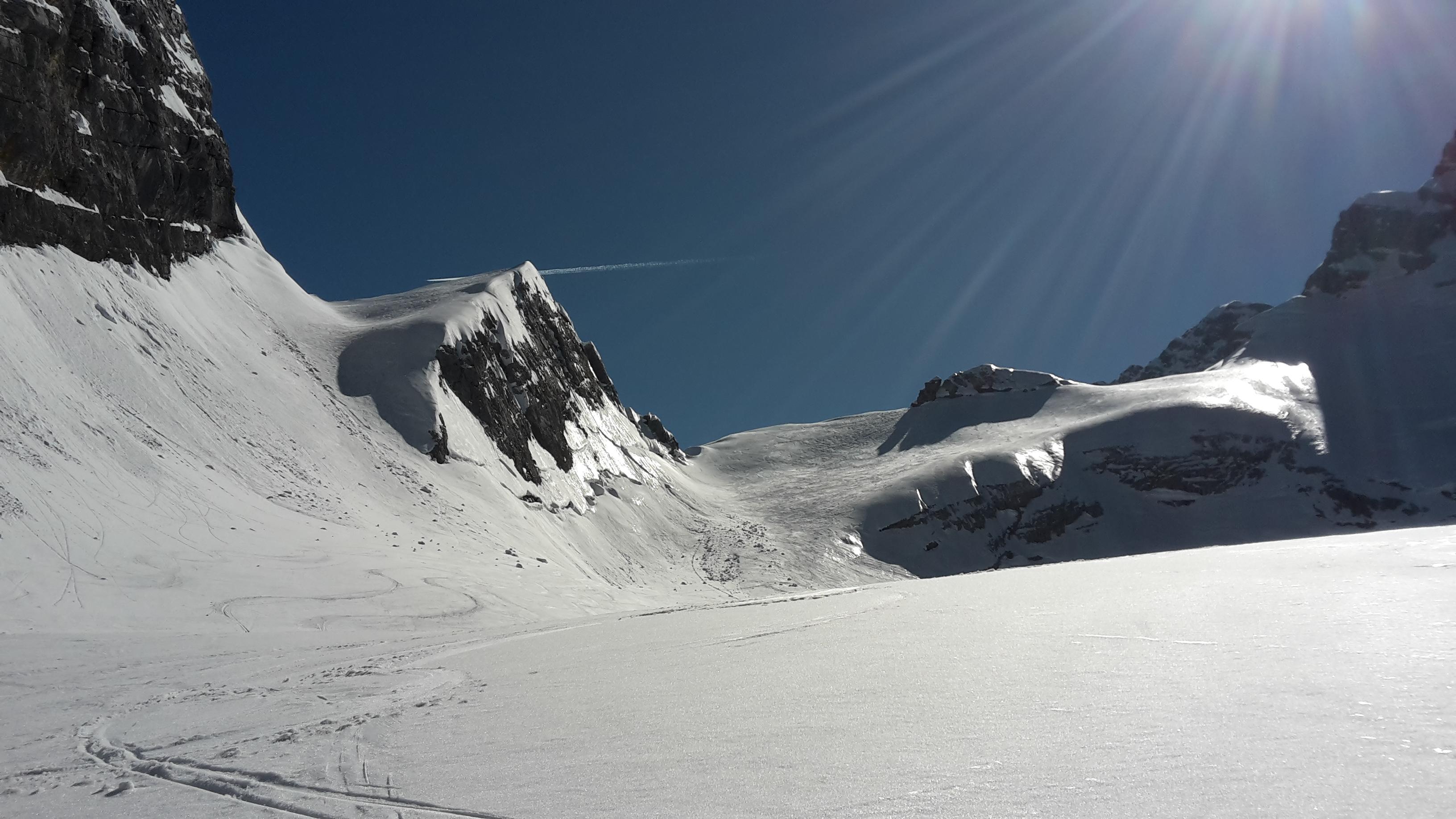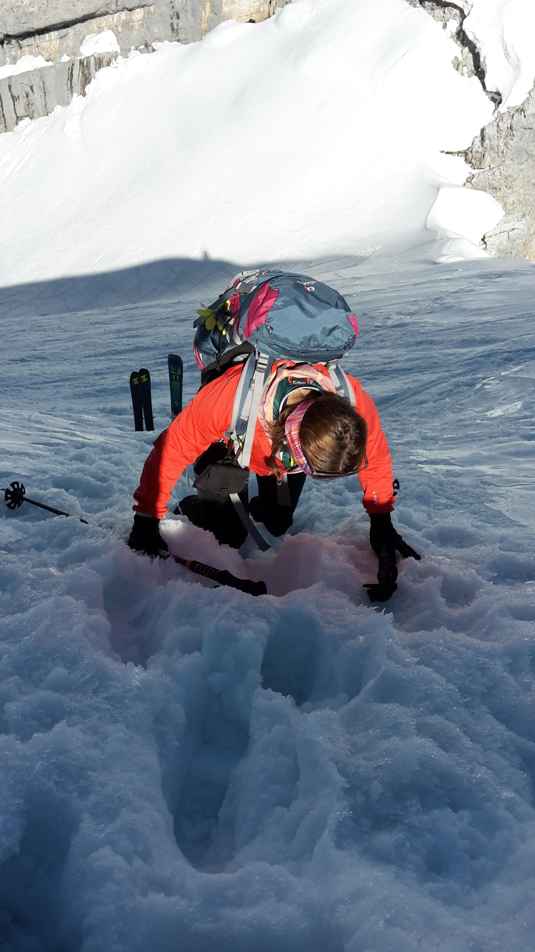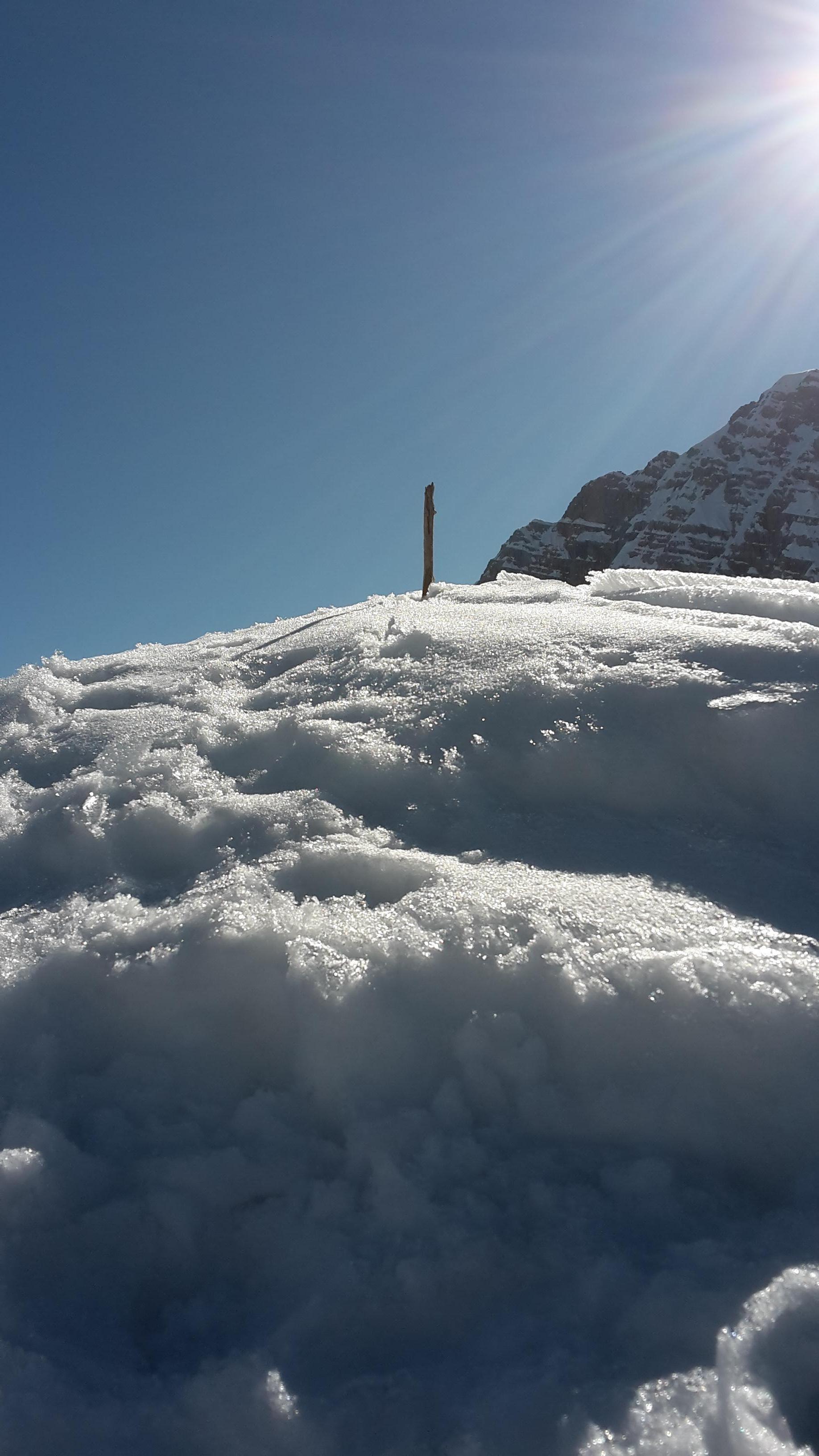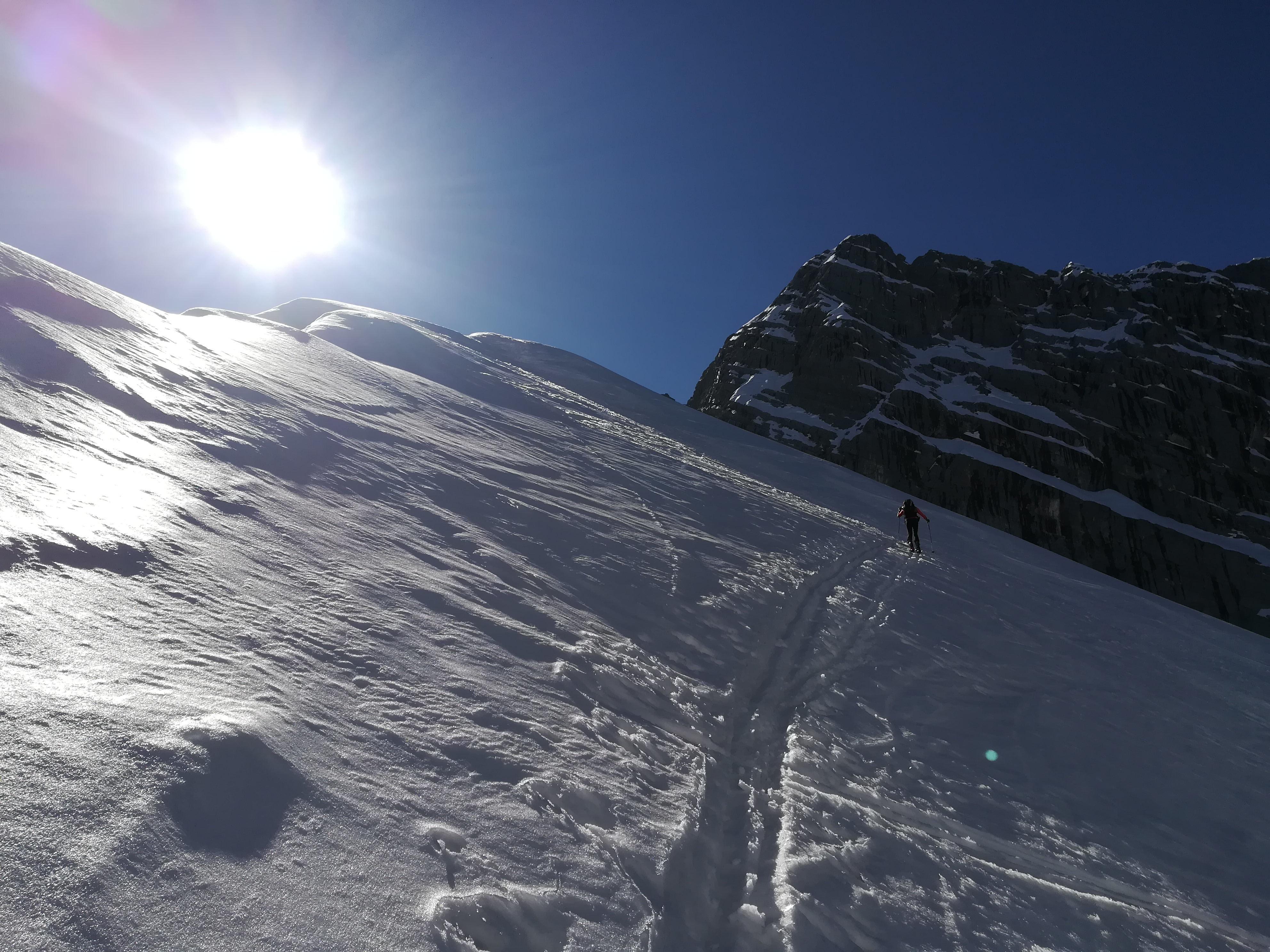 Was ich für wichtig halte: Watzmannfrau, erstes, zweites und viertes Kind haben auf ihren Platten noch sehr viel Schnee. Wenn der großflächig runter kommt, dürfte die Lawinenbahn sehr breit und lang sein. Wir sind daher im großen Abstand zur Frau rauf und an der Jungfrau rechts abgebogen.