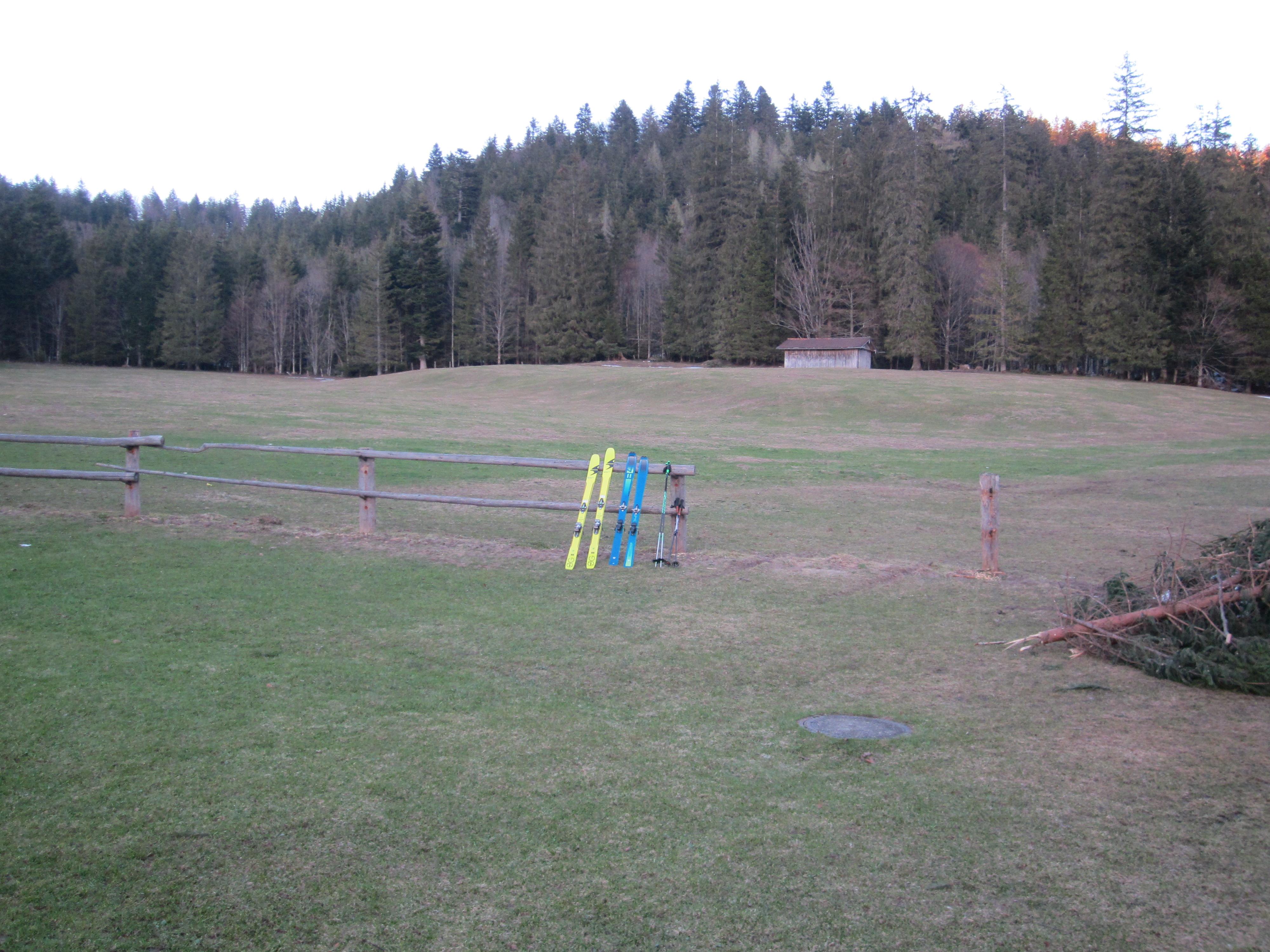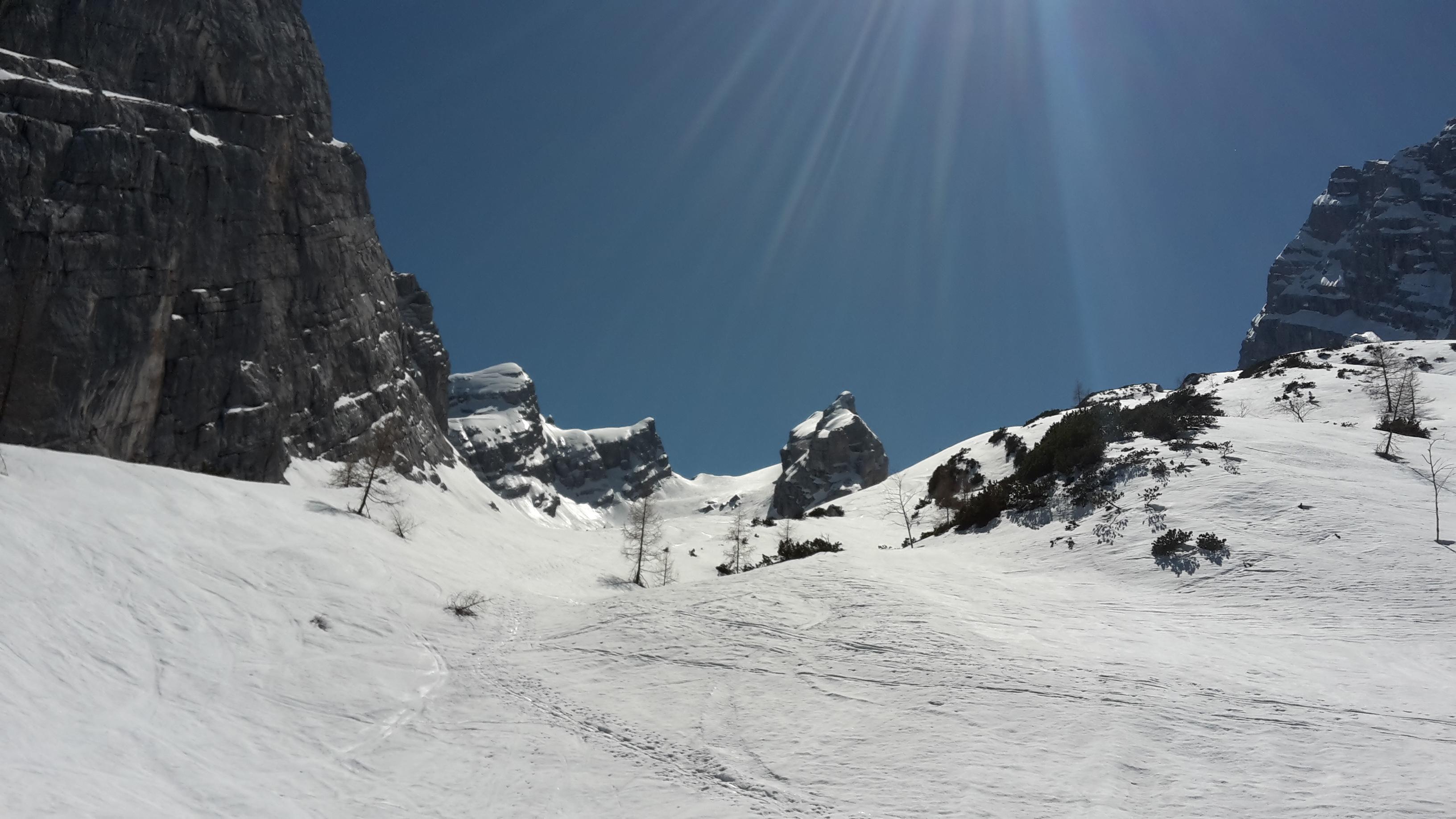 Watzmannkar, 5. Kind. Schneller Start - in 19 min bis zur Benzinkurve. Also fiktiver Start schon vor 12:00 Uhr :-). Auch hier ähnliche Verhältnisse. Bis ins Kar Sommerfirn, im Wald Piste, ab Baumgrenze bis zum Gipfel ca. 5 cm Firn.