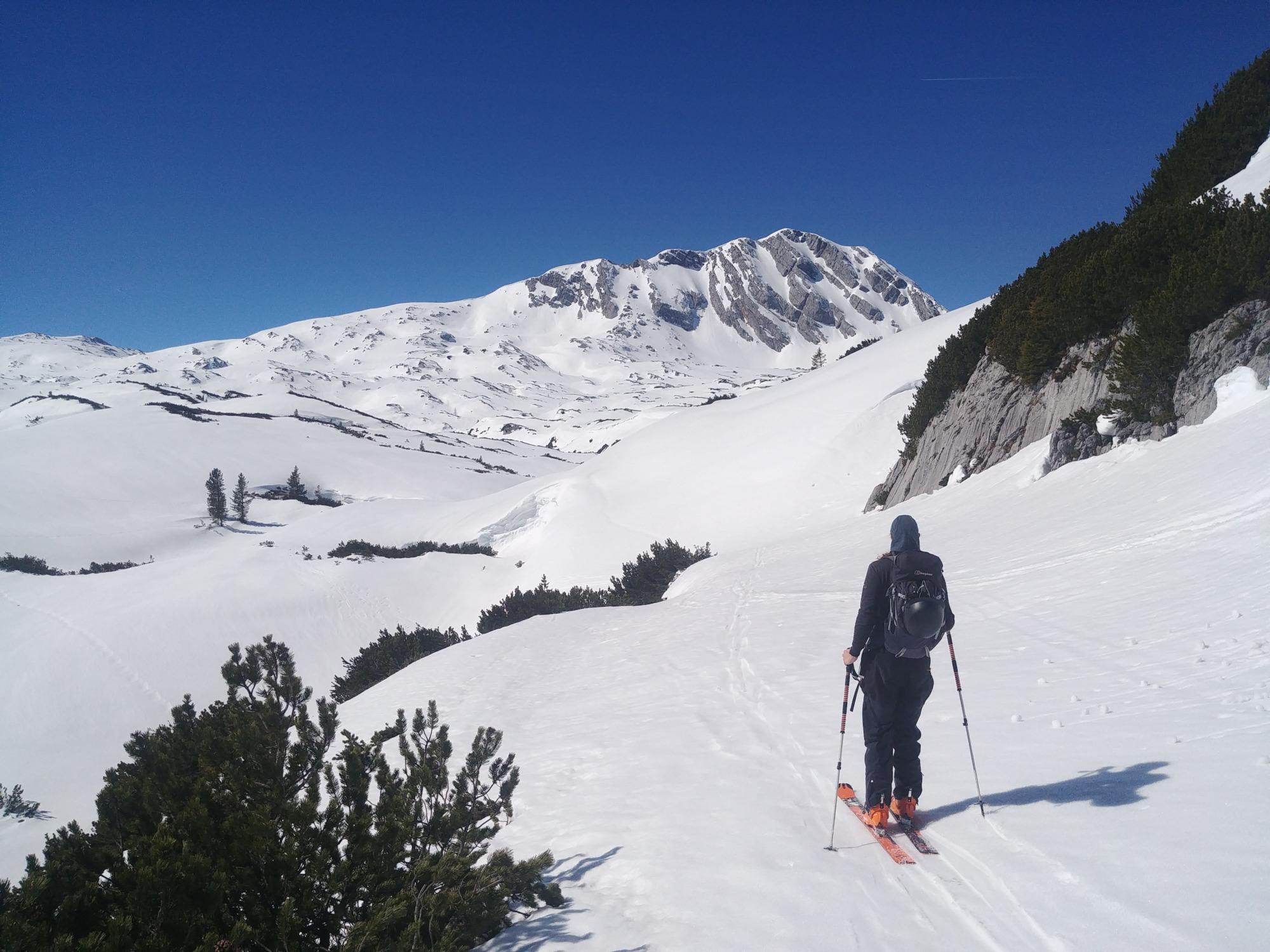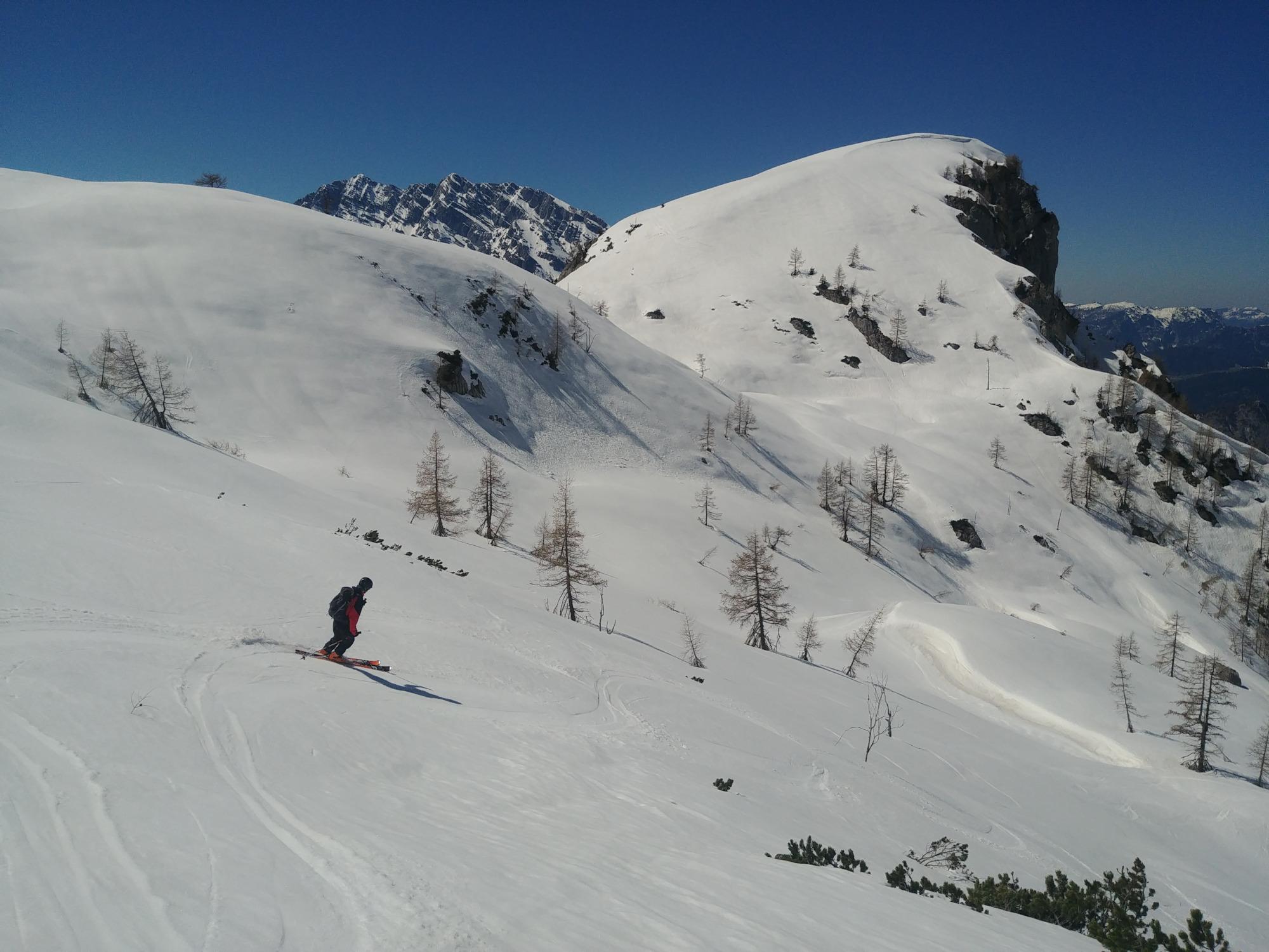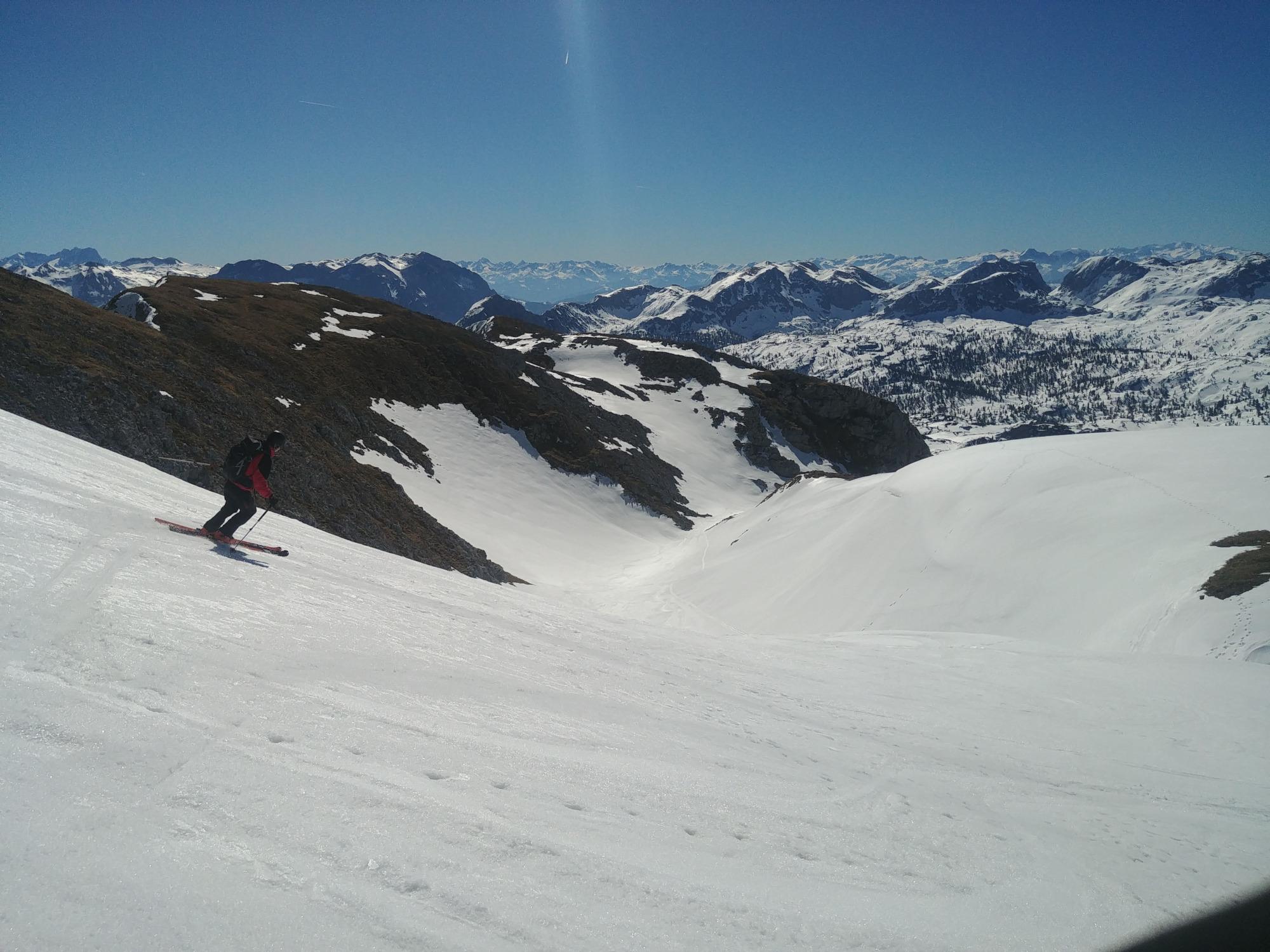 Nach um 7 Uhr erreichen wir um halb zehn den Schneibstein, von dort runter in die Schlum bei gutem Firn mit wenigen harten Anteilen. Nach etwas gemütlicher Hatscherei am Plateau durch die endlose Einsamkeit dann der Kahlersberggipfel um 12 herum - hier wieder erste wenige Tourengeher nach der Menschenleere der Schlum.