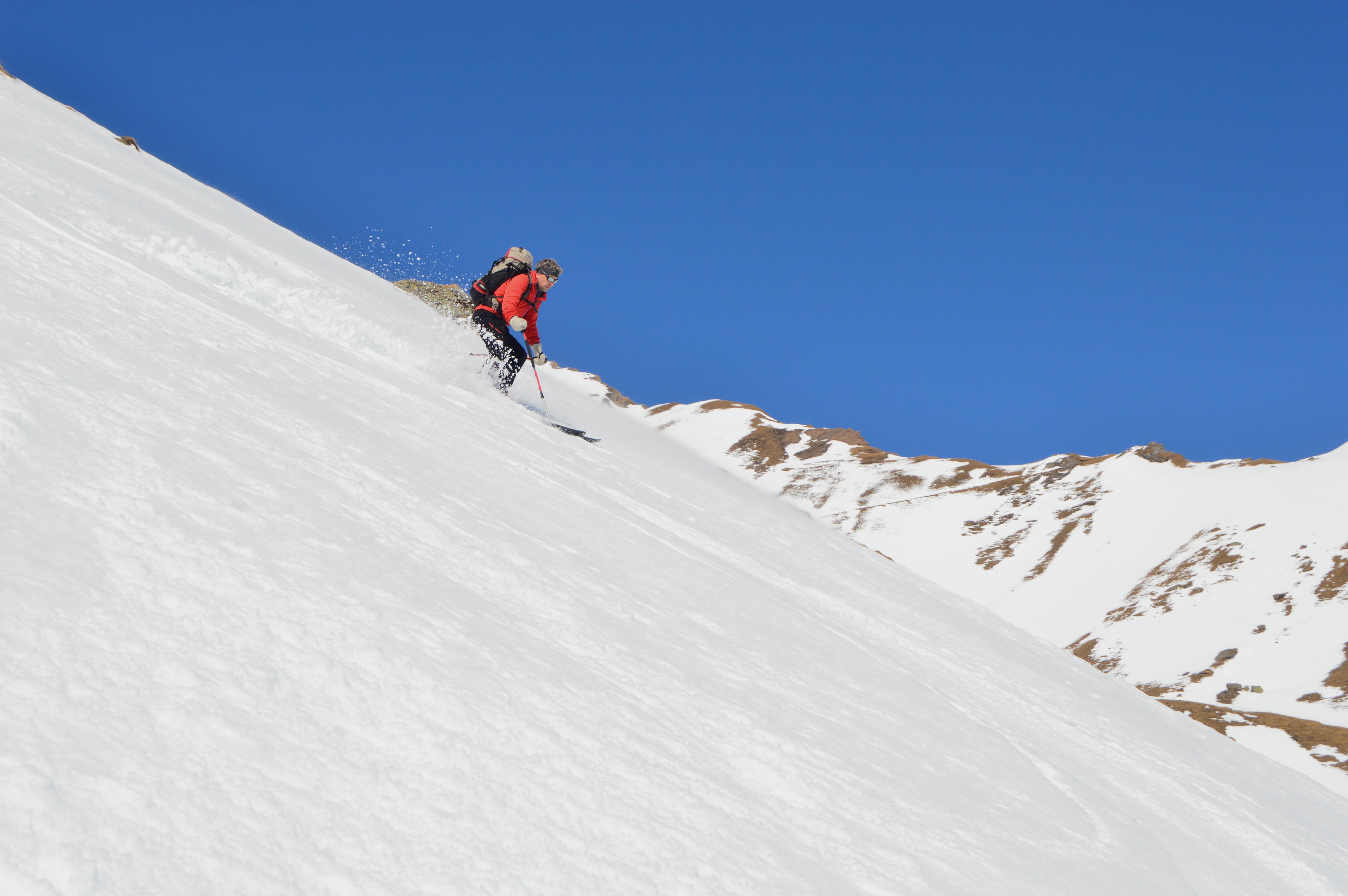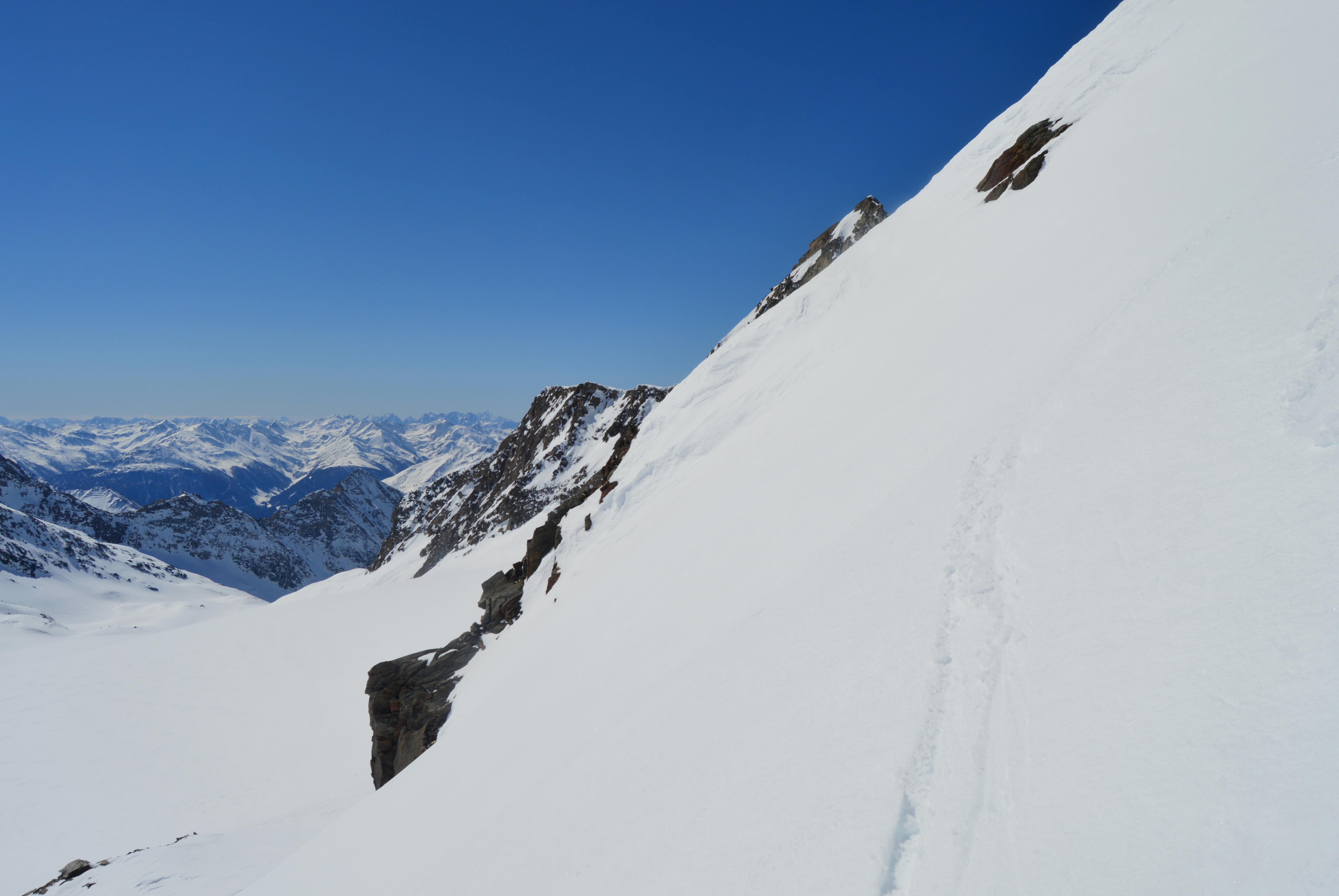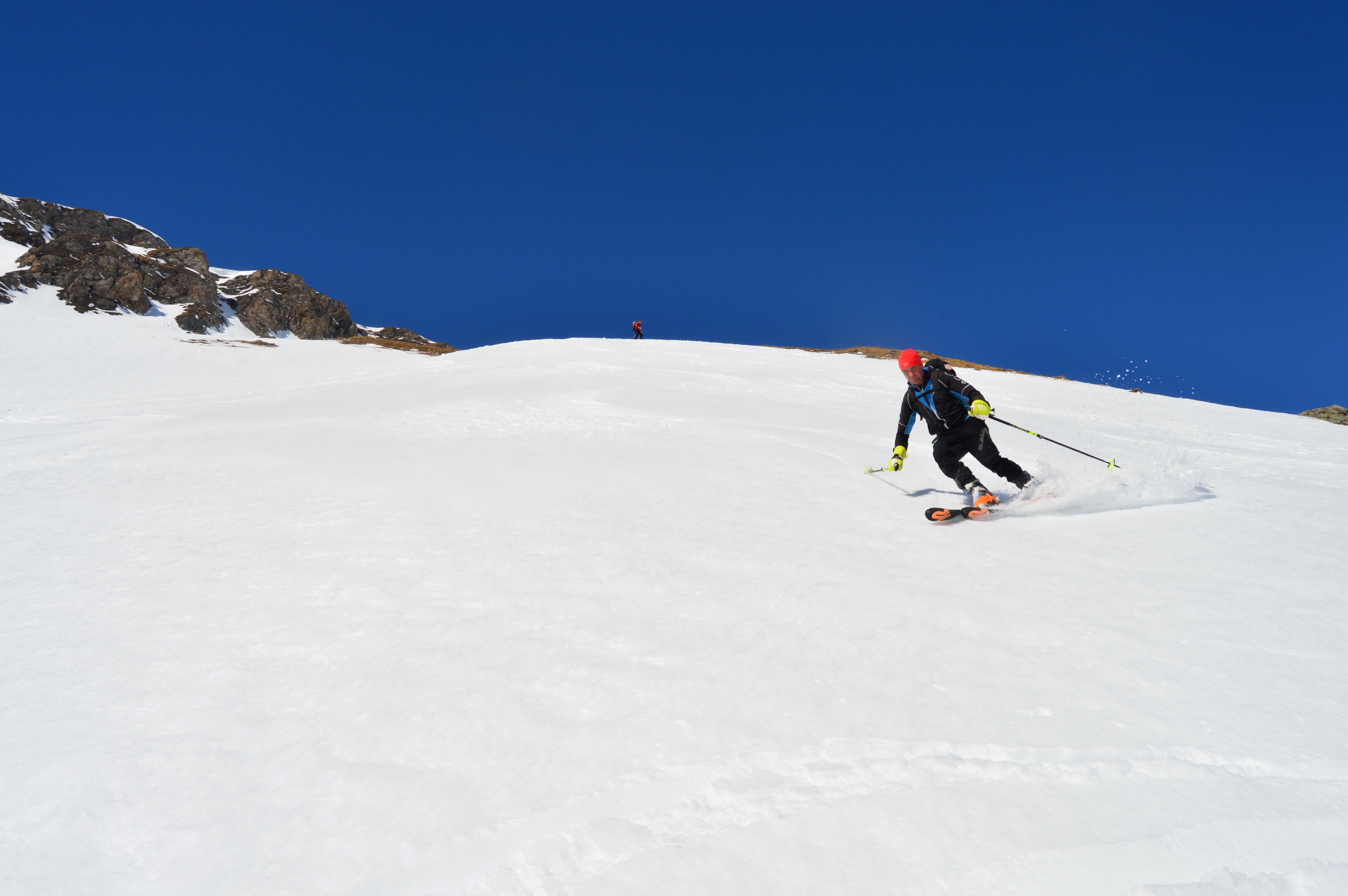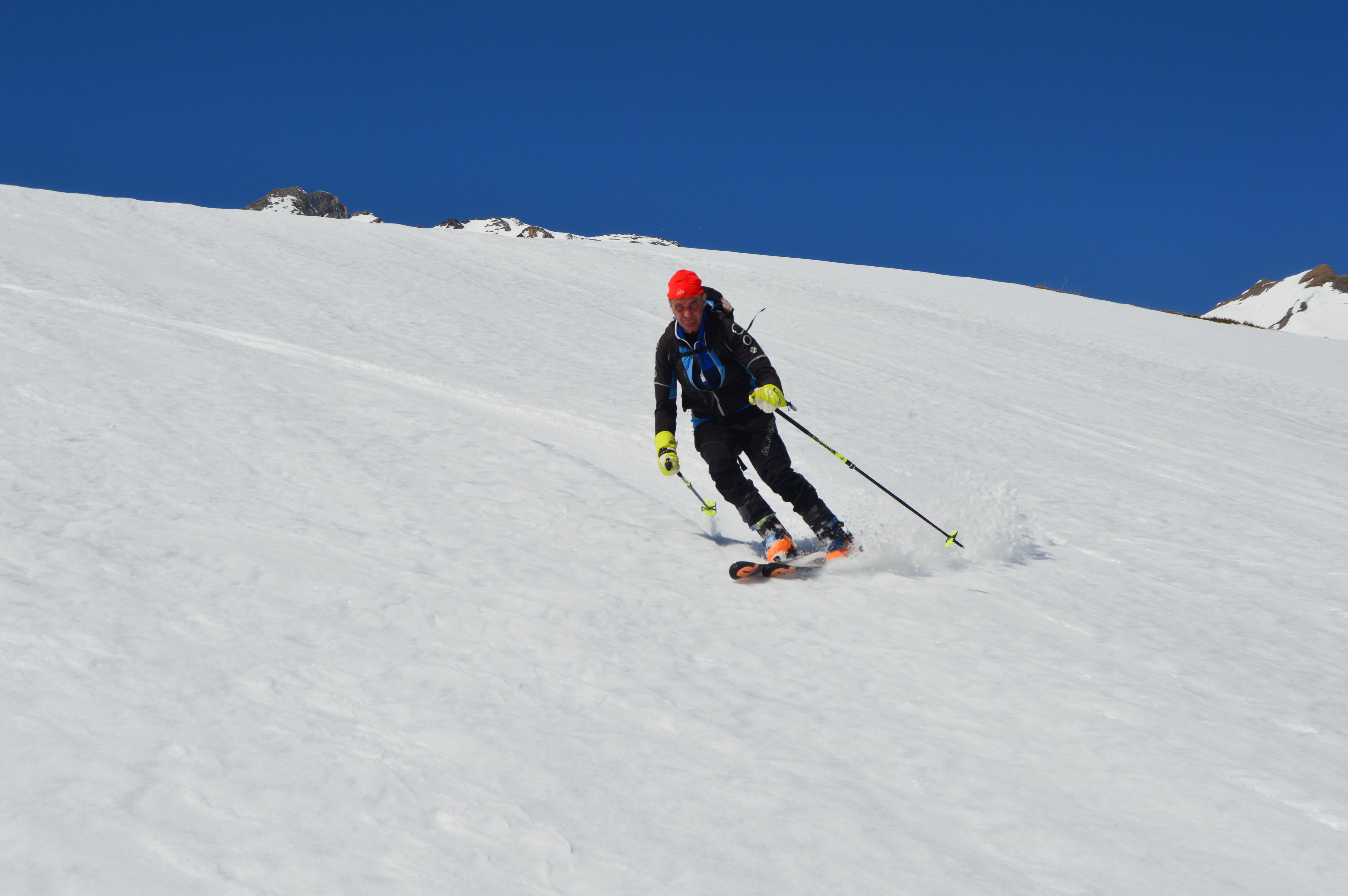 Strahlend blauer Himmel, wieder Wind am Gipfel. Die 40 Grad steile Flanke unterm Gipfel war wieder hart, danach gab´s perfekten Firn über endlose Hänge.