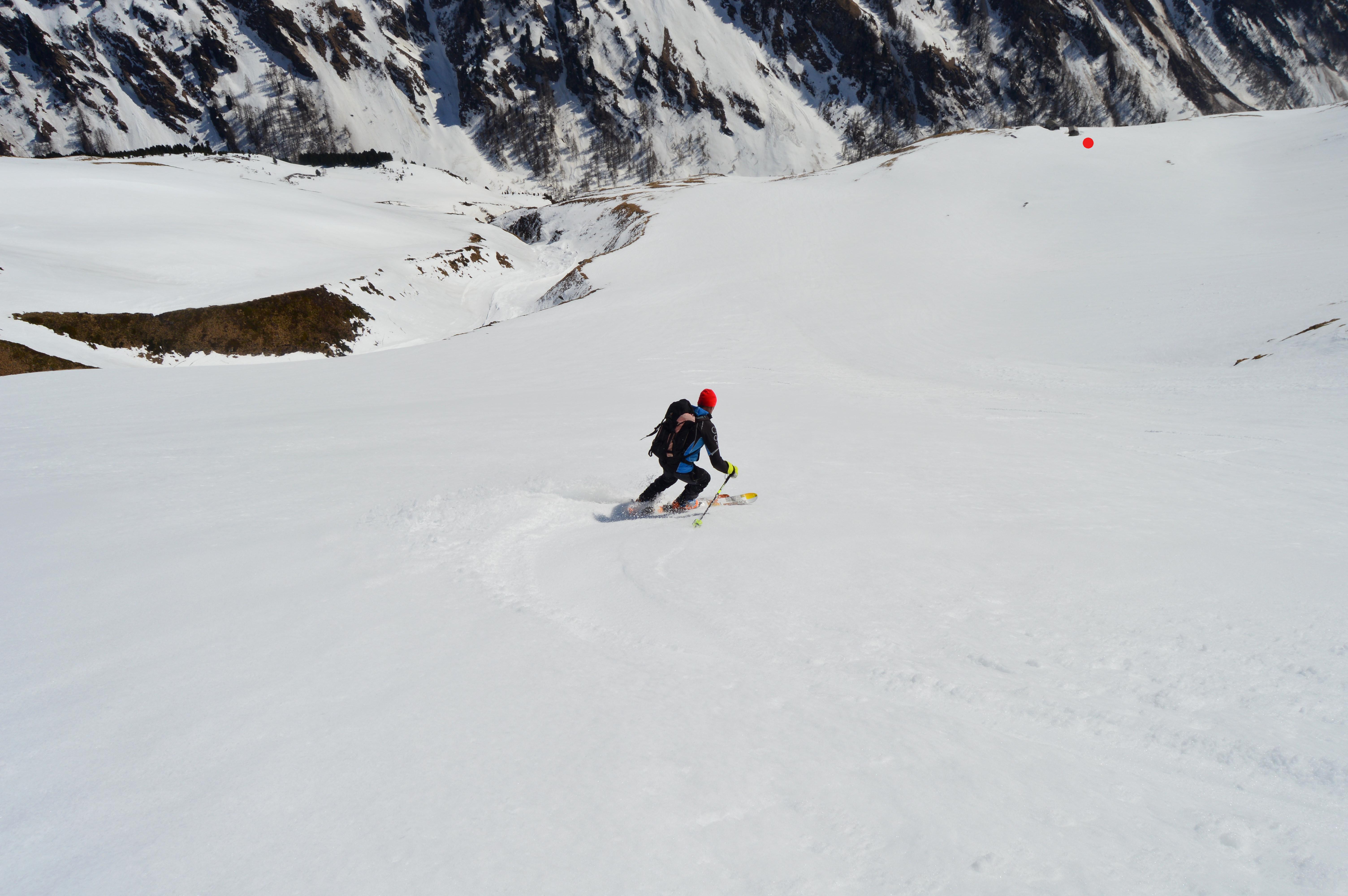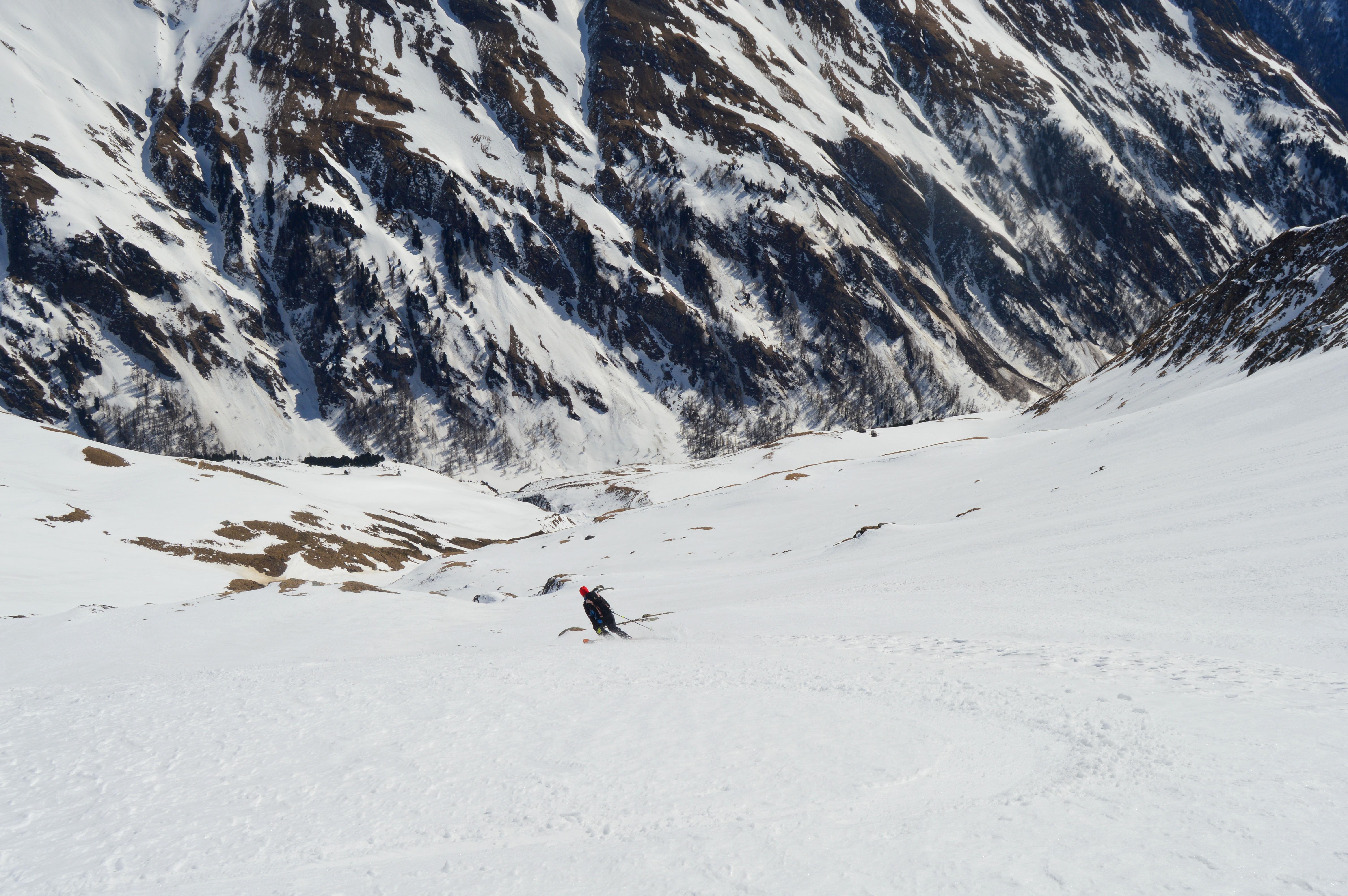 Das Dorfertal kann noch komplett mit Ski begangen werden. Ein oder zwei Lawinenkegel mit ziemlich viel Dreck und Steinen könnte man eventuell bei der Abfahrt zu Fuß überwinden.