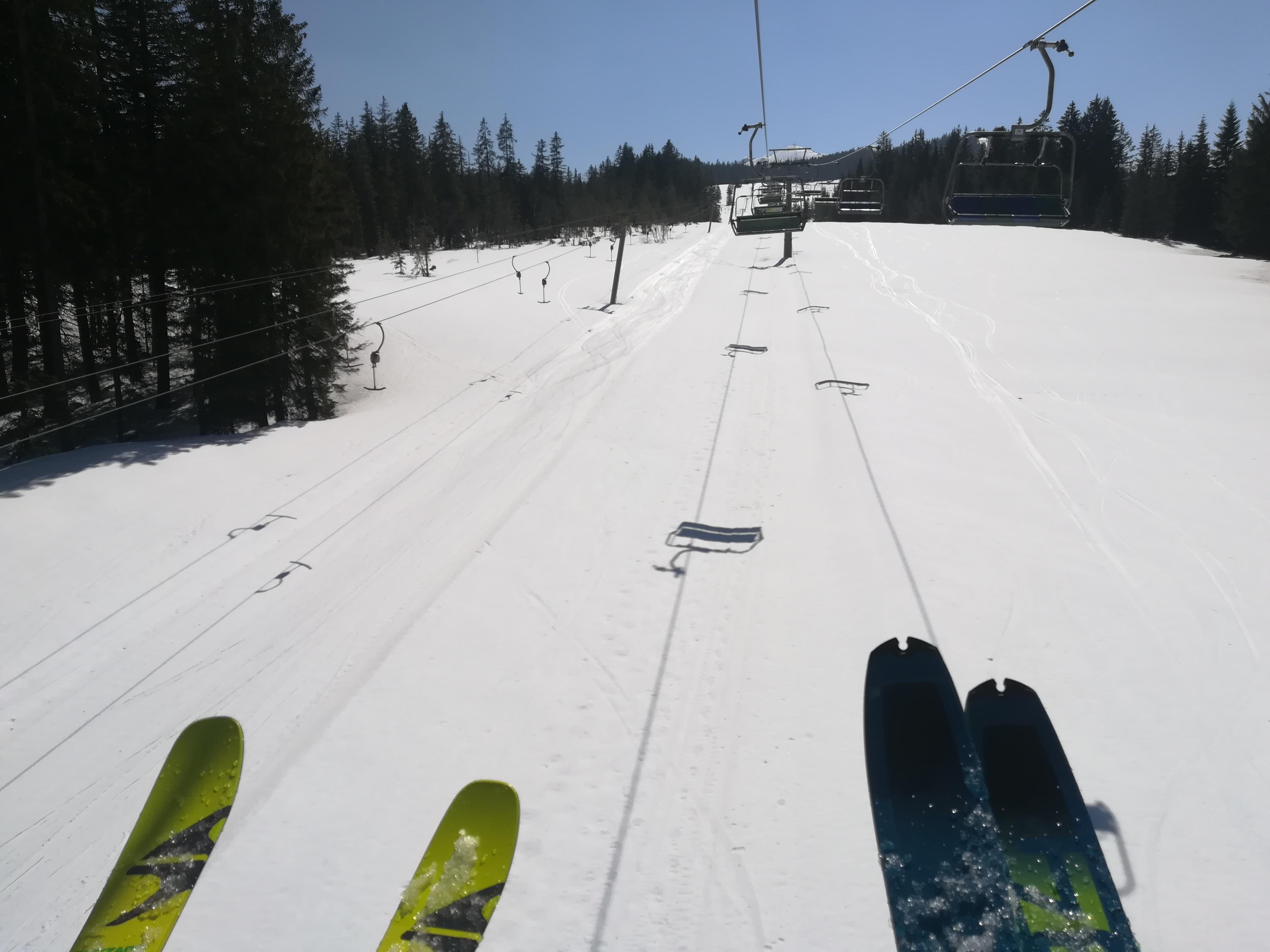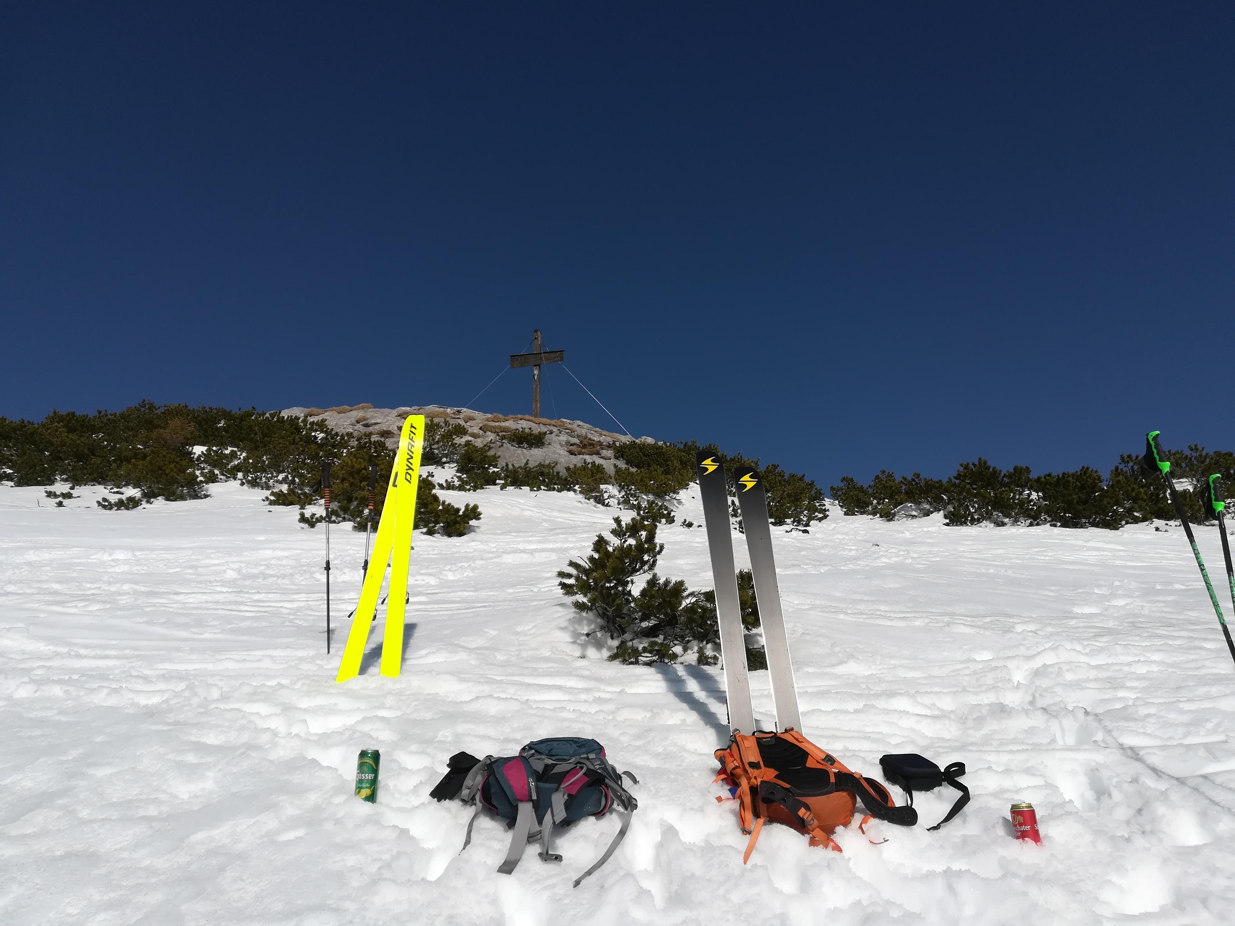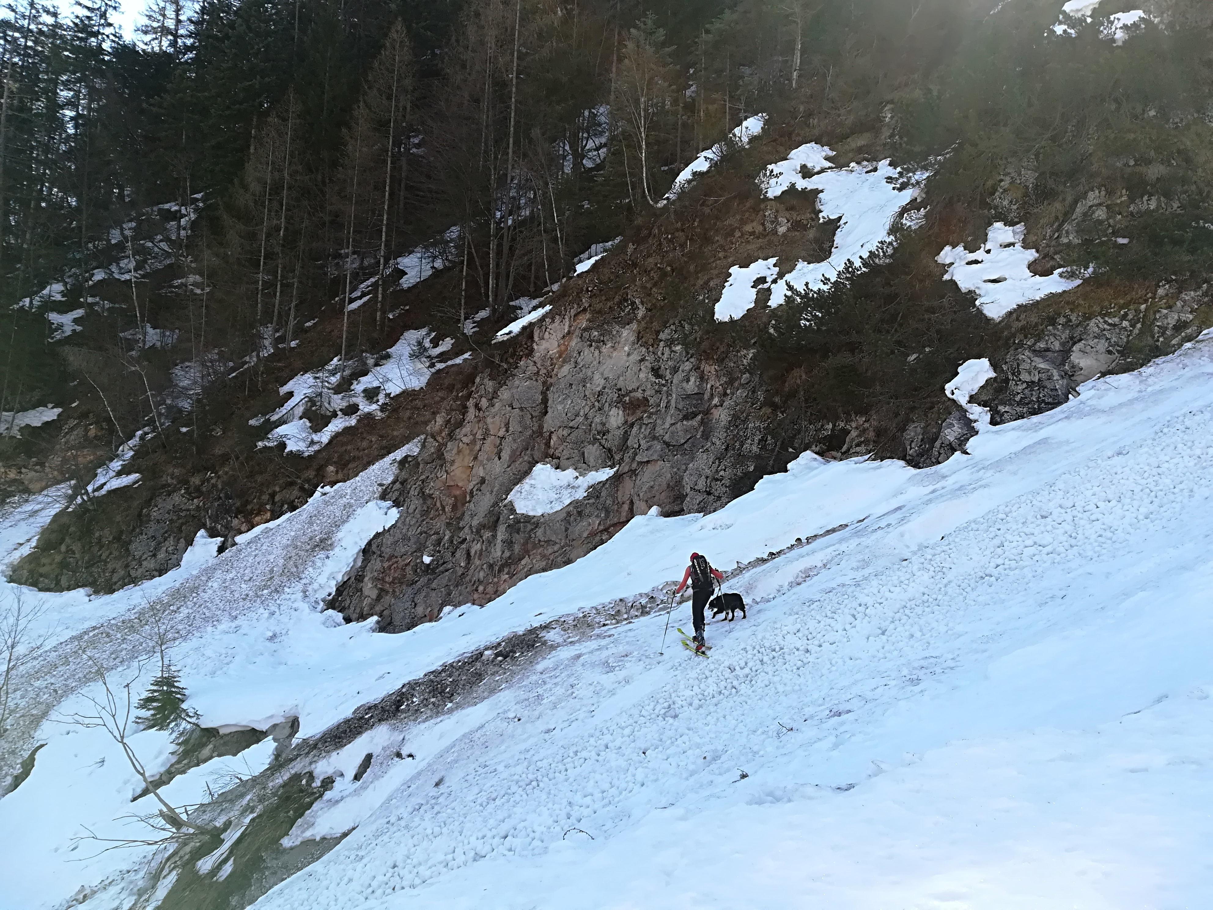 7,5 km Forststraßenhatscher rauf und runter sind schon zach. Bis auf drei kurze Unterbrechungsstellen noch genügend Schnee. Immer wieder Lawinenstriche zu queren. Es dürfte auch auch noch einiges an Altschnee runterkommen. Aus dem Pfannsteig keine Spuren. Dürfte ähnlich wie vor ein paar Wochen und wie zum Skihörndl sein. Oben im Kar je nach Exposition Pulver, Firn, Bruchharsch - alles vorhanden. Am HZ waren drei Spuren, sonst nichts. Wir sind dieses Mal den großen Bogen gegen den Uhrzeigersinn hinunter in die Niedergrub gefahren. Dabei ist wichtig dass man immer so hoch wie möglich rüberquert, bis man die Verbindung zum Schlusshang sieht. Verlockend aussehende Abkürzer davor landen im Absturzgelände".