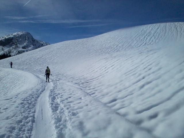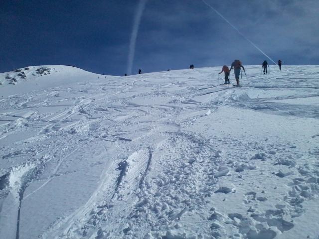 Massenstart heute früh um 8 Uhr - Hinterthal war heute der Nabel der Skitourenwelt. Wir mitten drin statt nur dabei... eine Pilgerfahrt, ein Friedensmarsch, Sundays for futur... so ganz genau haben wir nicht herausgefunden, warum so viele heute dem Gipfel des Seehorn entgegenstrebten, aber alle hatten ein frühlingsfrisches Lächeln im Gesicht und das machte es dann wieder besonders. Freu(n)de am Berg. Abfahrt um 13 Uhr. Die Bedingungen waren denkbar günstig: der gebundene windverpresste Pulver auf der Gipfelrampe ließ sich gut fahren, im Mittelteil firnig, im unteren Teil weich aber nicht sumpfig, der Wald ein vergnüglicher Funpark, kein Wind heute. Die Nordrinne wurde auch befahren, obwohl einige seitliche Schneerutscher abgingen. Einziger Wermutstropfen: der Lohfeyrer-Wirt hatte geschlossen ;-(