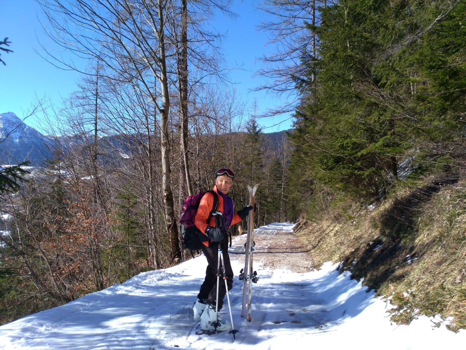 Im Aufstieg vom Parkplatz Hammerstiel auf dem Forstweg Richtung Schappachalm noch durchgehende Schneedecke, bei der Abfahrt durch Sonne und Temperaturanstieg schon einige apere Stellen.