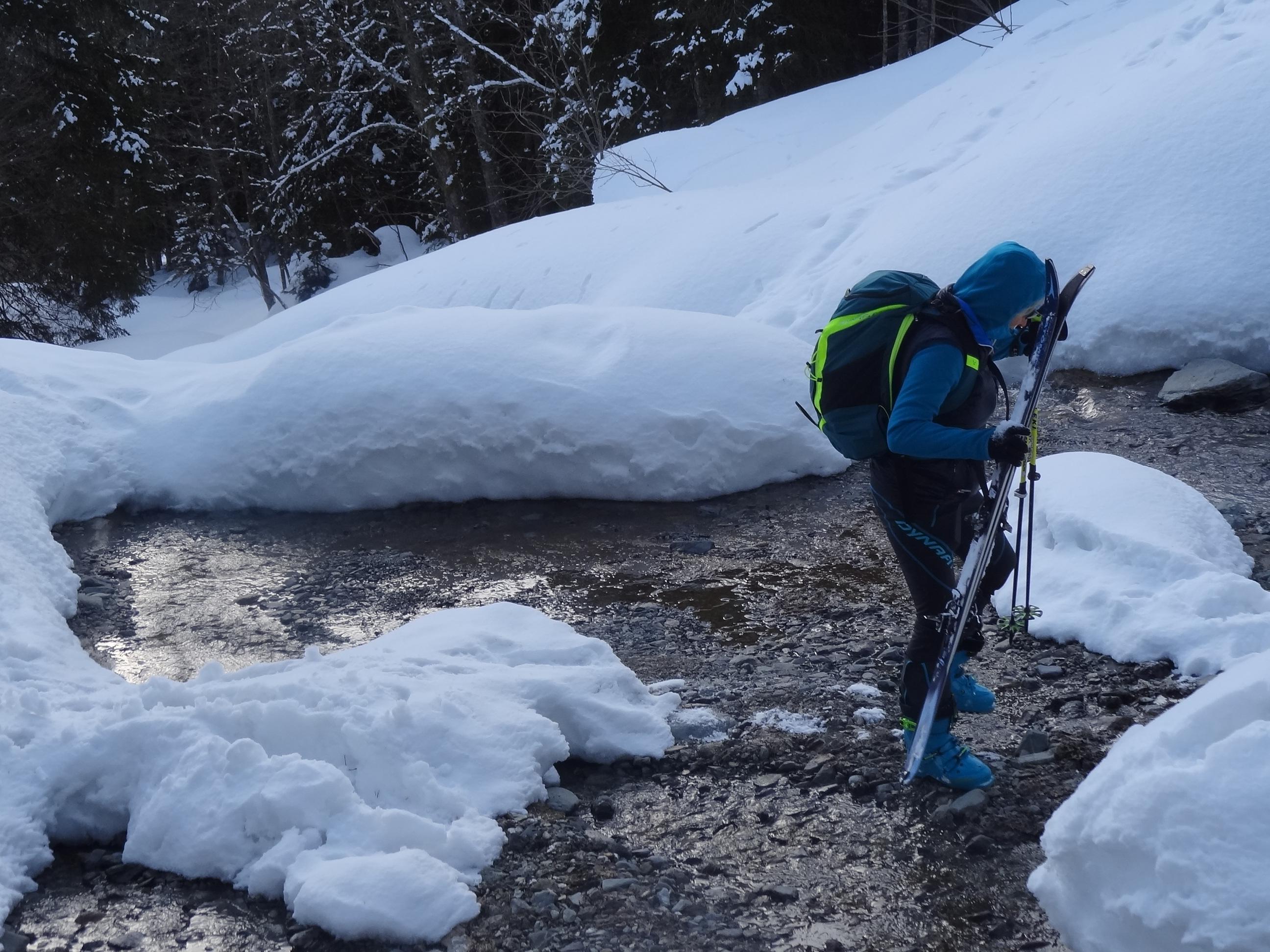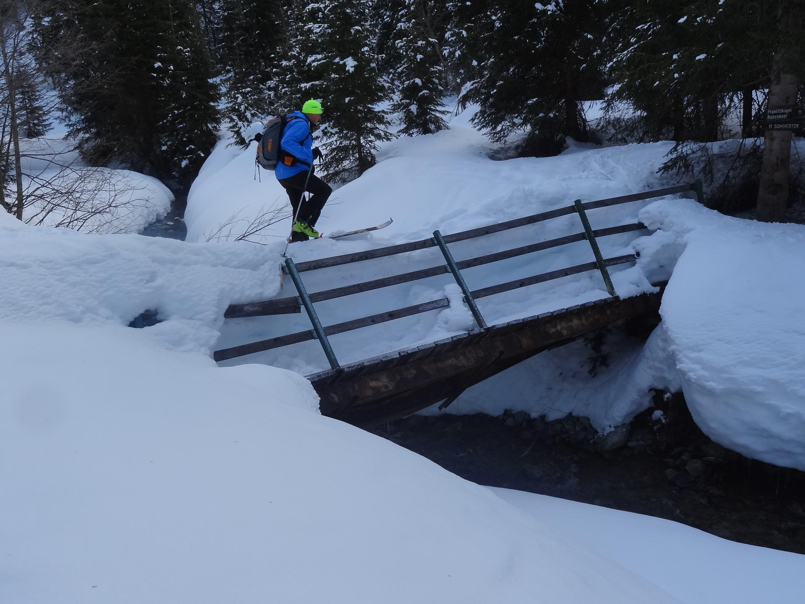 Auf der Nordseite des Bärensteigkopfs gab's heute noch schönen Pulver vom Neuschnee vor zwei Tagen. Diese 15 cm-Schicht liegt, gut gebunden, auf einer kompakten Altschneedecke. Weder alte noch neue Lawinenzeichen waren im Tourenbereich sichtbar.