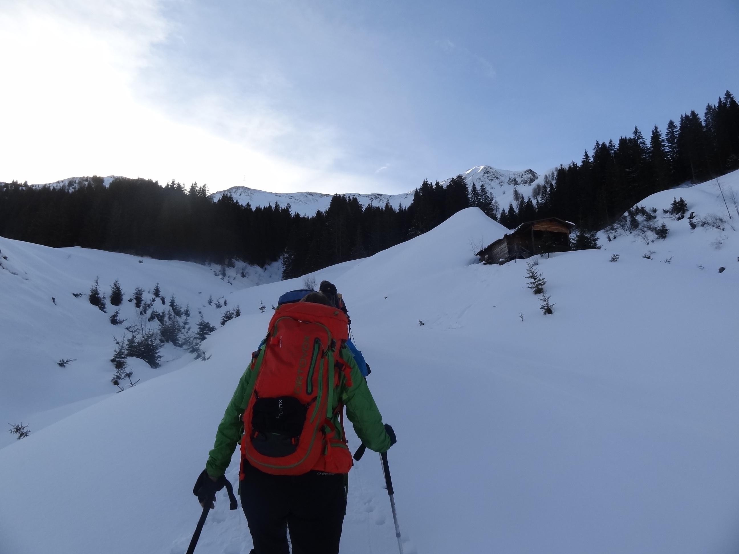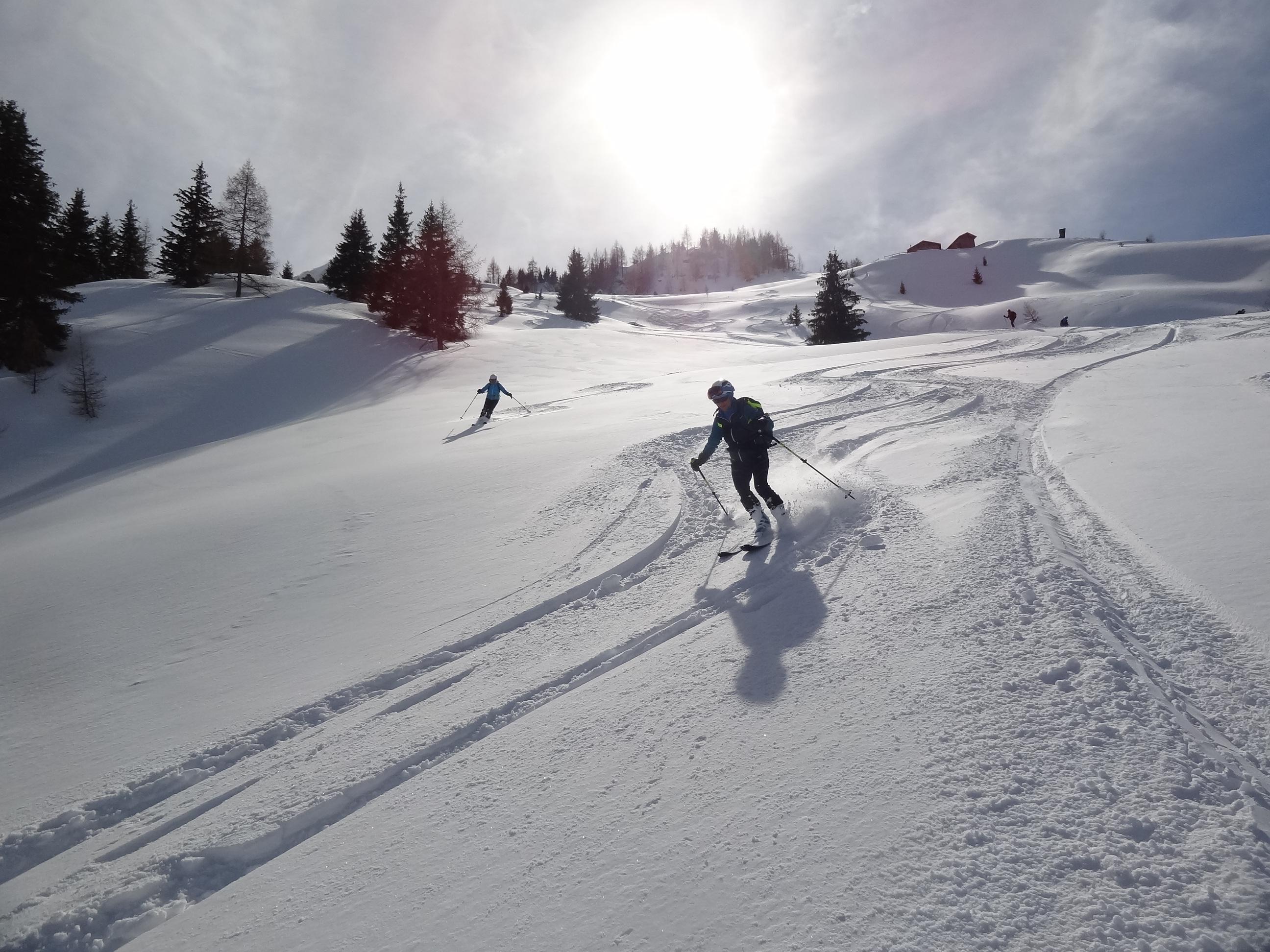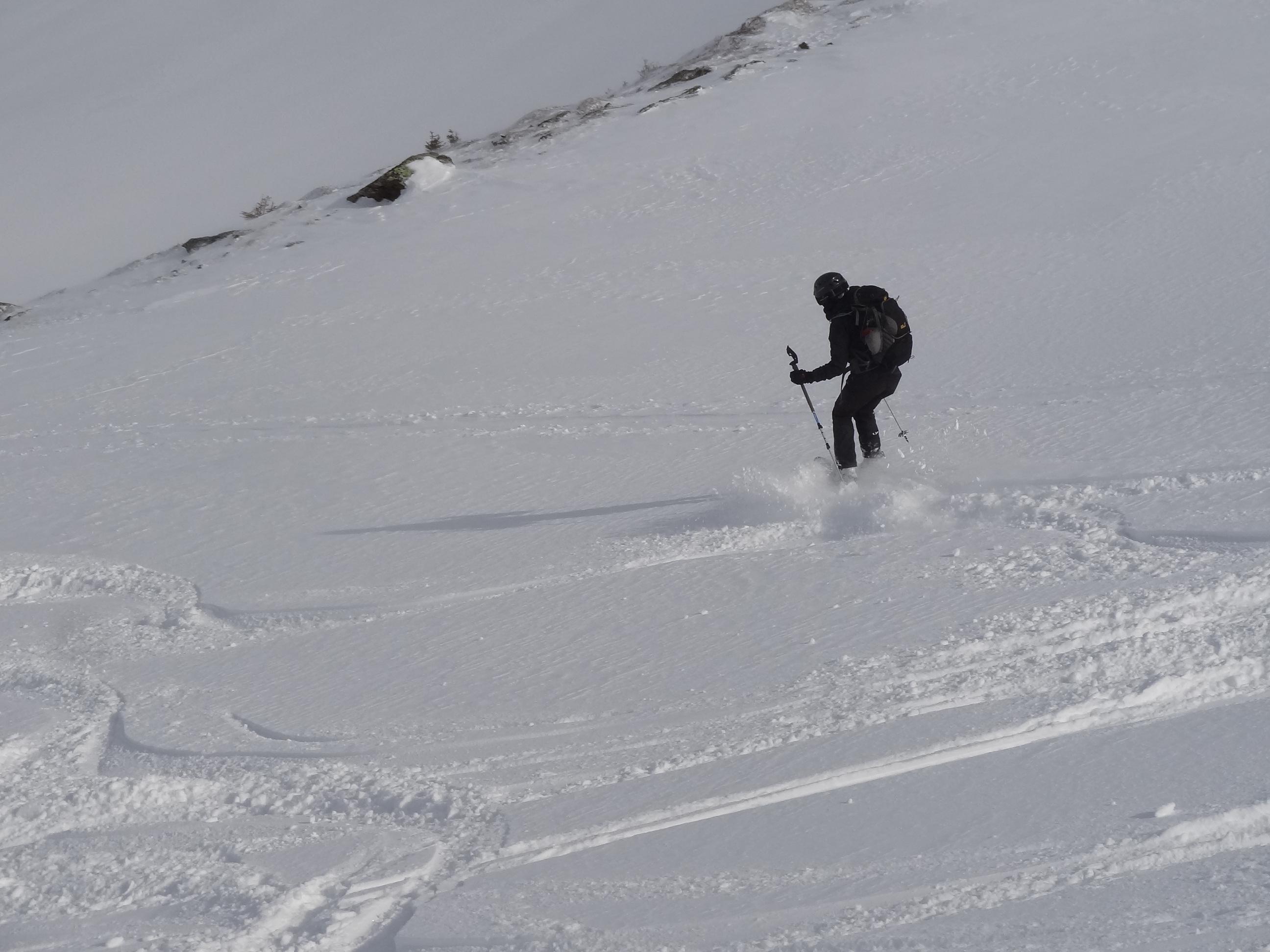 Die Abfahrt ging zuerst über den abgeblasenen Kamm, dann kurz über windgepressten Hartschnee und schlußendlich lange durch den bereits etwas umgewandelten Pulver bis zum Auto.