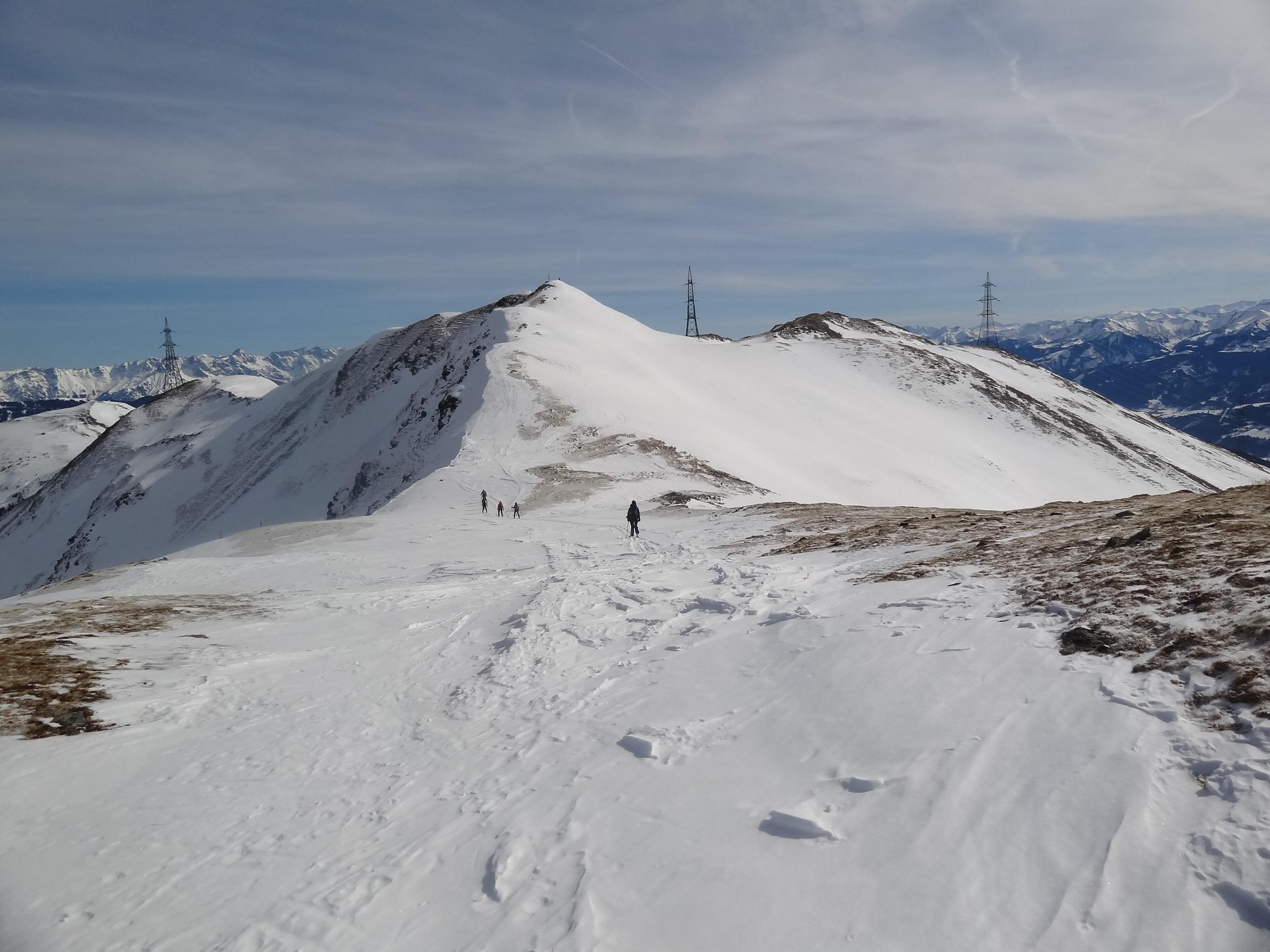 Der schattige Aufstieg aus dem Schwarzachengraben war zwar frisch aber dafür windstill. Erst am Rücken und am Gipfel erwischte uns am späten Vormittag der kräftige, und bei den wenigen Minusgraden bereits sehr unangenehme Südwind. Ein längerer Aufenthalt oder ein genussvoller Rundblick waren am Gipfel trotz Sonnenschein nicht möglich.