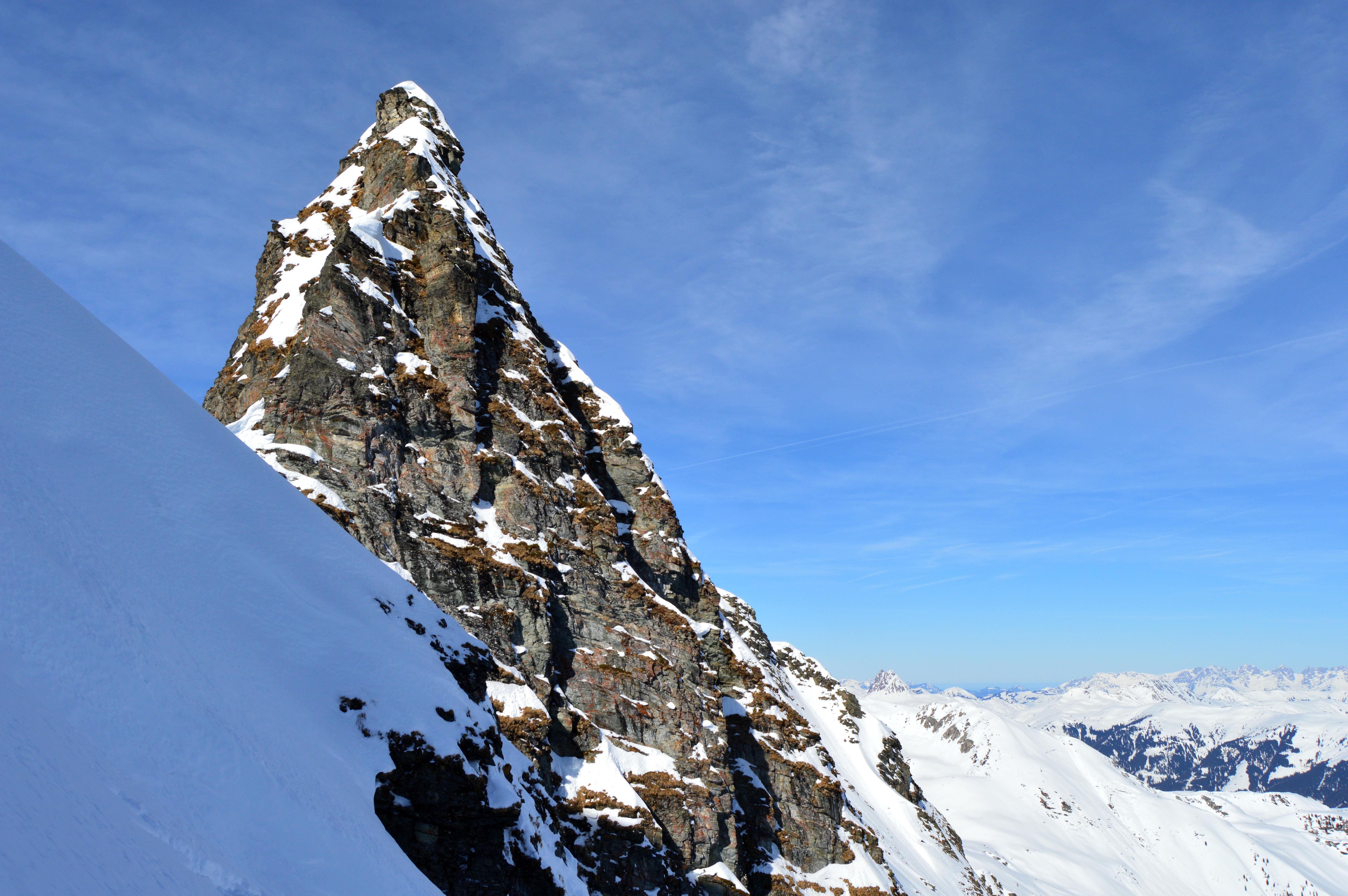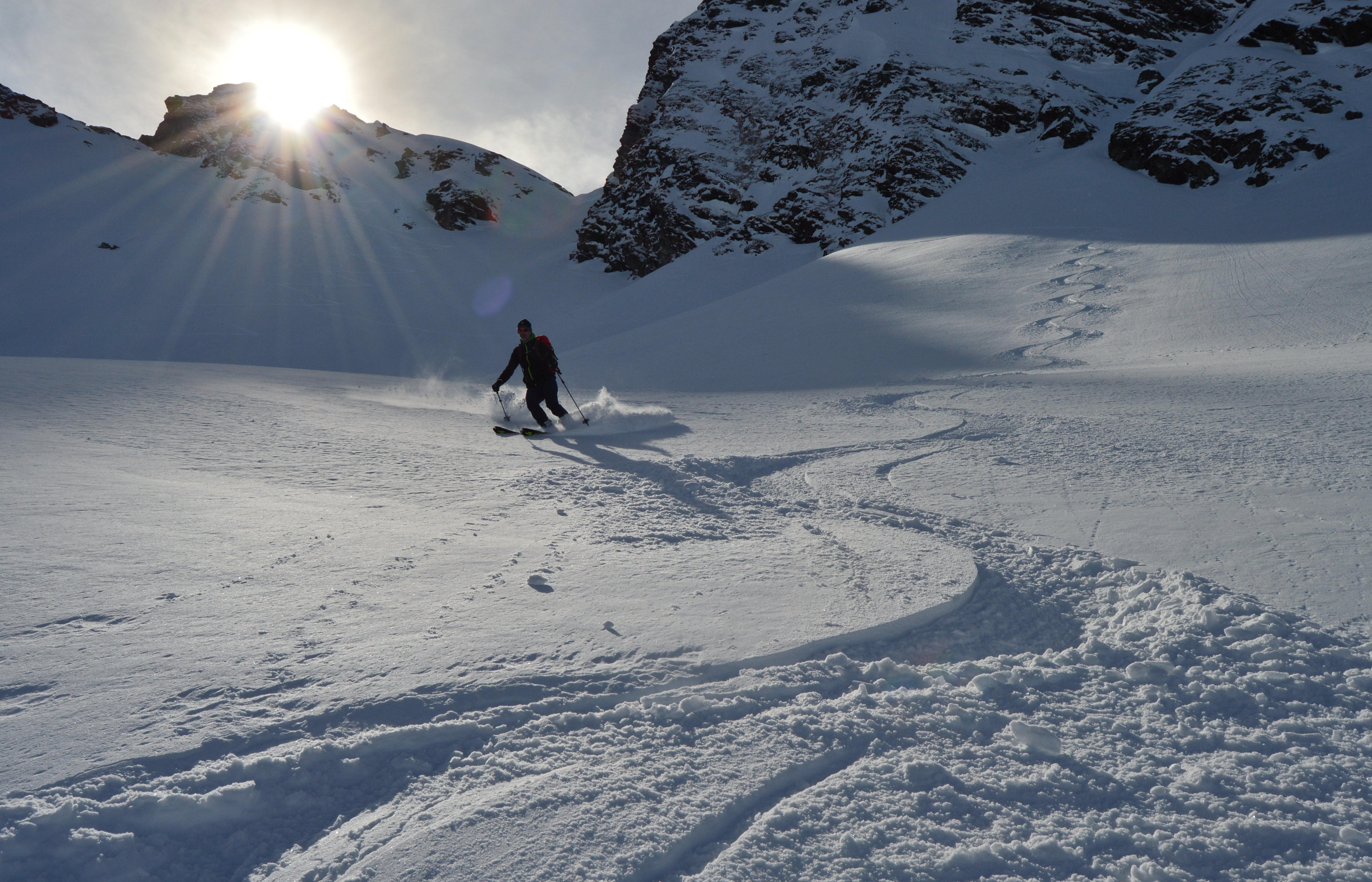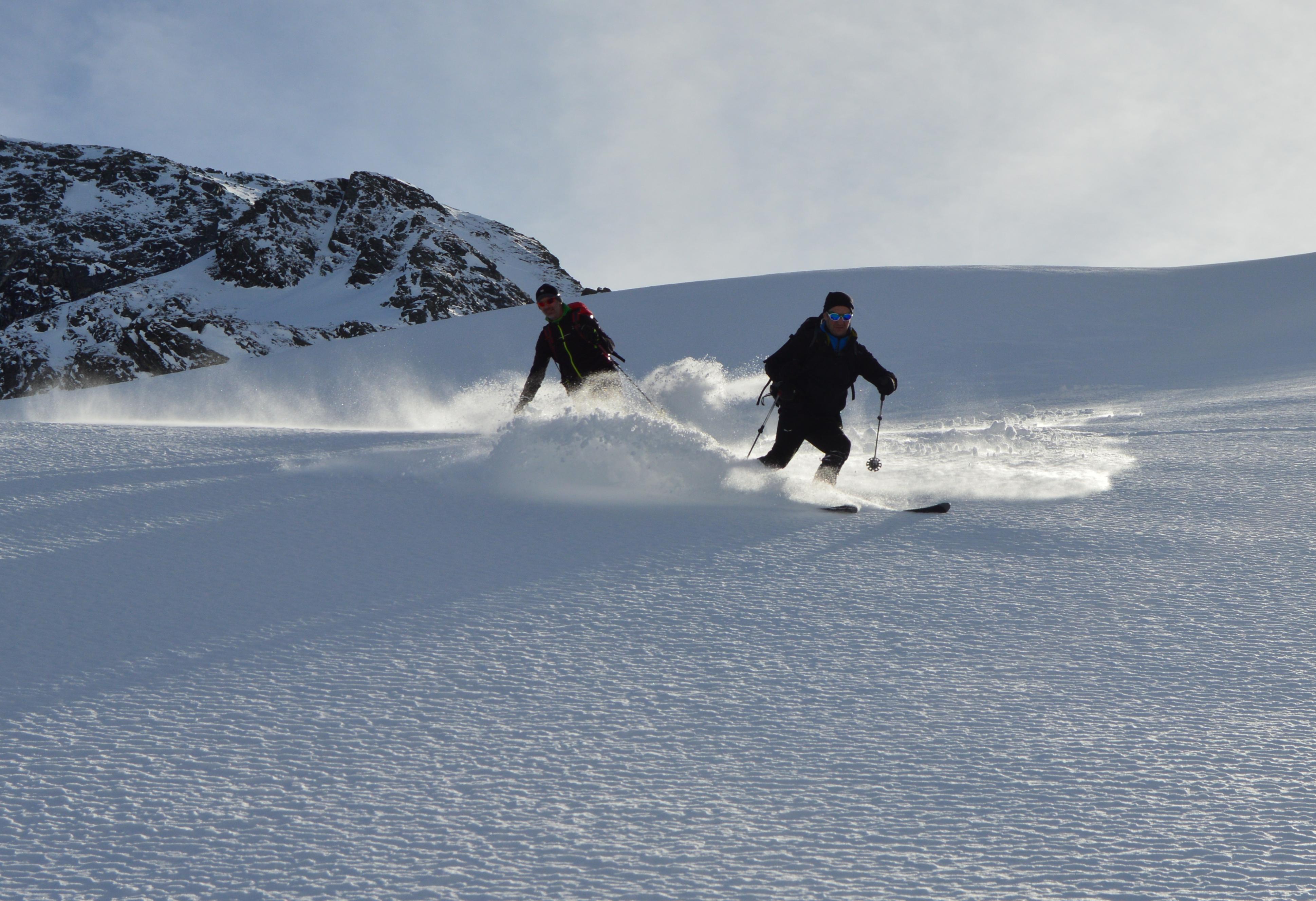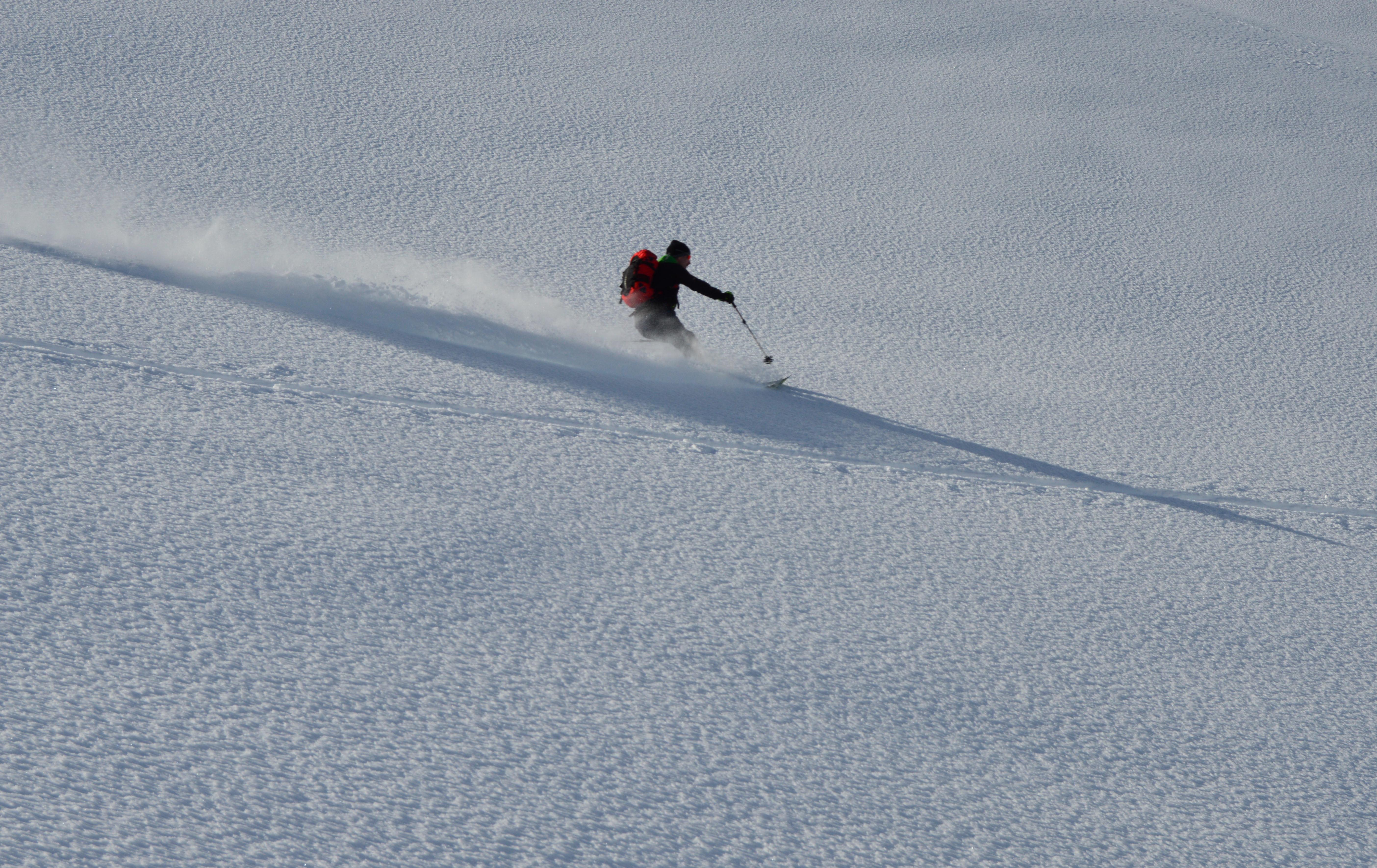 Momentan herrschen wirklich traumhafte Bedingungen mit einer kompakten Altschneedecke, mit kalter "schneller" Pulverauflage, die Richtung Gipfel auf ca. 30cm anwuchs. Die letzten sehr steilen Meter zum Gipfel waren von einer Seite etwas eingeweht, ansonsten einfach geniale Verhältnisse.