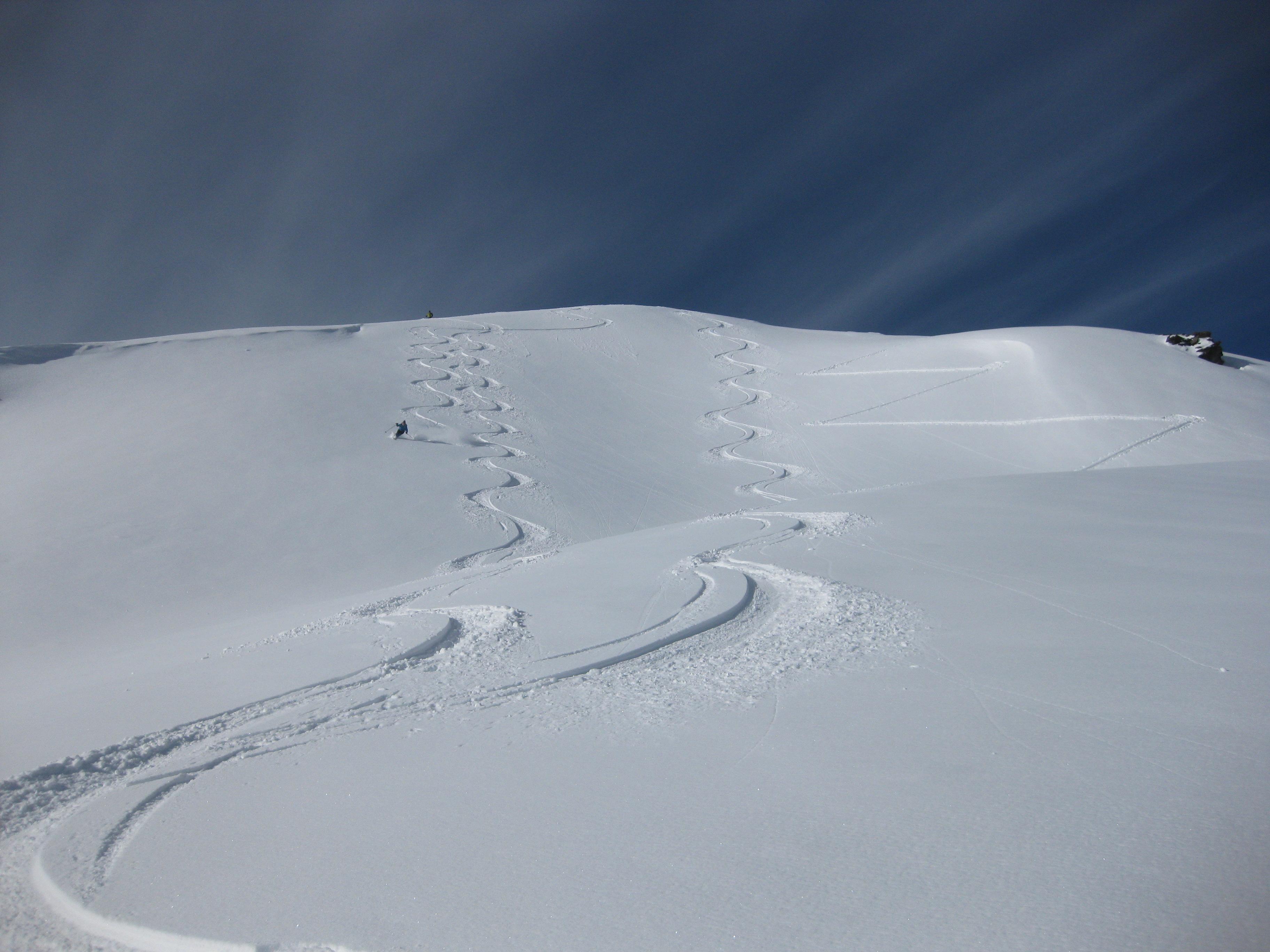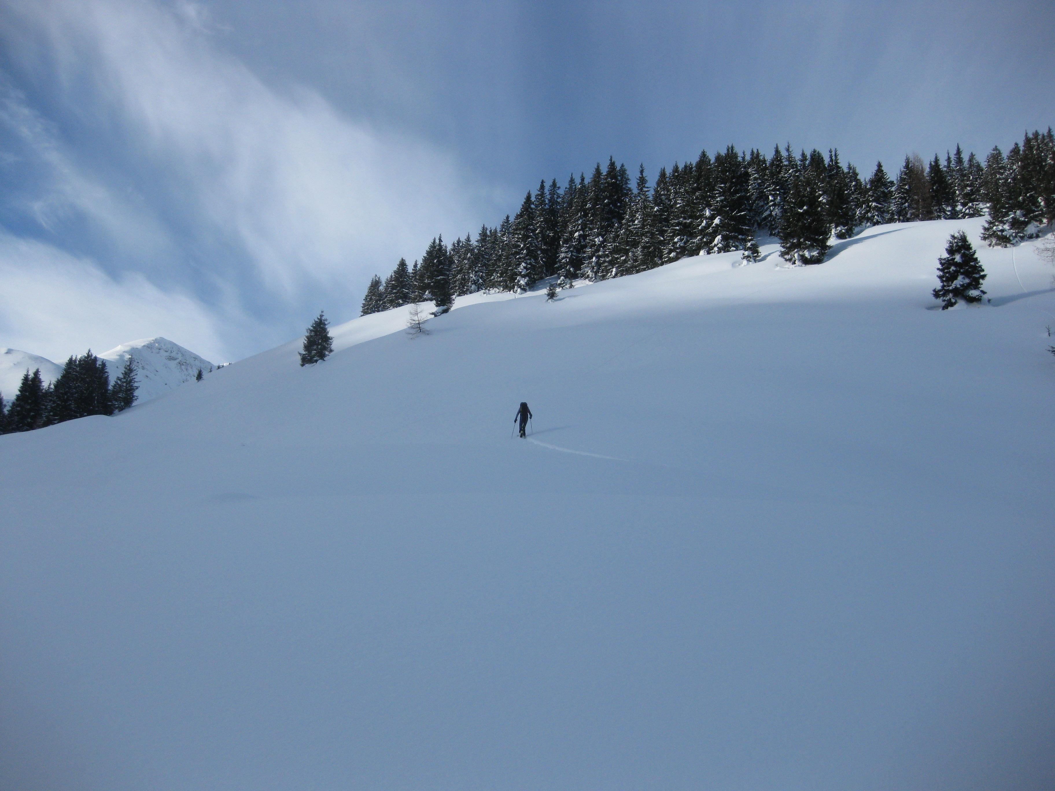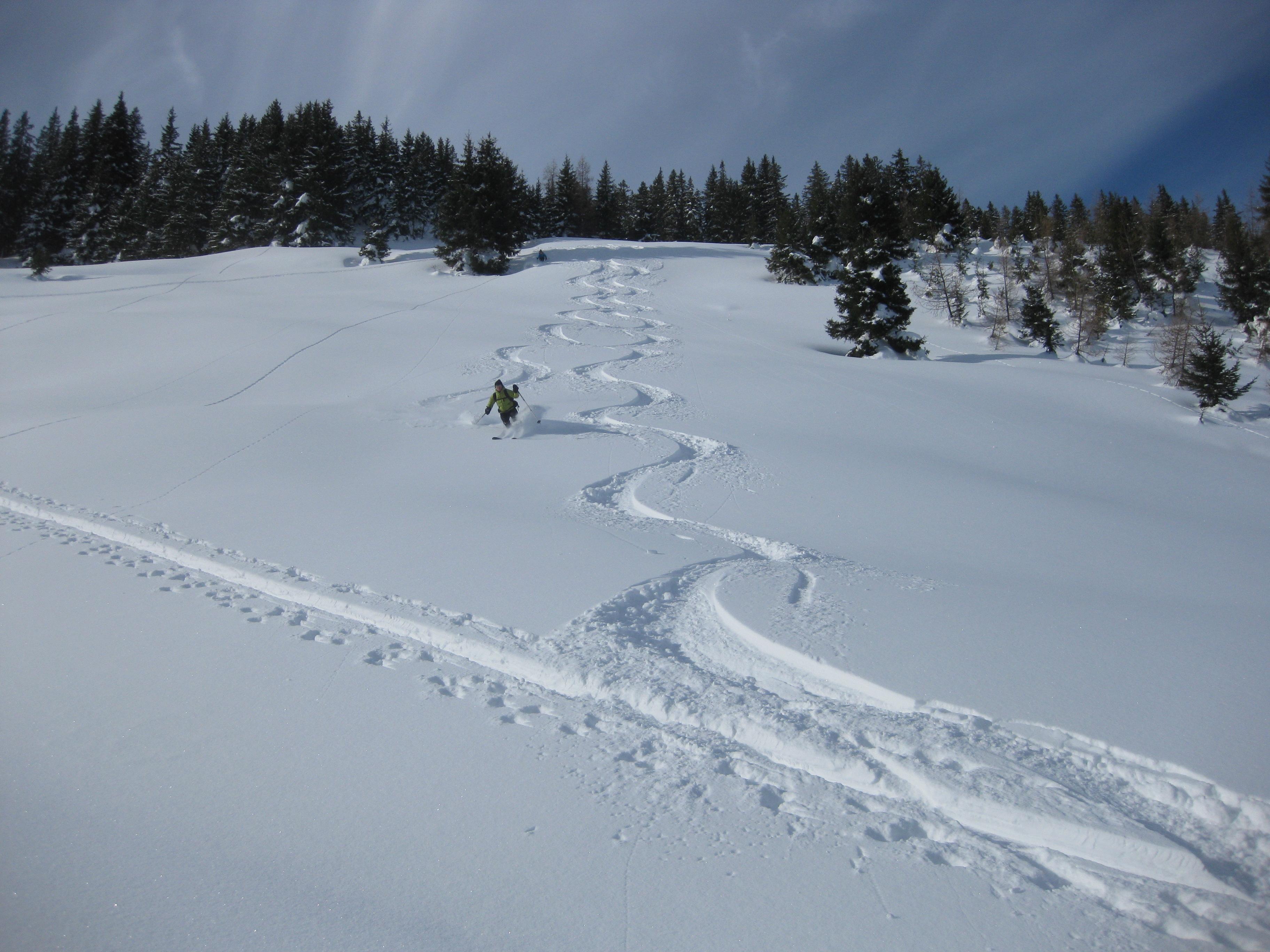 Die richtige Wahl getroffen .Nach der gestrigen Sausteigentour die schon absolut ok war, haben wir für heut ein Schmankerl ausgesucht. Top Bedingungen ca.10- 25 cm Pulverauflage und das vom Gipfel weg bis unten auf gut gestezter Schneedecke. Den Berg hatten wir fast für uns allein nur 2 Tourengeher kamen nach.