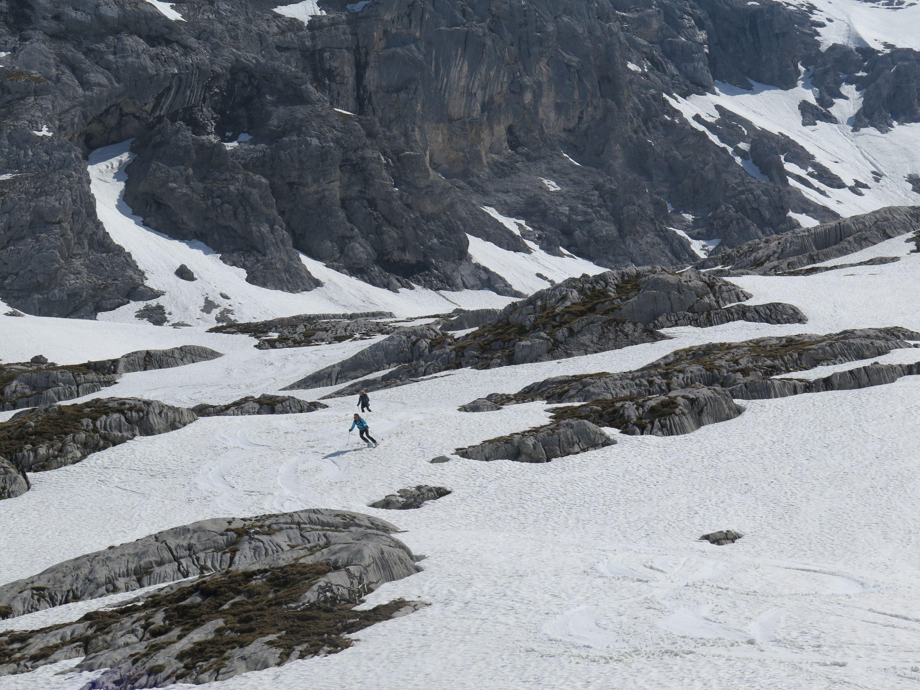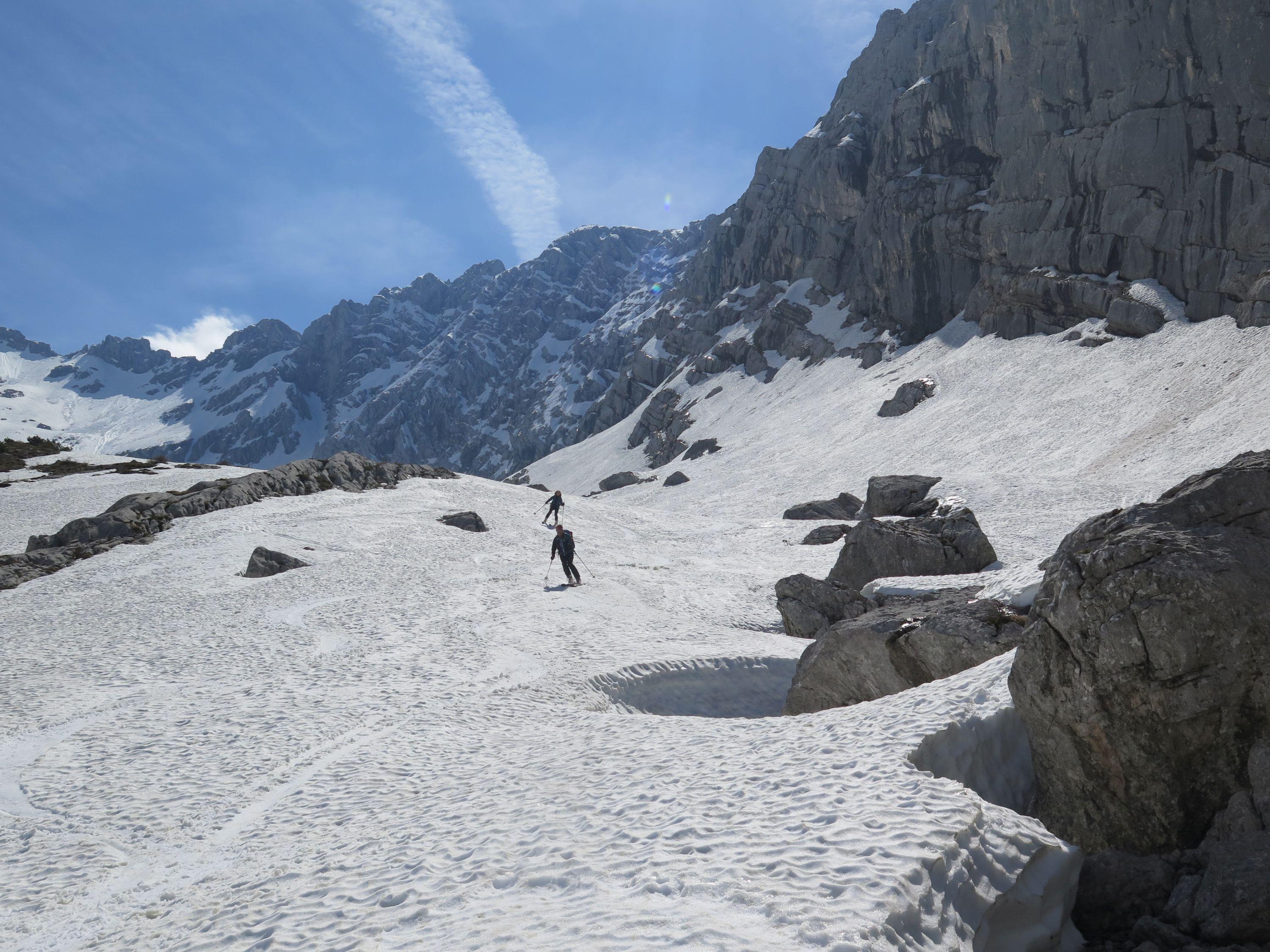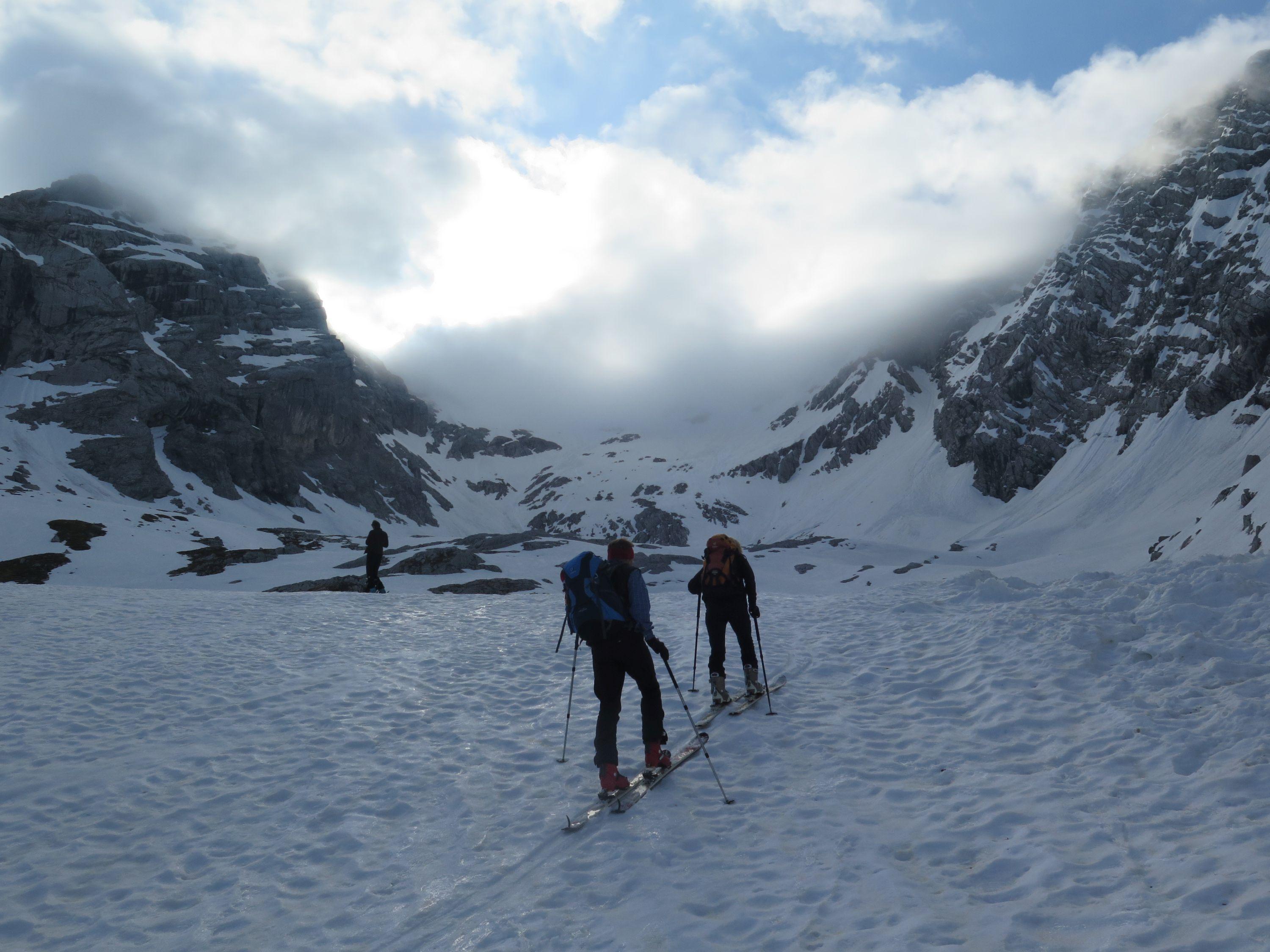 Wetter: im Kar mäßiger Wind und starke Bewölkung - später Wolkenauflösung, Sonne, in der Scharte Windstill.