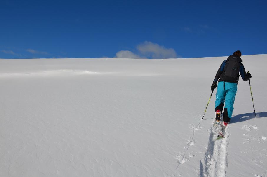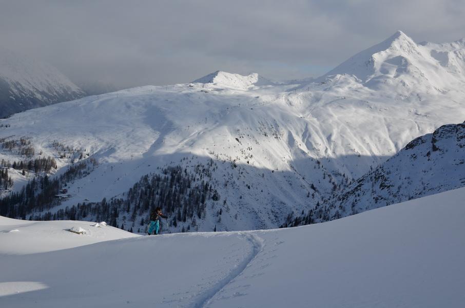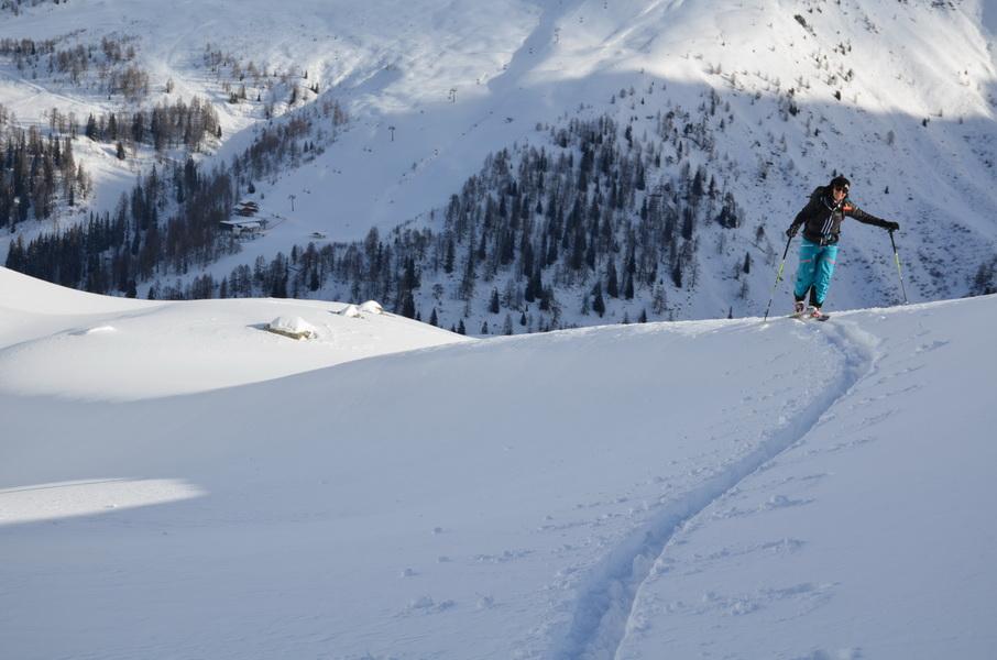 Für die erste richtig Alpine Tour des Winters haben wir heute etwas Liftunterstützung in Anspruch genommen. Nach einer ersten kurzen Abfahrt kurz vor die Bruggeralm haben wir dann aufgefellt und haben uns auf den Weg in Richtung Ragötzalm gemacht. Im unteren Bereich unter dieser Alm ist die Schneehöhe noch recht dürftig. Zum Gehen problemlos aber beim Abfahren ist auf jeden Fall ein wachsames Auge nötig. Ab der Alm haben wir dan versucht den flachsten Weg hinauf bis zur Ragötzllenke zu finden denn trotz dem heute ausgegeben 2 er in diesem Gebiet war der Windeinfluss der letzten Tage gut zu sehen. Ab den Törl sind wir dann bald auf den Grat gewechselt und dann über diesen zum Gipfel aufgestiegen. Abgefahren sind wir dann aufgrund unserer EInschätzung der Lage auch entlang der Aufstiegsspur, obwohl etwas mehr Hangneigung sicher mehr Spass gemacht hätte.