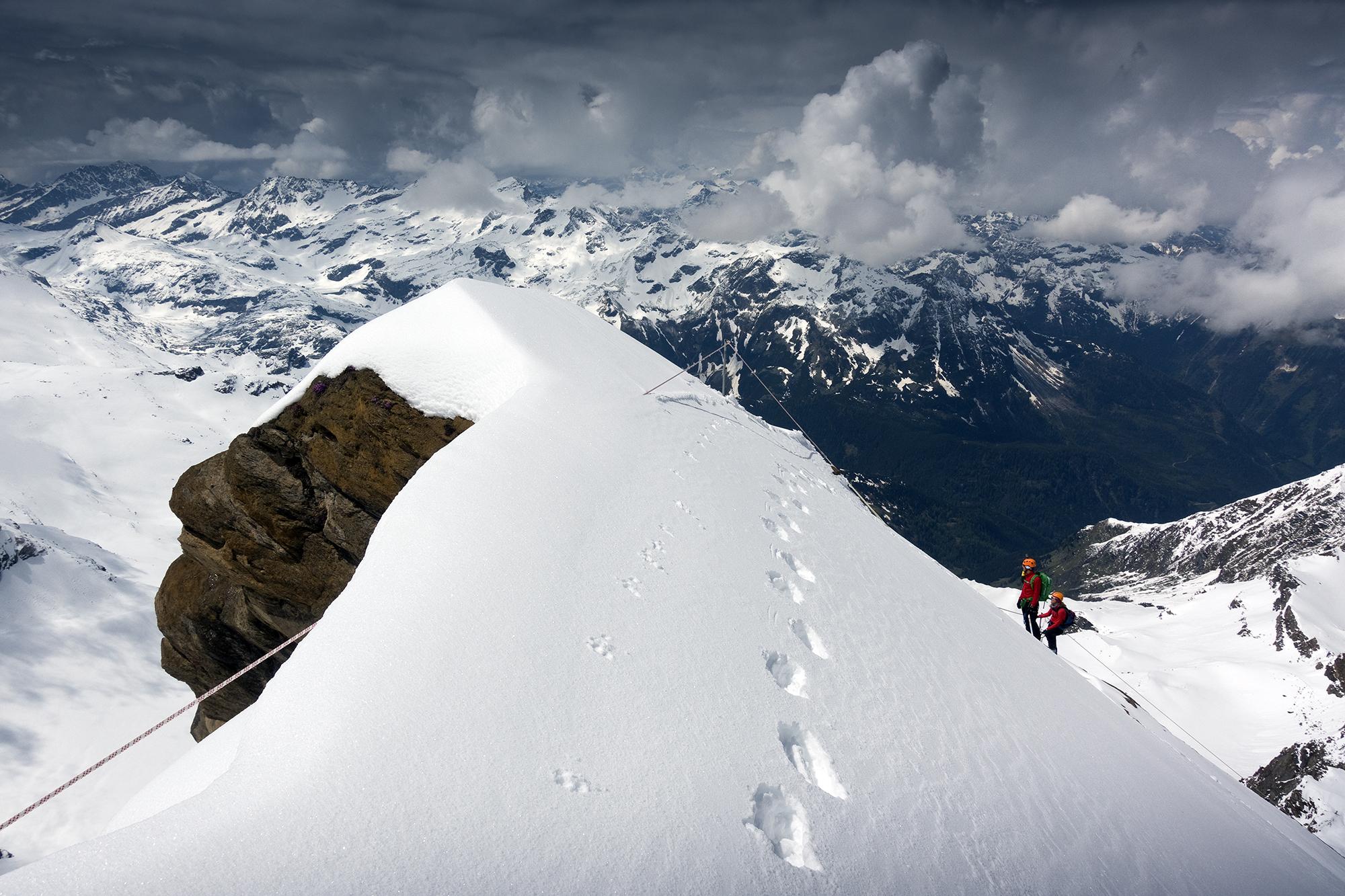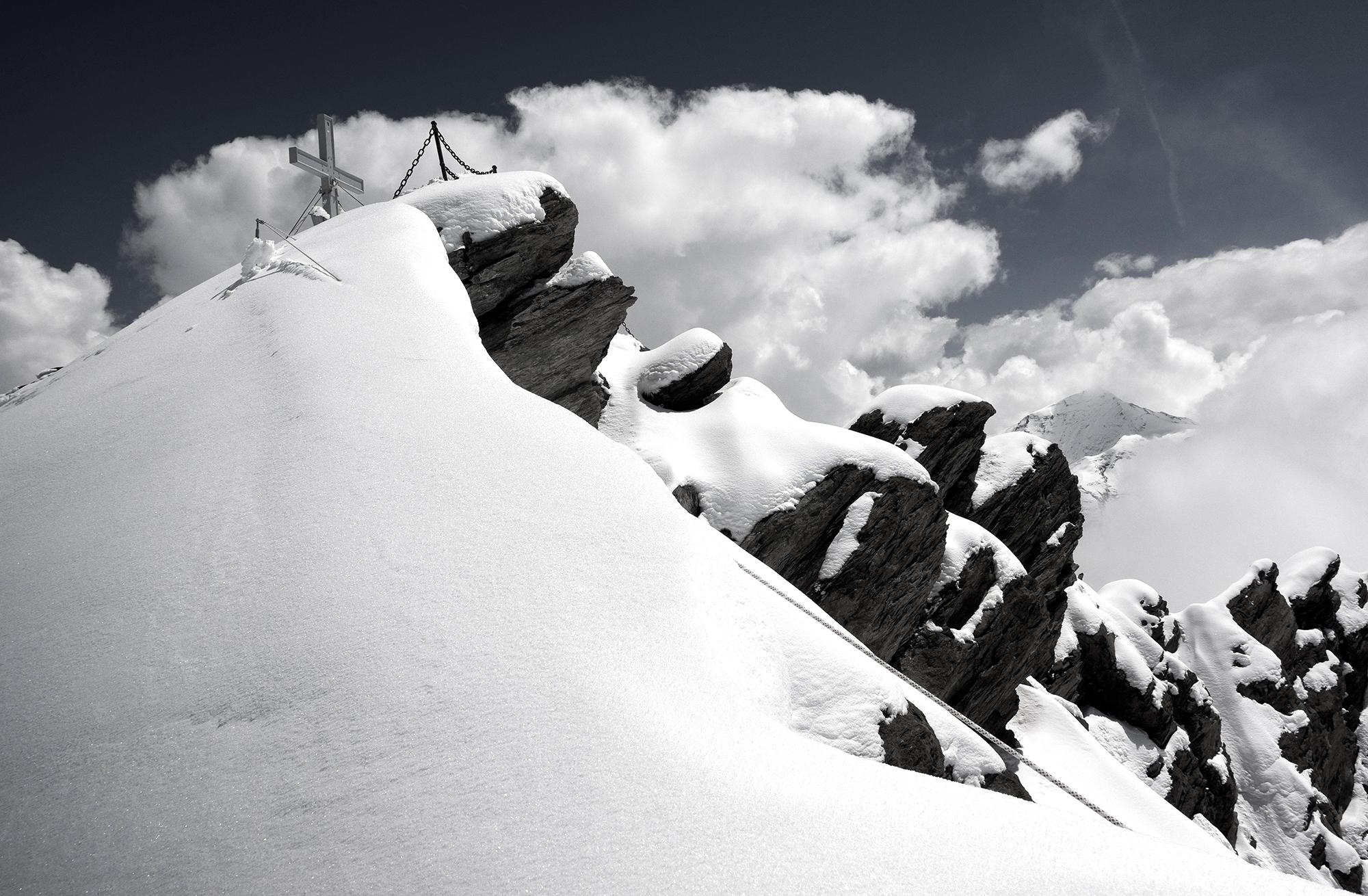 Für die Gipfelanstiege Schmiedinger und besonders Kitzsteinhorn sind Harscheisen notwendig. Beim finalen Anstieg am Kitzsteinhorn (ohne Ski) sind die Seile teilweise unter der harten Schneedecke verborgen.