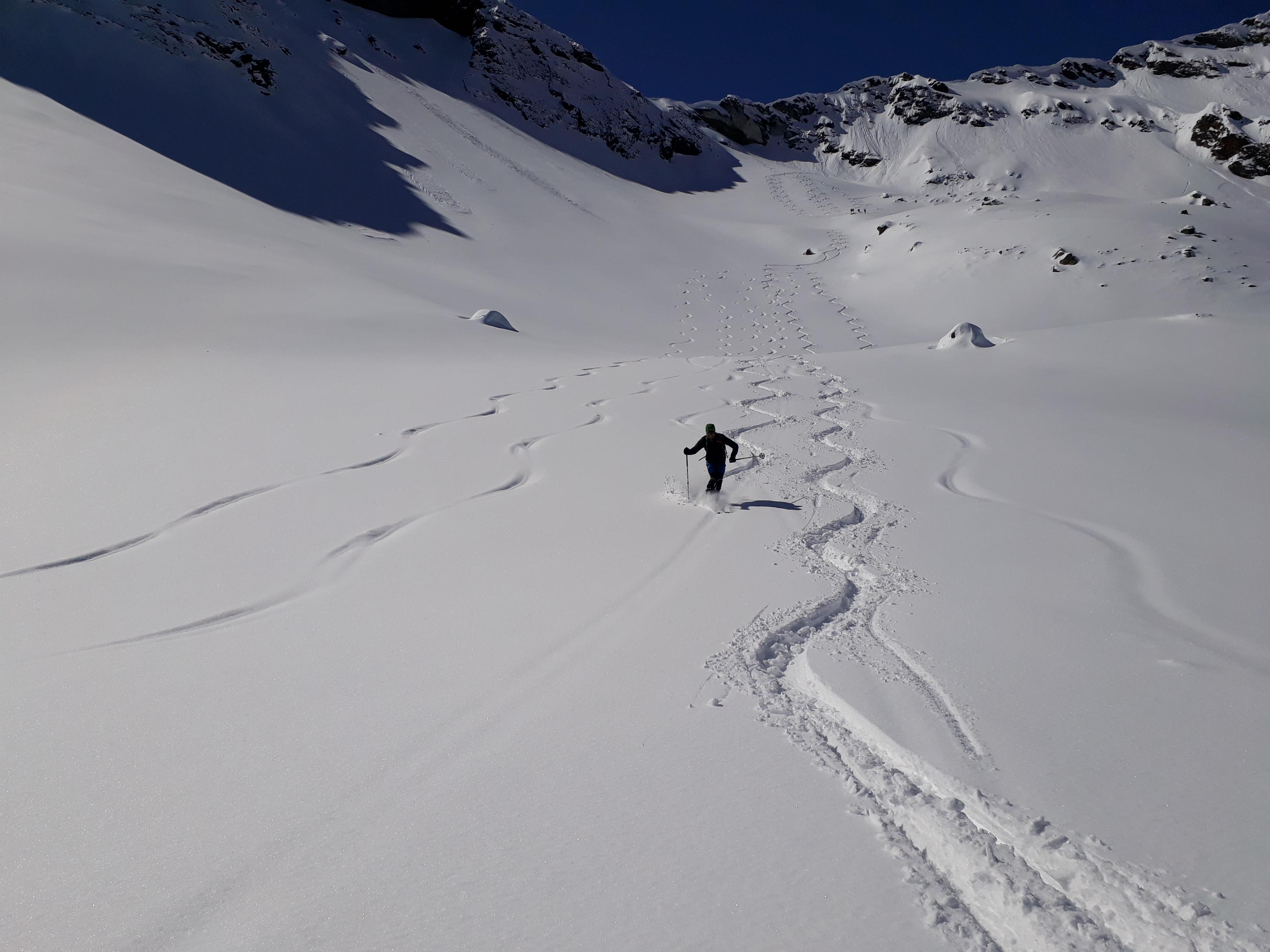 Start an der Straße zwischen Uttendorf und Enzinger Boden auf 884m. Gerade noch genug Schnee für den Start auf Skiern vom Auto weg. Anfangs auf Forststraße bzw. teilweise abkürzend dazwischen bis zur Wiedrechtshauser Alm, dann freies Gelände. Mit zunehmender Höhe steigert sich die Pulverschneeauflage auf ca. 30 cm. Insgesamt sehr lohnende und interessante Tour.