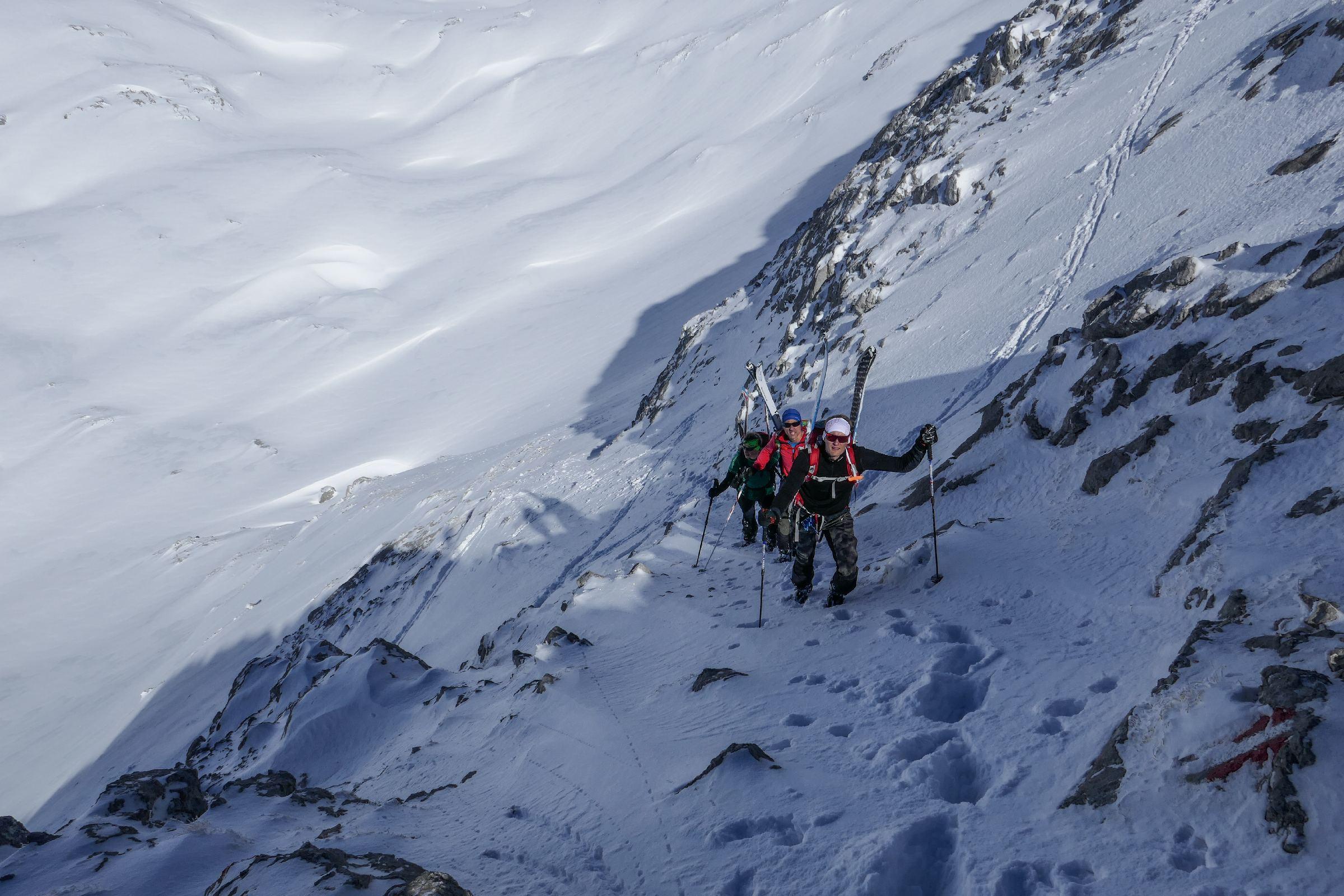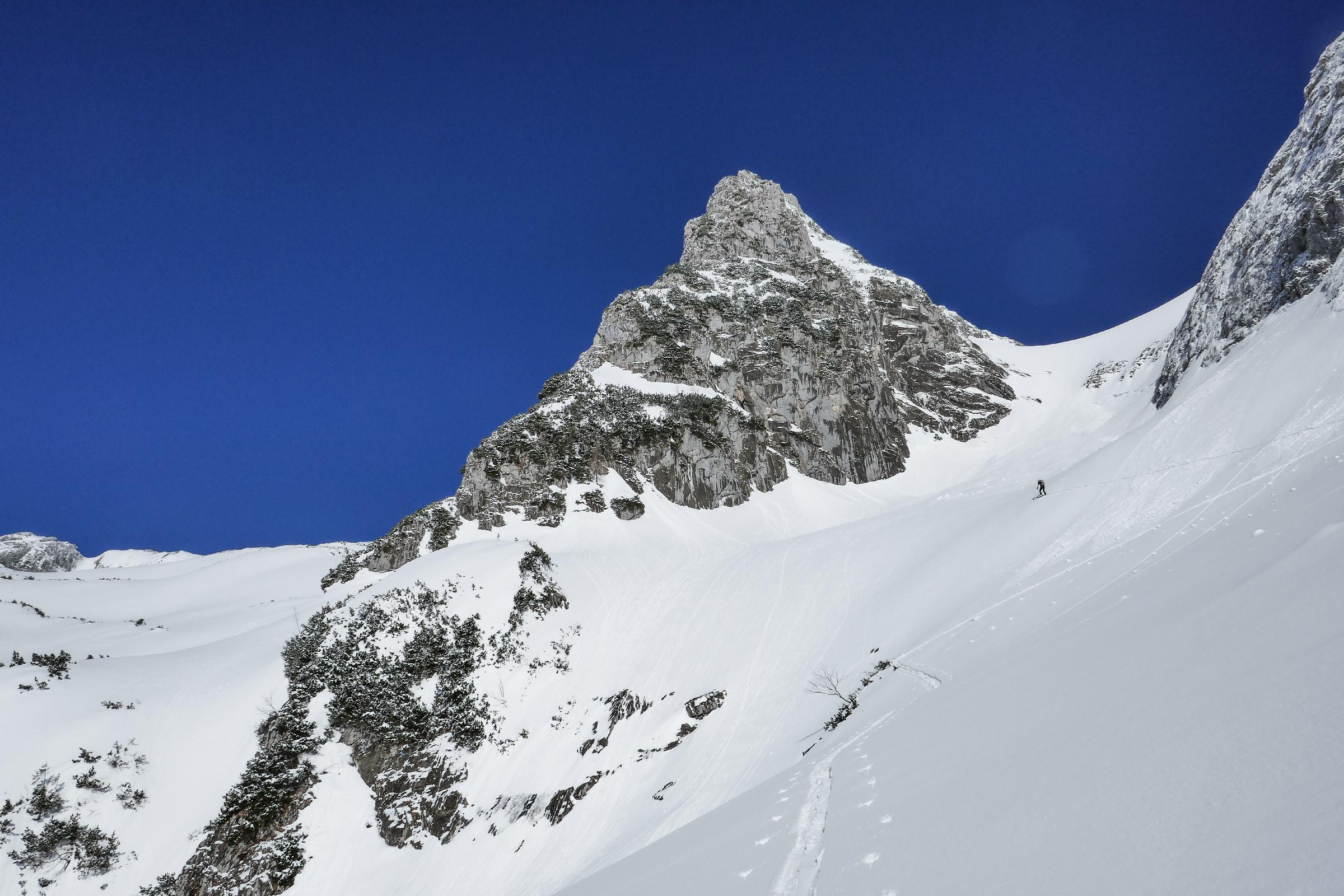 ca. 10cm (oben ein bisschen mehr) Neuschnee auf einer harten Unterlage. Perfekte Verhältnisse für eine schöne südseitige Steilabfahrt.
