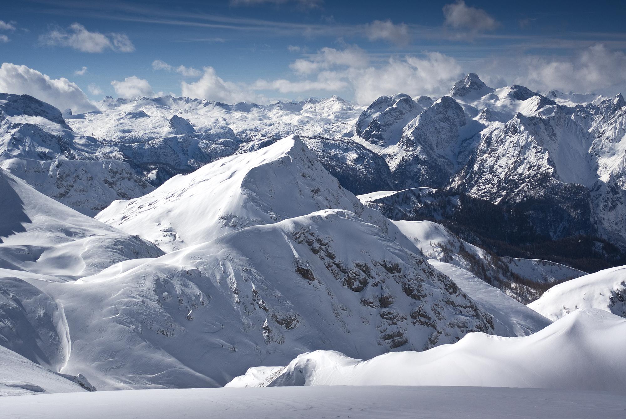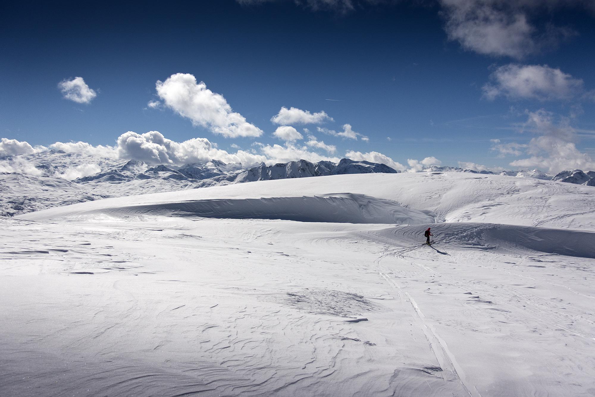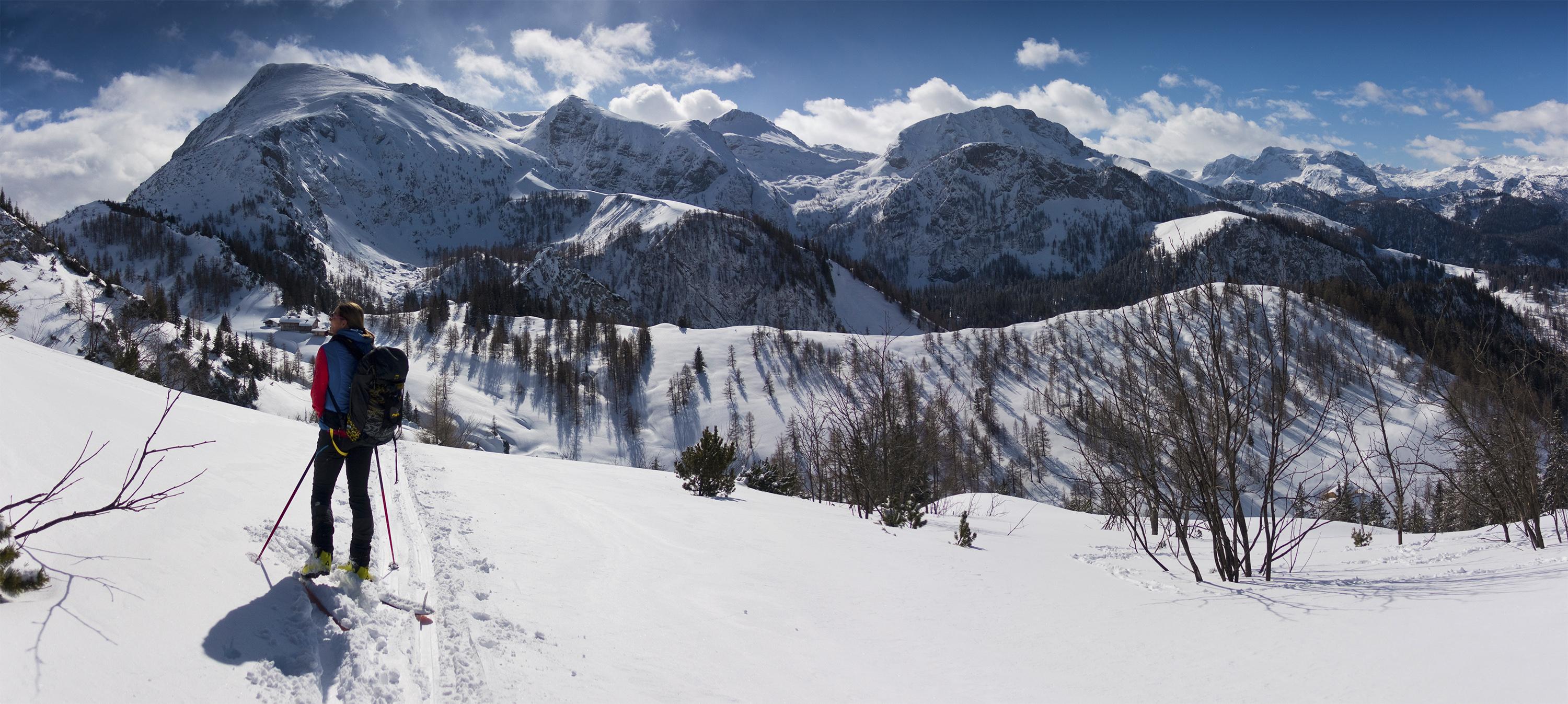 Von Hinterbrand wenige Zentimeter Neuschnee bis zu 20cm am Jenner. Auf der Flanke zum Schneibstein hinauf ist natürlich alles hart, windgepresst und verblasen.