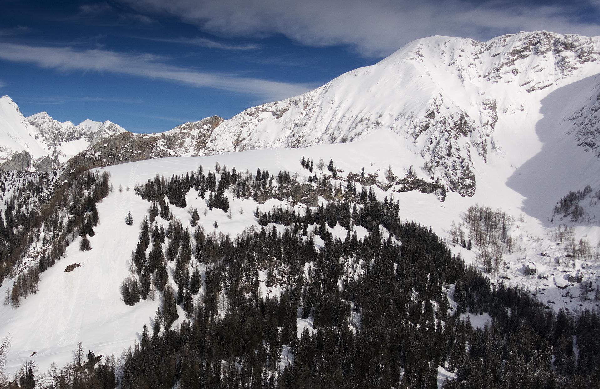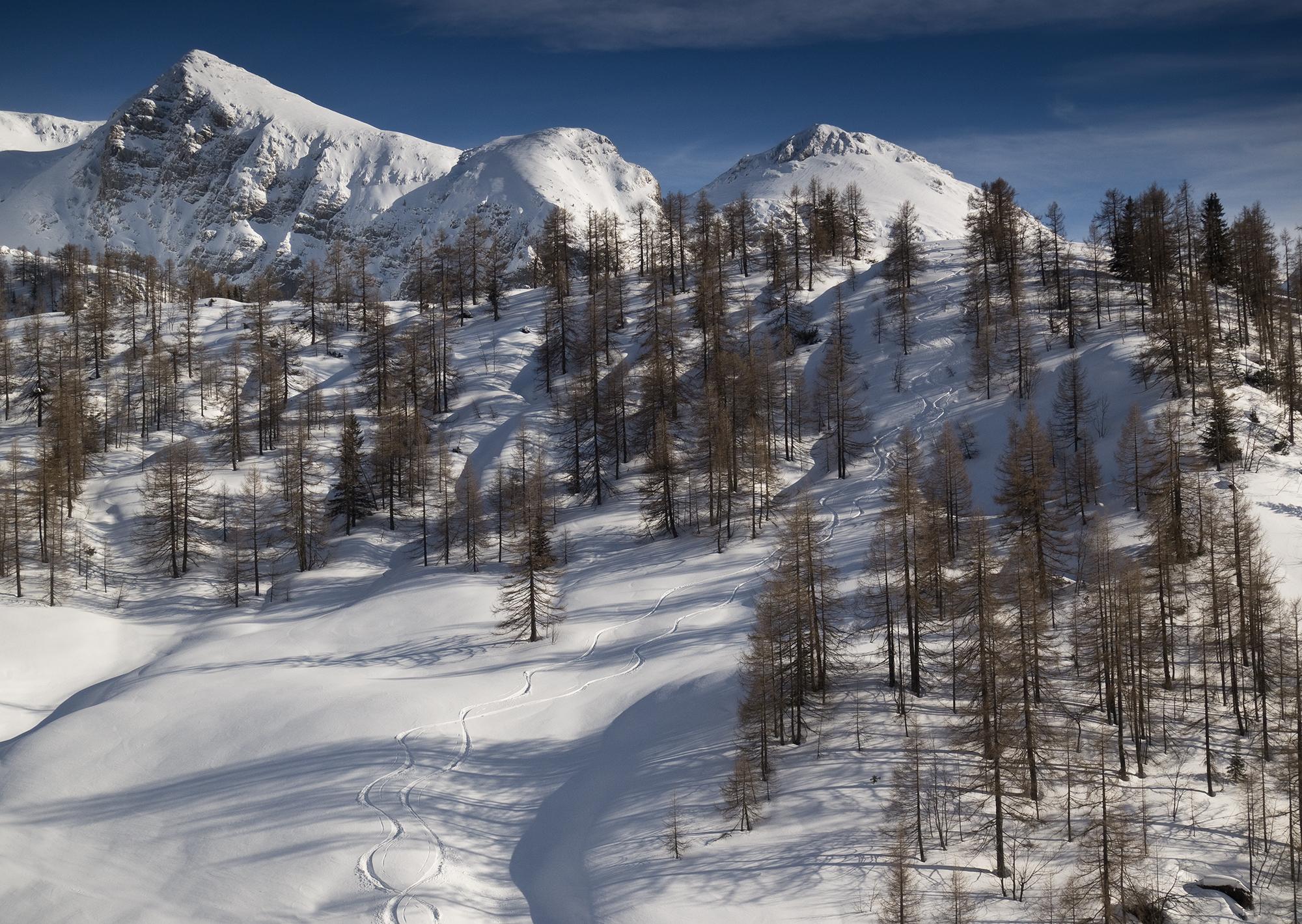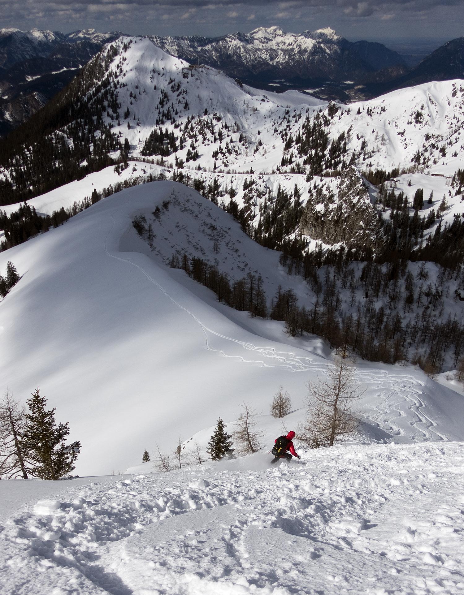 Hier sind wir nicht den Spuren gefolgt, sondern südwestlich abgebogen ins untere Bockskehl. Erst feiner Pulver, dann wird der Neuschnee zunehmend nass, aber noch gut fahrbar. Wir steigen aus dem "Geschirrwald" zum Farrenleiten, - wieder eine schöne Pulverabfahrt, - dann nordwärts zum P. 1657 - und noch einmal phantastischer Nordseitenpulver, bis wir oberhalb der Königsbergalm wieder Richtung Jenner aufsteigen. Über der Mitterkaseralm ist auch noch ein wenig verspurter schöner Hang ...