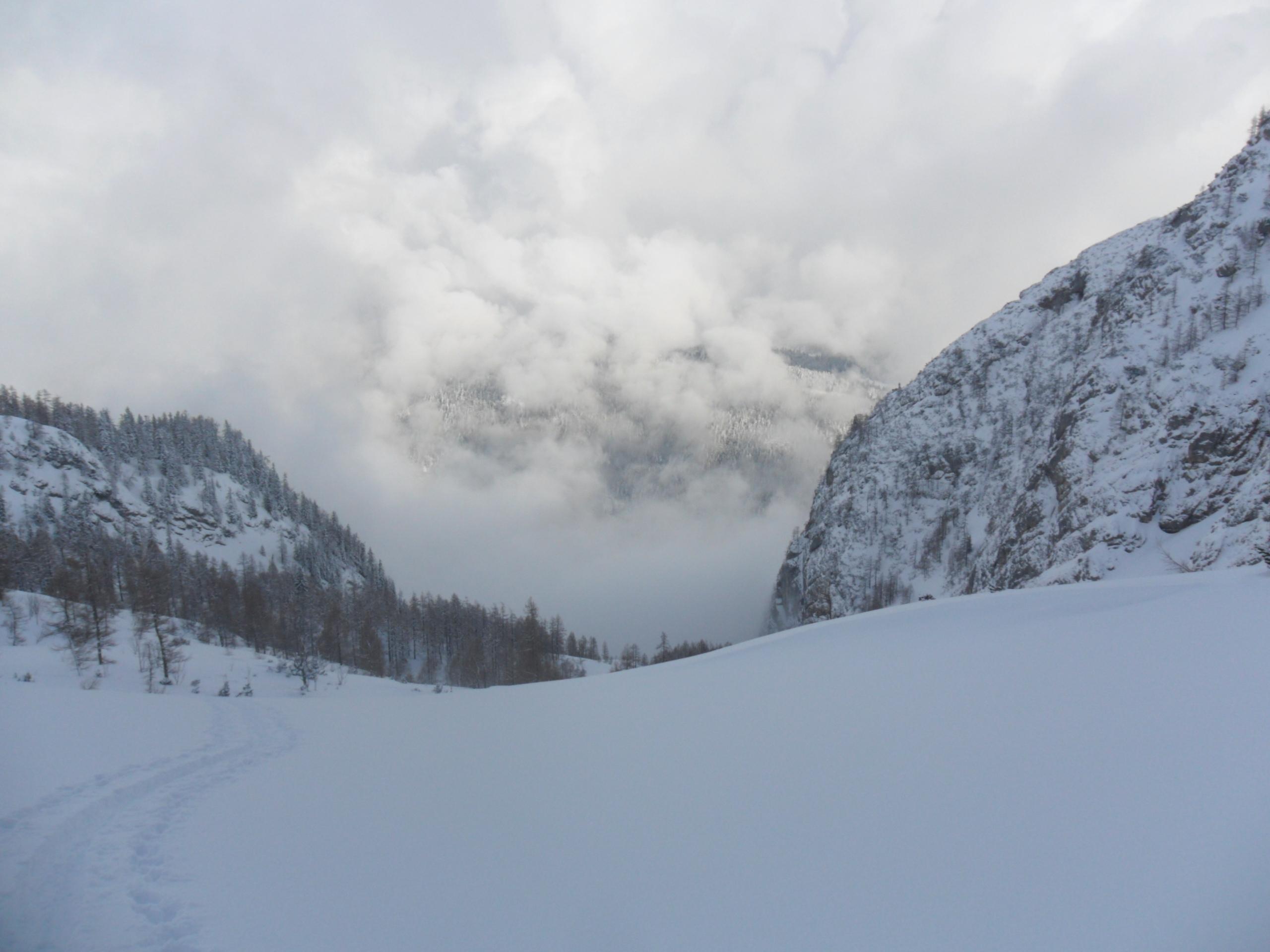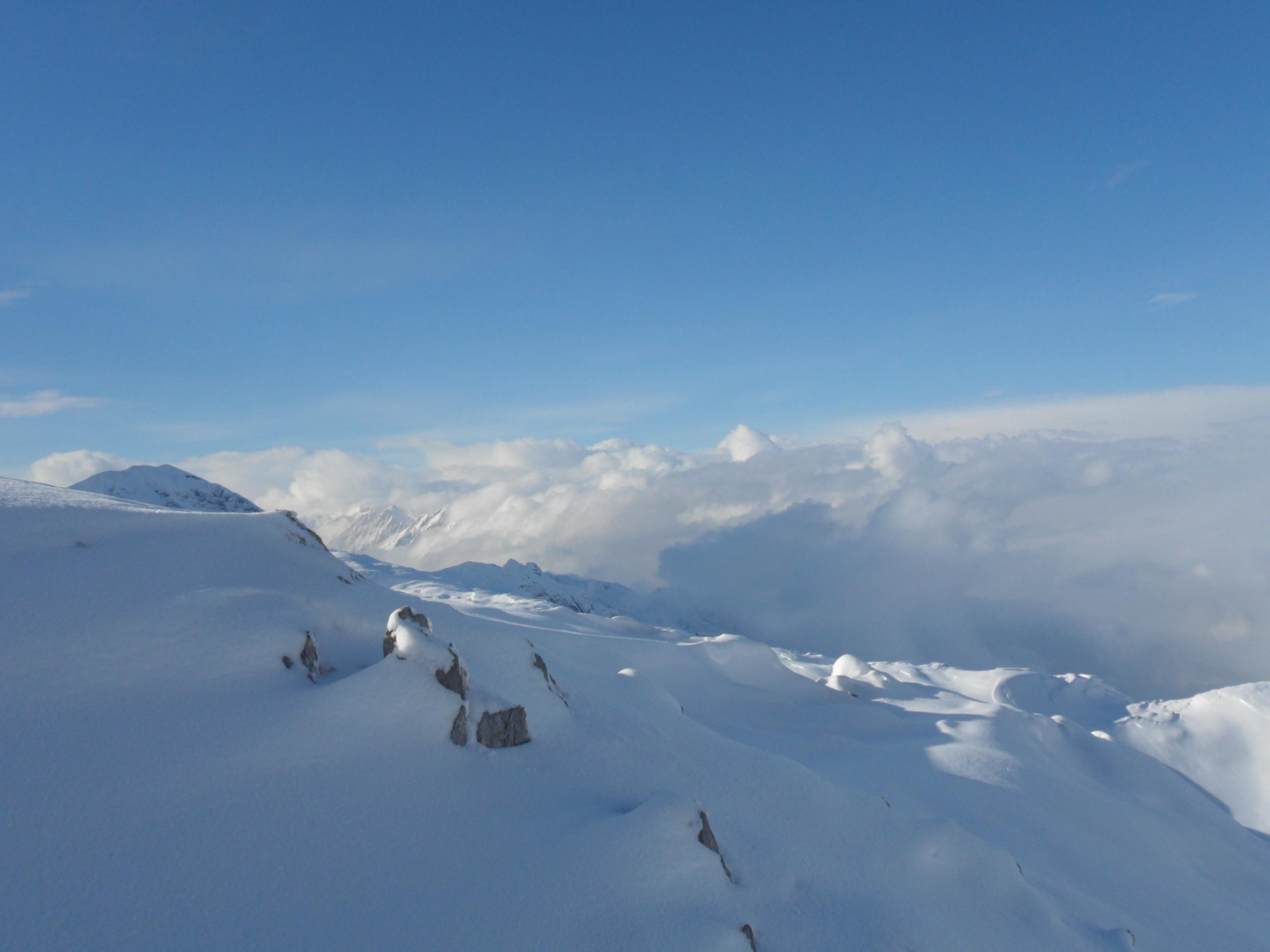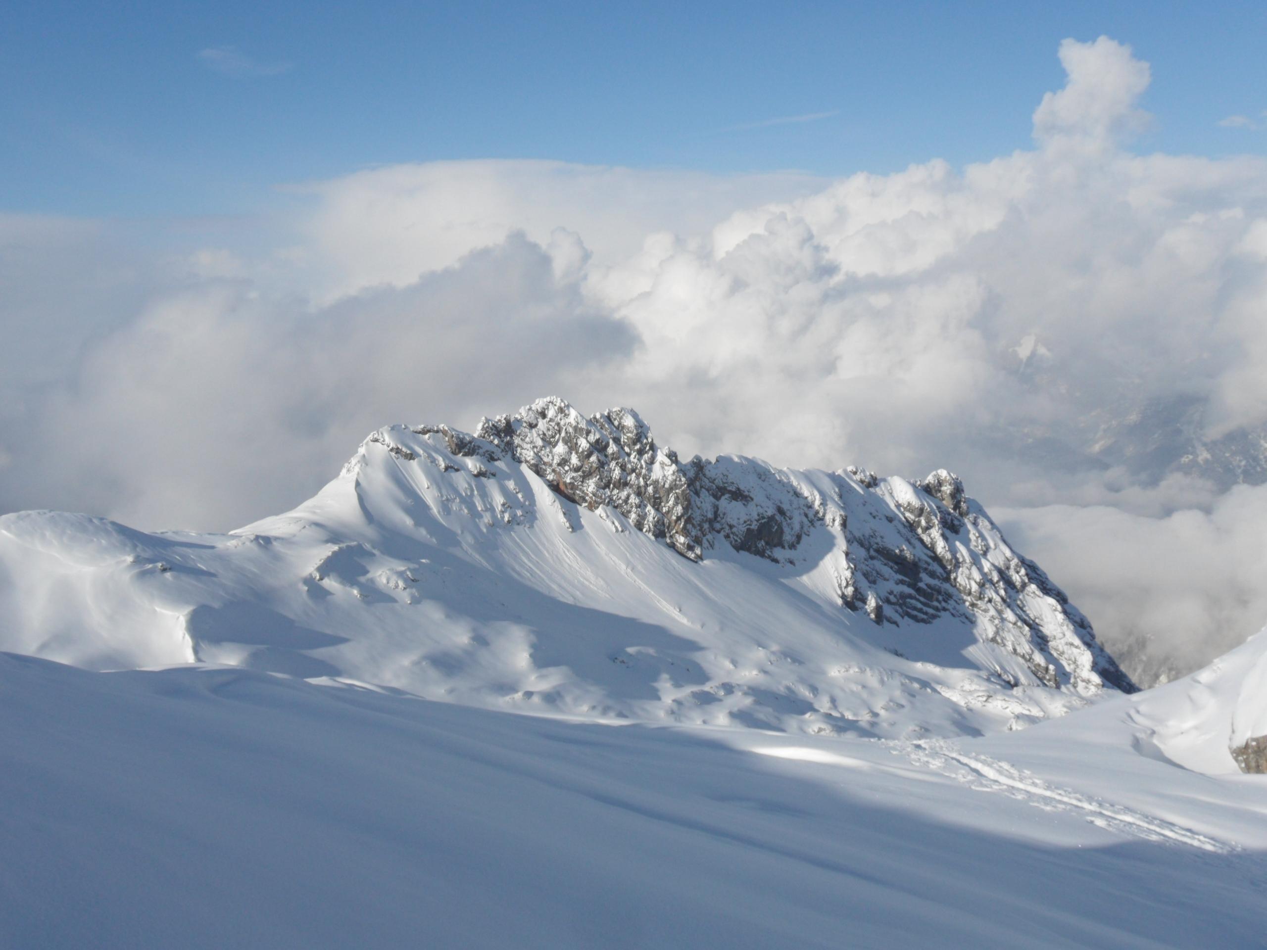 Wenn ich meinen Schwager zitieren darf. Der Scheiblingkogel?: "Ein einsames, steiles, geiles, weites Nordkar." Na dann wollten wir es mal nicht vereinsamen lassen. Mit dem Wetter haben wir auch gscheid Dusl ghabt. Die Wolken haben heute einen riesen Bogen um den Scheiblingkogel gemacht. Ab der zweiten Steilstufe sind wir immer unter blauen Himmel gegangen. Dazu Windstill, 30 cm lockeren Pulver auf einer Harschschicht.
