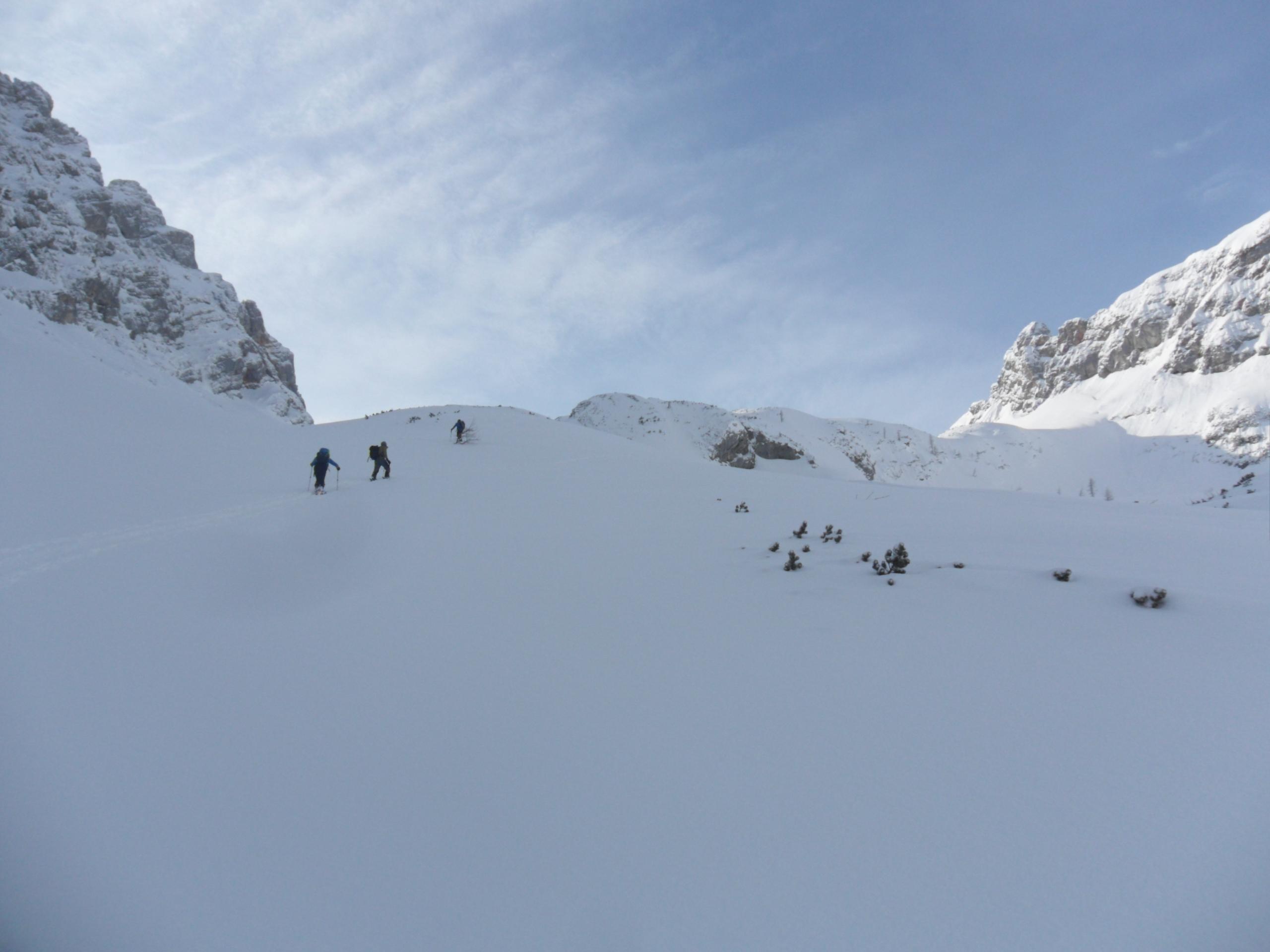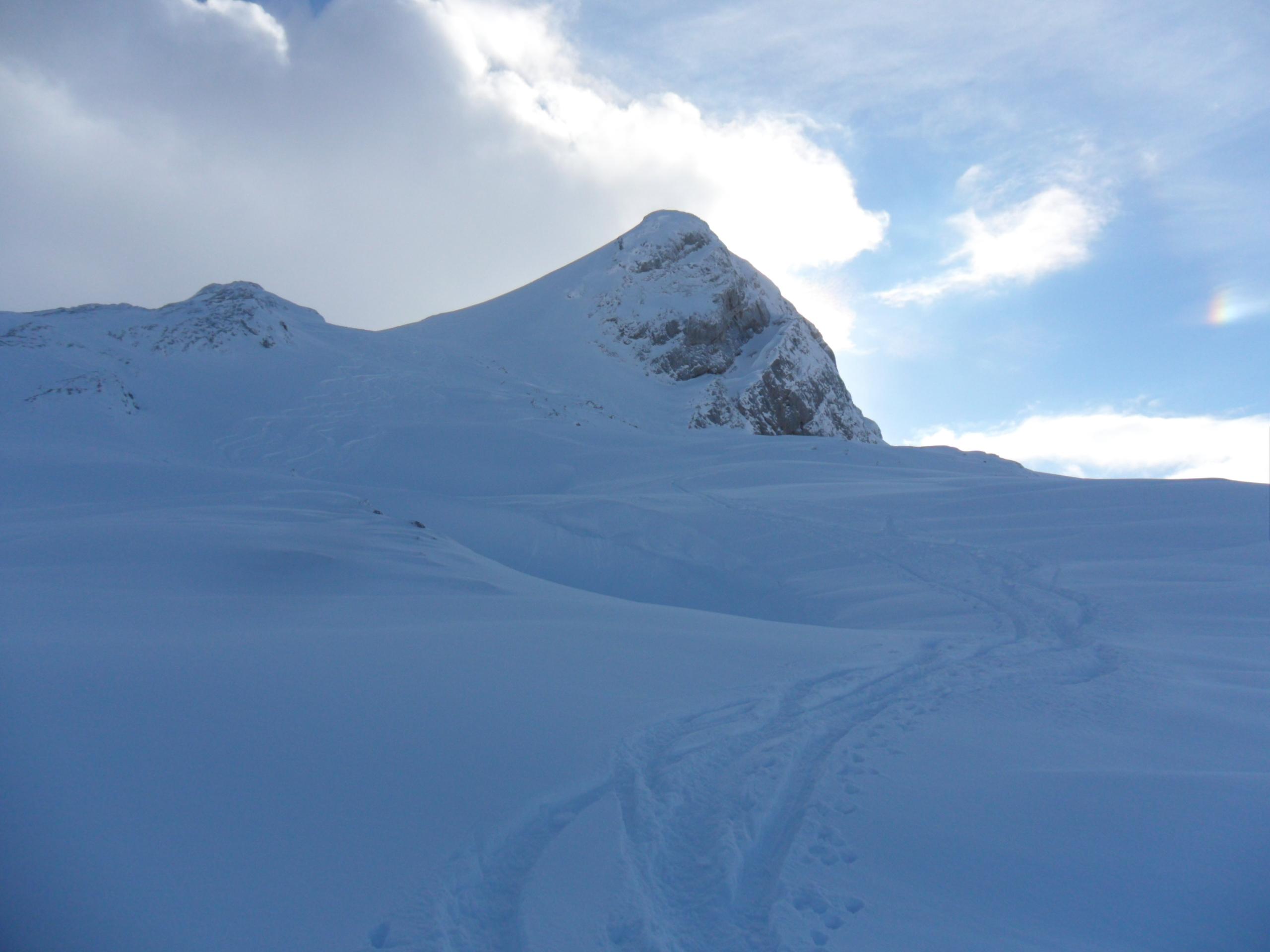 Die Einsamkeit muss man sich aber hart erarbeiten. Der Zustieg ist ordentlich. Die zwei Steilstufen können bei Aufstieg, wie Abfahrt herausfordernd sein und mit seinen 1800 Hm auch nicht gerade eine kleine Tour. Heute waren insgesamt gerade mal 7 Leute unterwegs.