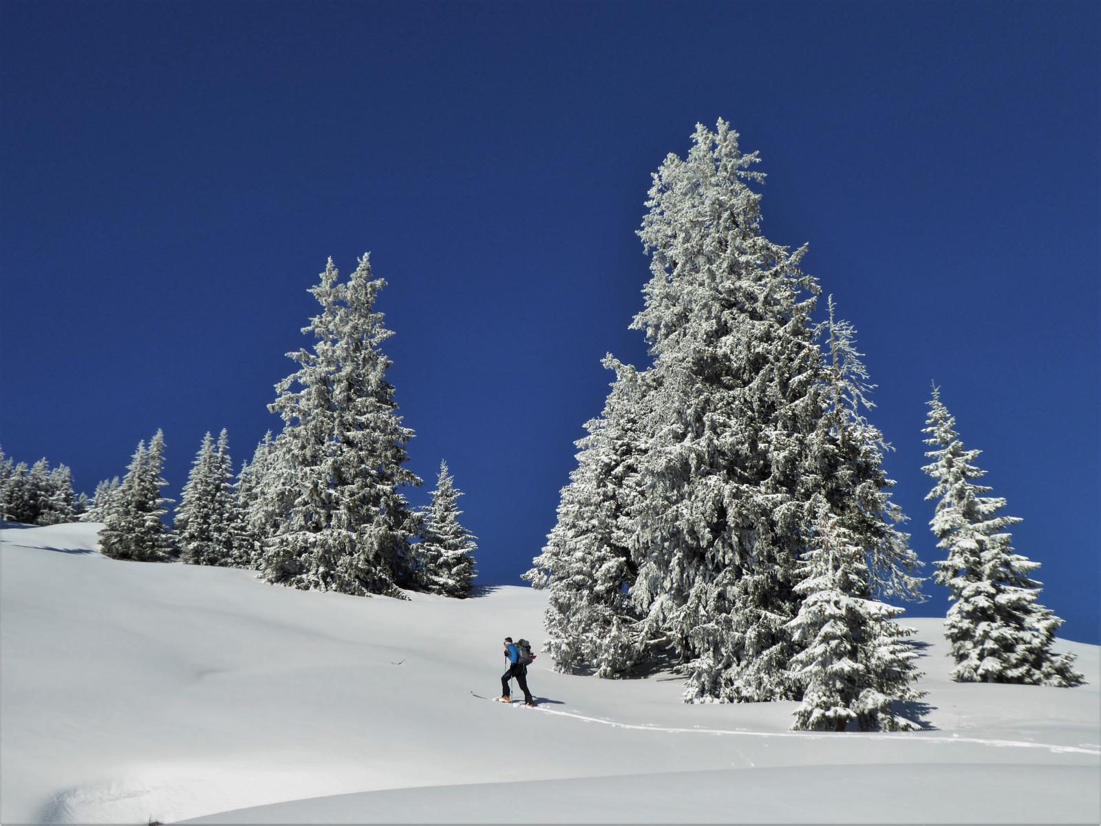 Unsere Wahl fiel heute auf die Klingspitze und wir haben es nicht bereut! Wir waren die Einzigen und durften vom Parkplatz im Hirschbachgraben über die Marbachhöhe bis auf die Klingspitze spuren. Abfahrt bis in die Einsattelung vor der Marbachhöhe entlang der Aufstiegsspur, von dort bei guten Bedingungen bis zur Reicheralm. Ab dort zunehmend schlechter, Triebschnee auf nicht immer tragender Altschneedecke.