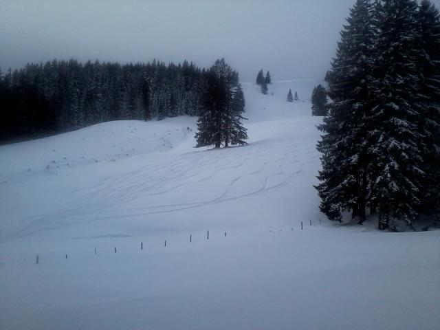 Guad geht´s am nördlichsten Tausender. Am PP Kohlhäusl/Anger um 9 Uhr beißende sibirische Kälte. Auf guter Unterlage liegen 20 cm lockerer Pulver. Auf den freien Flächen der Schneid schon windbehandelt und verpresst. Nordexponiert locker und ungebunden. Die Wechte in der Nähe der Stoisser Alm hat schon eine beachtliche Größe. Tabuzone. Nur für welche, die gerne mit Triebschneebrettern surfen. Der Fön-Wind war erst kurz vor der Schneid ein Thema