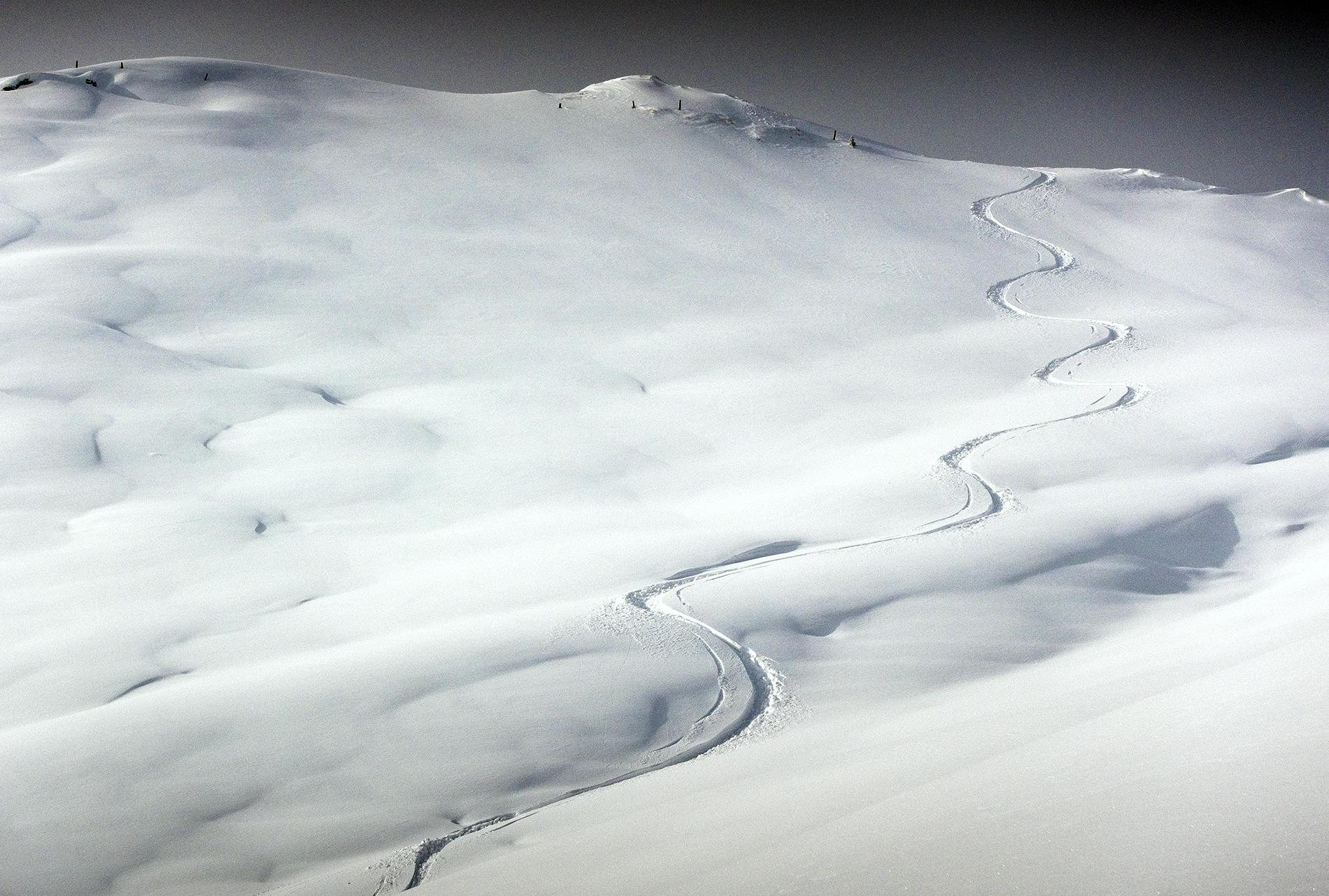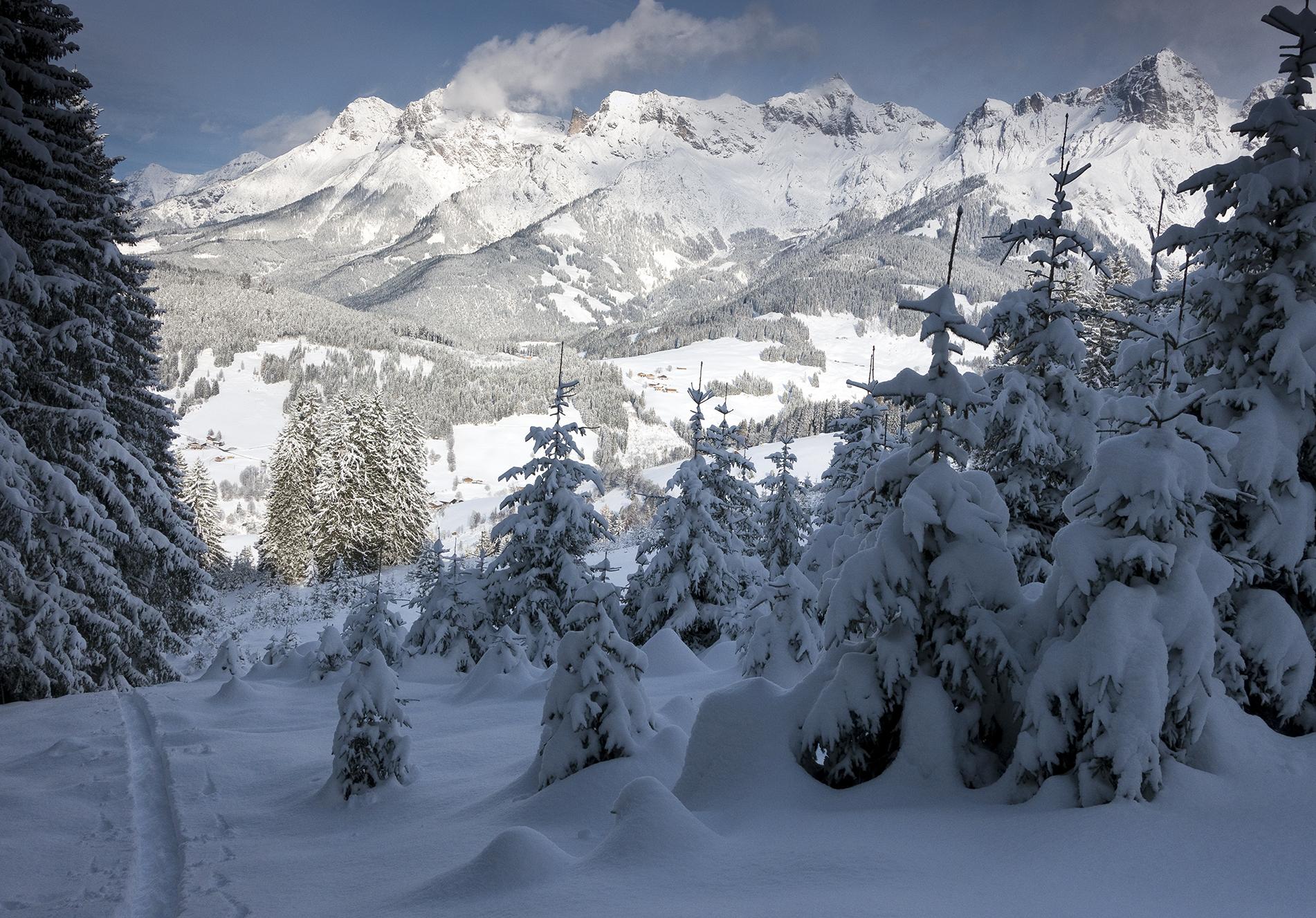 - von Hintermoos, immer gut für Pulverschnee, so auch heute! Alle Freiflächen über 1400m Höhe sind recht windbehandelt, der Schnee ist dort fest und teilweise verfrachtet. Das ist besonders auf der Westseite der Fall, die Ostseite war heute feiner zu befahren. Ganz unten über Hintermoos bis zur ersten Alm war der Schnee ohne Windeinfluss, tief und pulvrig, so dass ich dafür nochmal aufgestiegen bin. Leider wird die Warmfront das alles ändern.