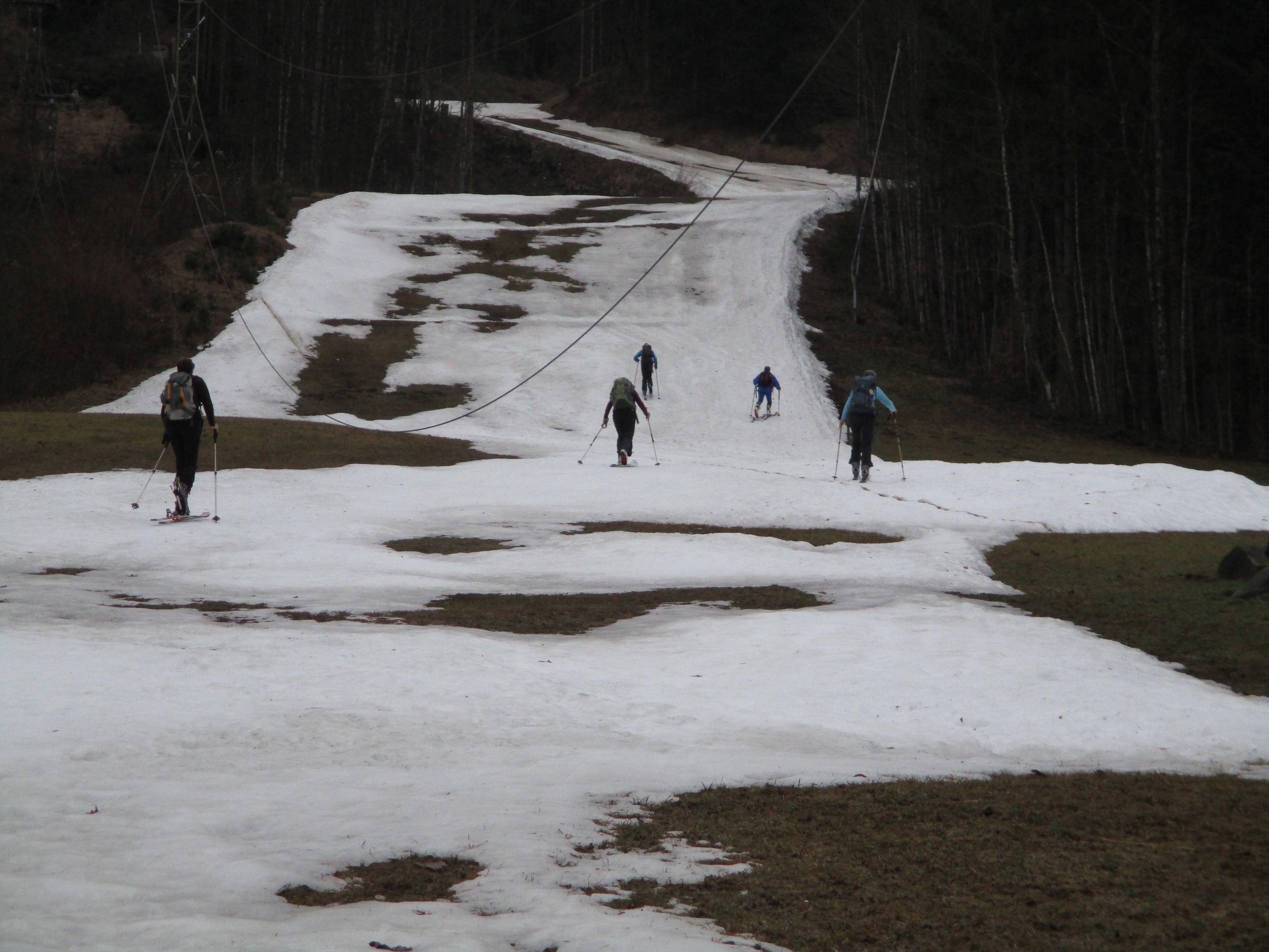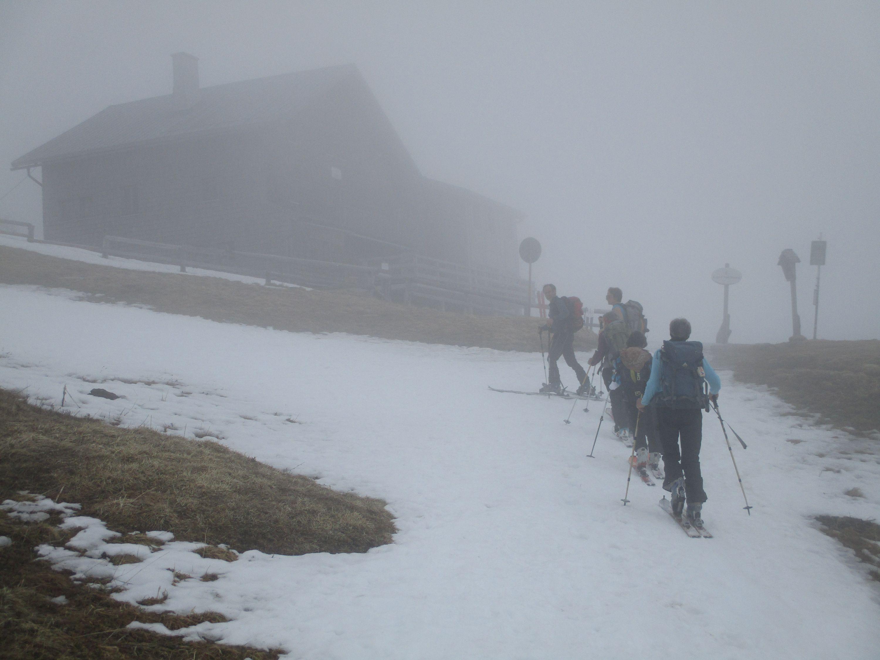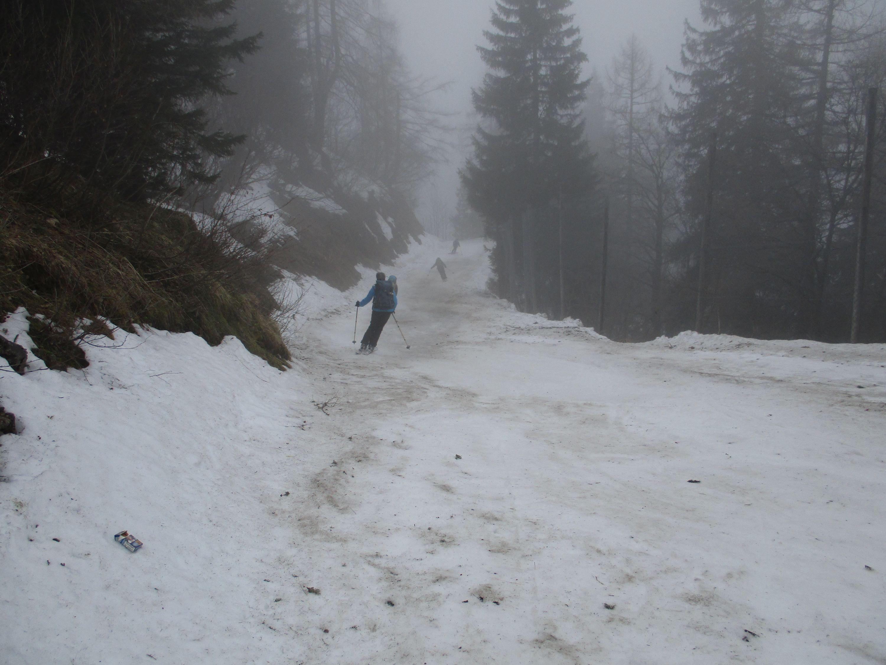 Vom Parkplatz Königssee über die Piste zum Stahlhaus, ca 100m aper der Rest hat eine durchgehende Schneedecke. Holzarbeiter sind im Einsatz- Piste war nicht gesperrt. Wetter : Nebel , mittags kurz sonnig, derzeit noch gute Abfahrtsverhältnisse .