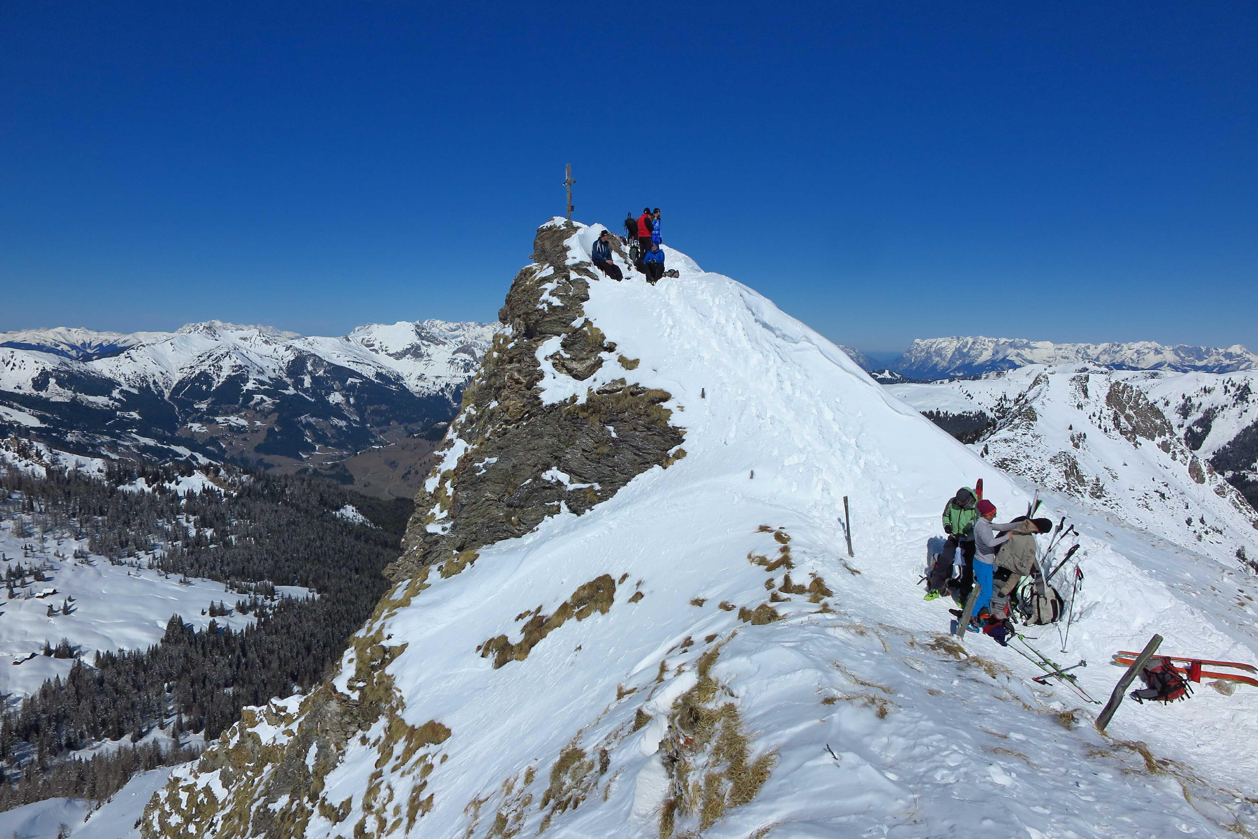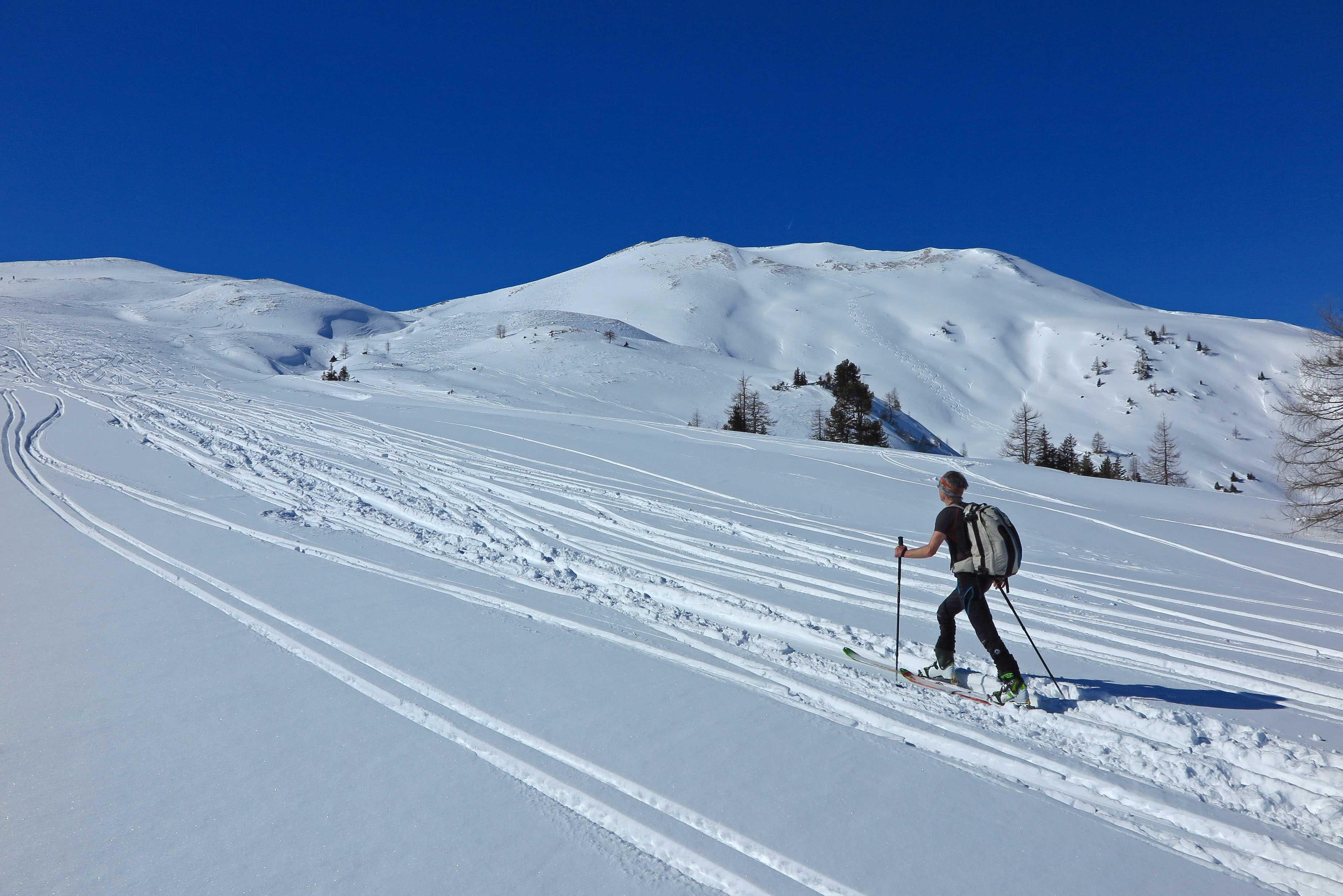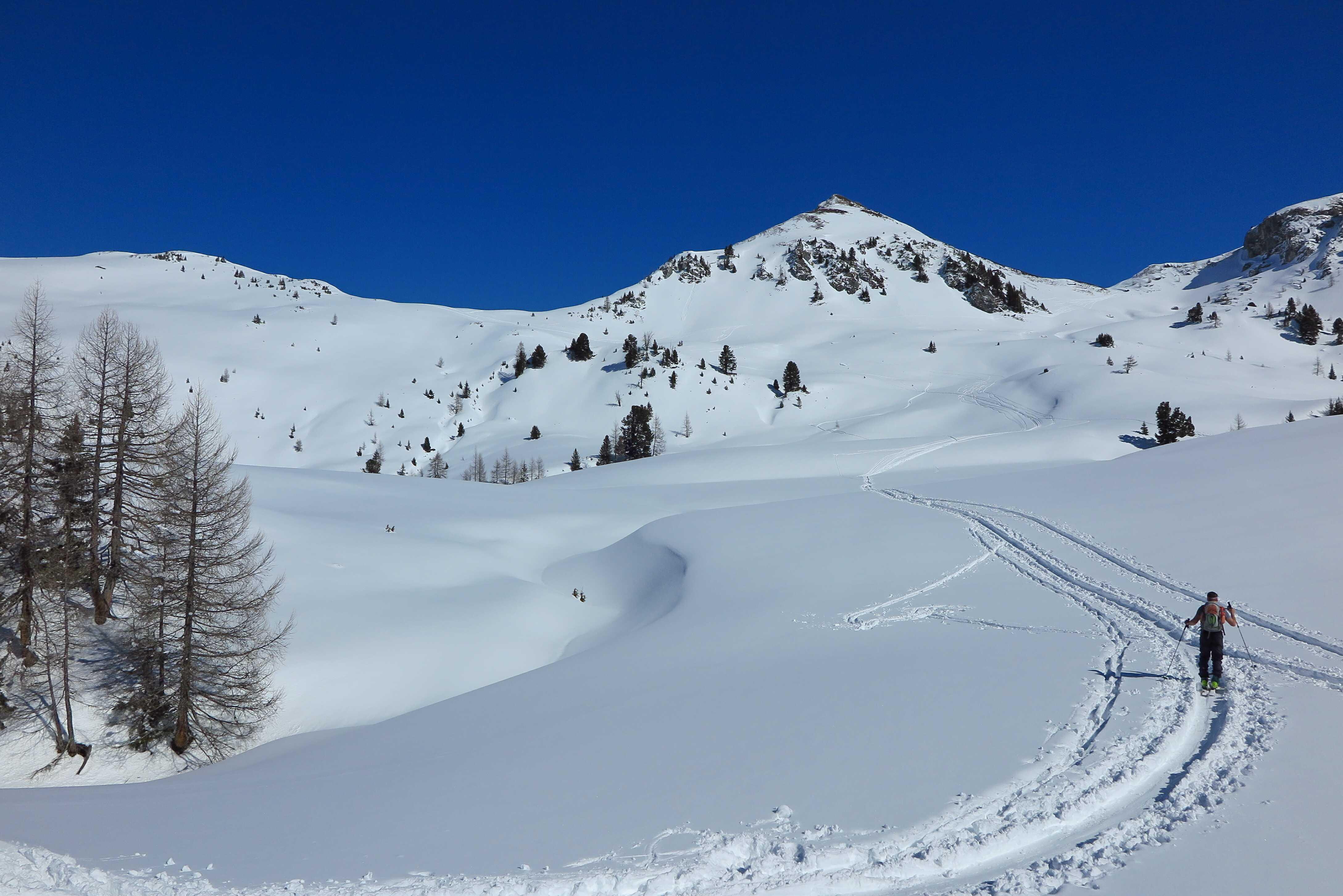 Von Grund im Ellmautal (ca. 1330) über die Loosbichlalm (1710) zum Filzmooshörndl (2189). Abfahrt über NO-Hang zur Loosbichlalm zurück und Wiederanstieg zum Loosbichl (2048). Abfahrt über die NW-Hänge zum PP.