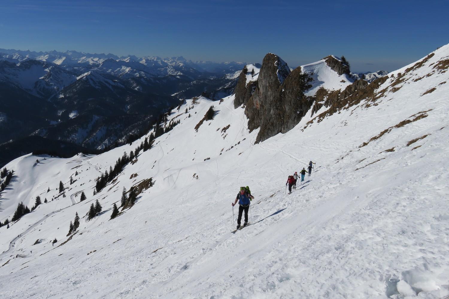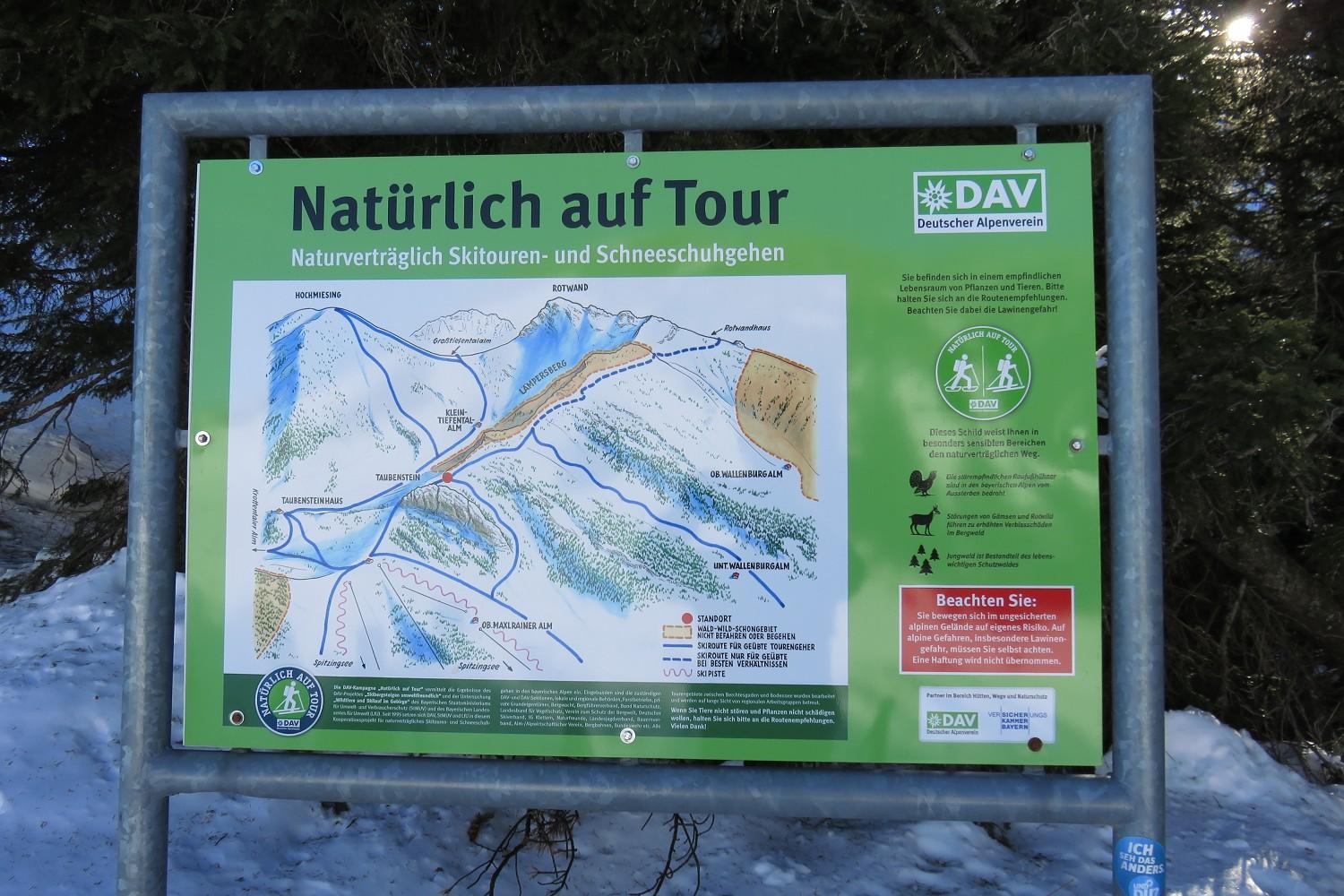 Hier wieder eine Skitour in den Münchner Hausbergen, diesmal jedoch außerhalb der Stadtgrenze, Einsamkeit ausgeschlossen. Schätze, dass dort täglich mehrere Hundert Tourengeher unterwegs sind. Alle Abfahrten, vor allen Dingen die vom Taubenstein, pistenmäßig eingefahren, deshalb muss niemand Angst vor wechselndem Schnee haben. Schneemenge bis auf die ersten 50 Meter nach den Scharten (Miesing, Taubenstein) und bei der Querung am Lämpersberg, die einen naturverträglichen Weg zwischen den Latschen nicht zulässt, ist ausreichend. Wetter und Temperaturen unten und oben wie bei allen anderen Einträgen in diesem Forum. Weitere Infos wie gewohnt bei gps-tour.info.