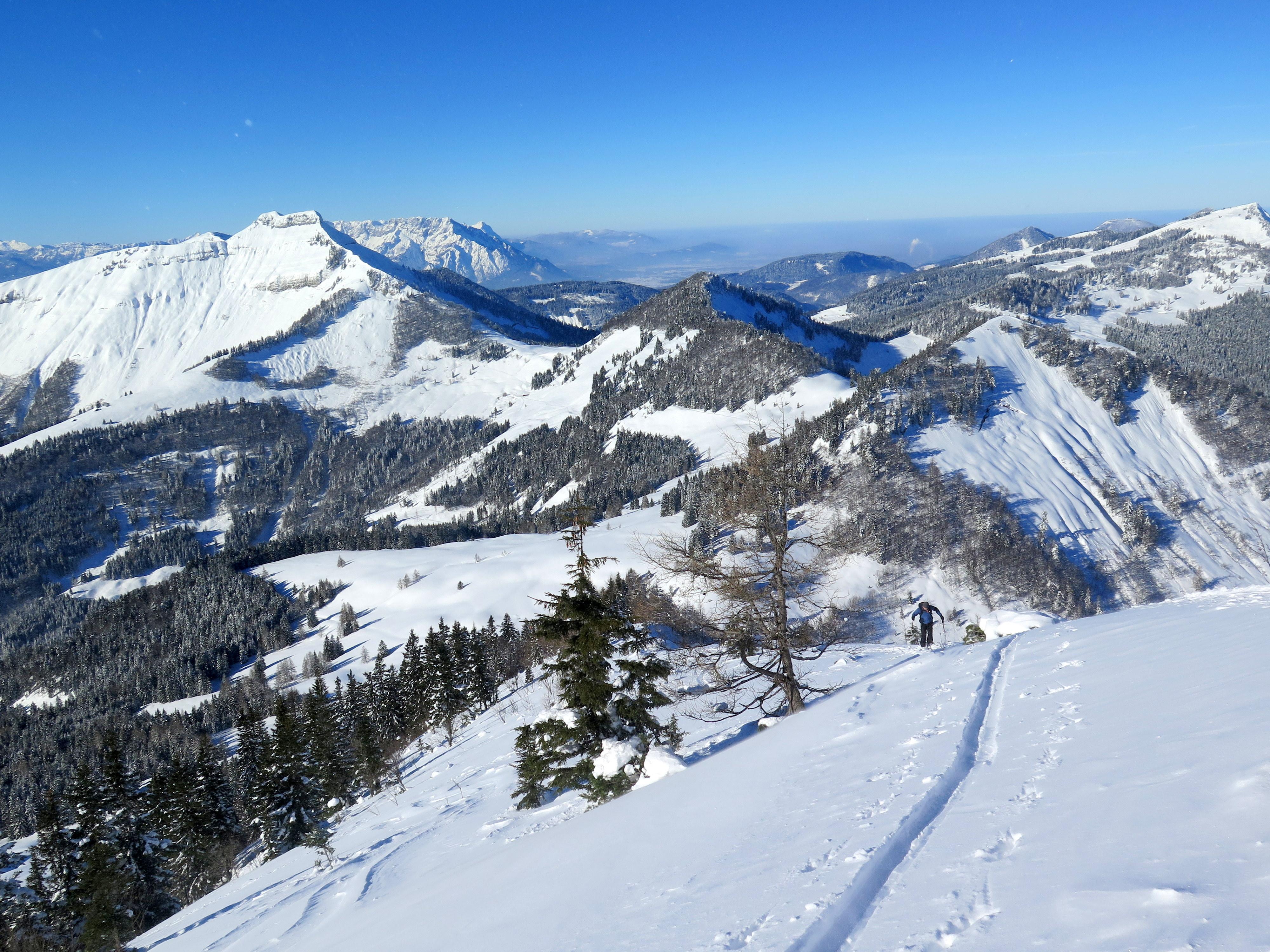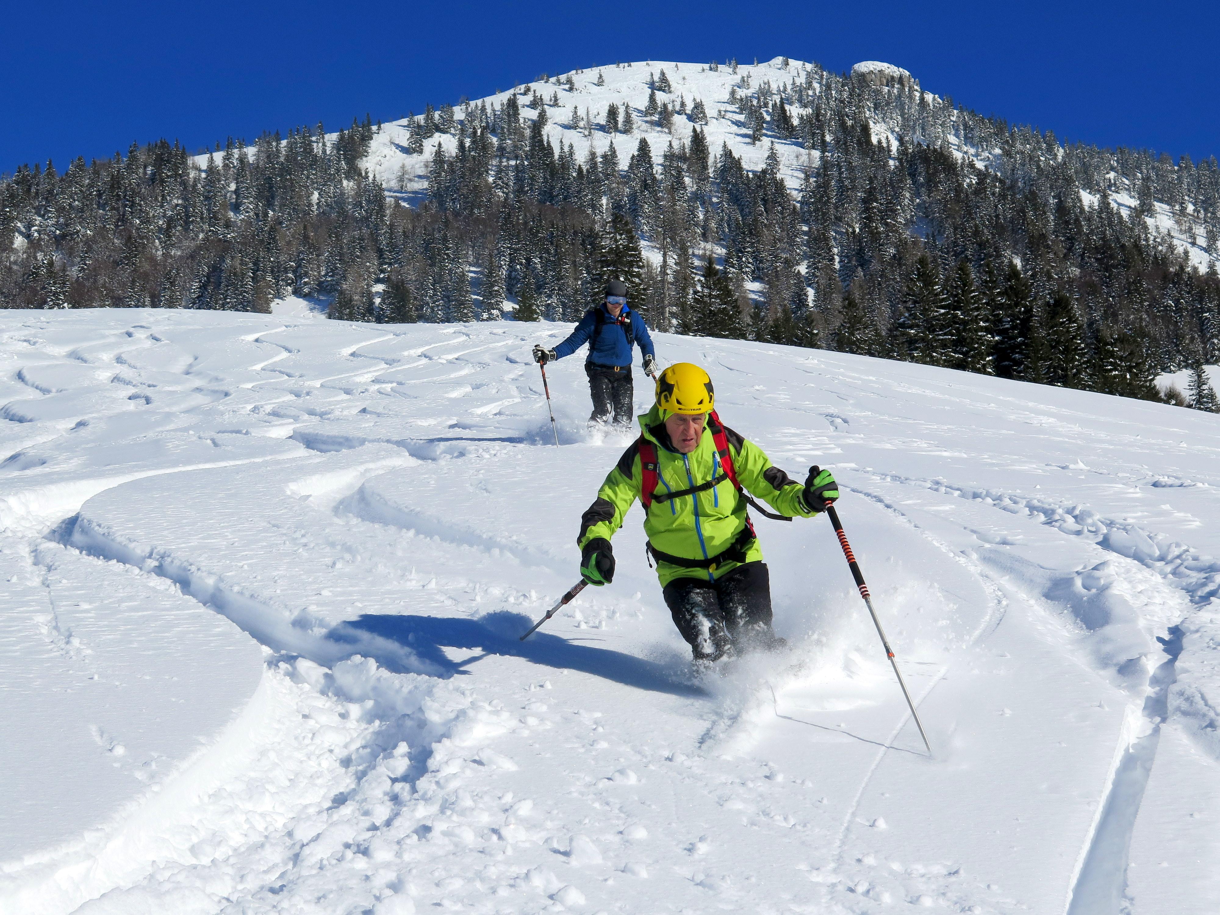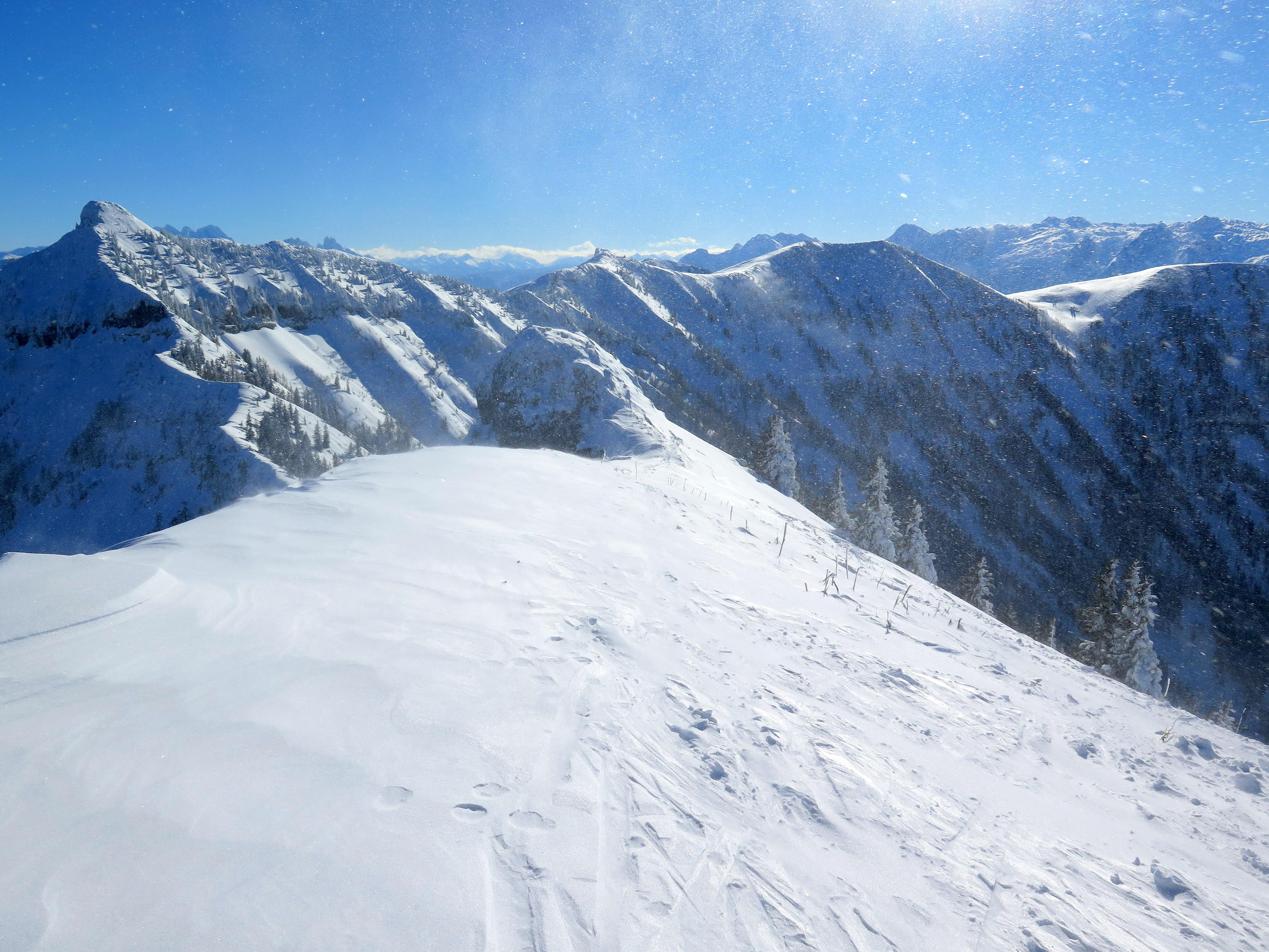 Aus dem schattig-kalten Tauglboden über Grundbichl und an der Storchenalm vorbei auf den W-exponierten Gipfelhang, nach zahlreichen Spitzkehren schließlich entlang des WNW-Gratrückens zum Gipfel. Die Schneefahnen auf allen Höhen rundum sprechen von kräftigem Südwind, der uns dann auch die Gipfelrast recht kurz halten lässt. Erhebliche Windverfrachtung und auch Sonnenwärme haben ihre Spuren im steileren Bereich des nach WSW schauenden Gipfelhanges hinterlassen - teilweise mehr als nur eine Haut auf dem tiefen Pulver! Bei günstigerem Sonneneinstrahlwinkel auf den flacheren Hängen im mittleren Abschnitt perfekter Raschel-Pulver, aber auch hier teilweise deutlicher Windeinfluss quer zum Hang, der alte Spuren einebnet. Im Waldgürtel bis hinunter nach Grundbichl genug Schnee für lustigen Natur-Slalom - nur fallweise etwas eng gesetzt.