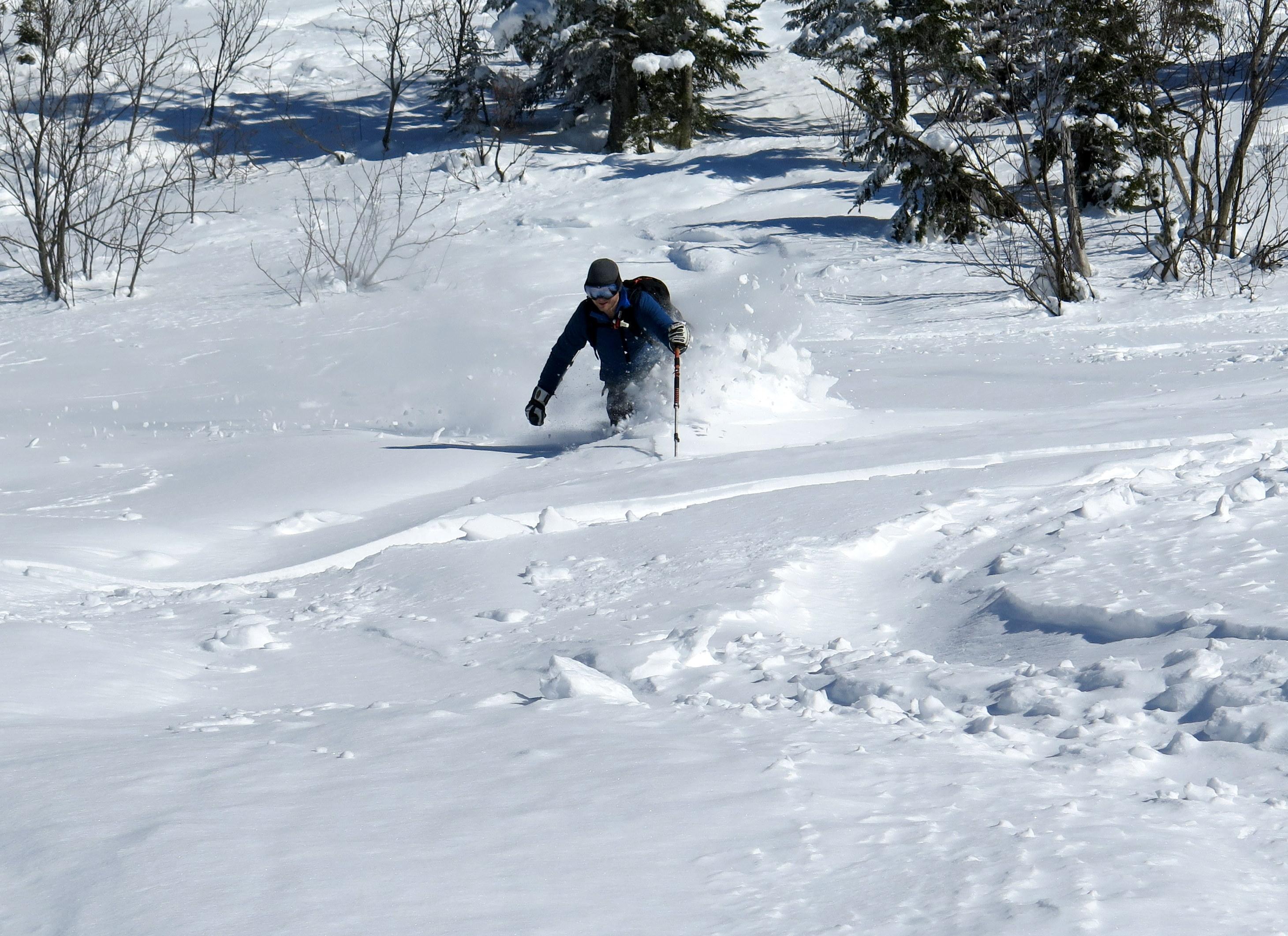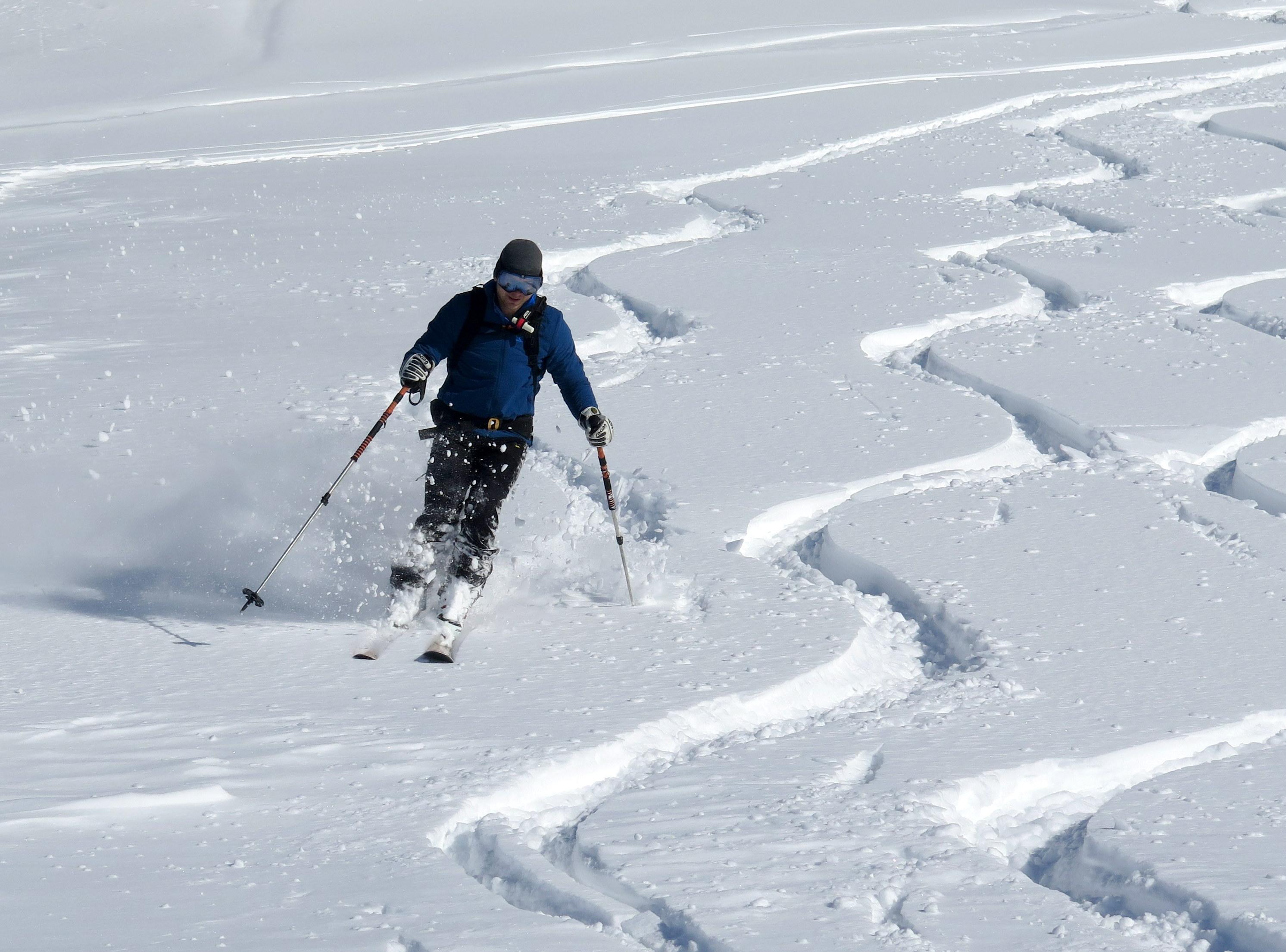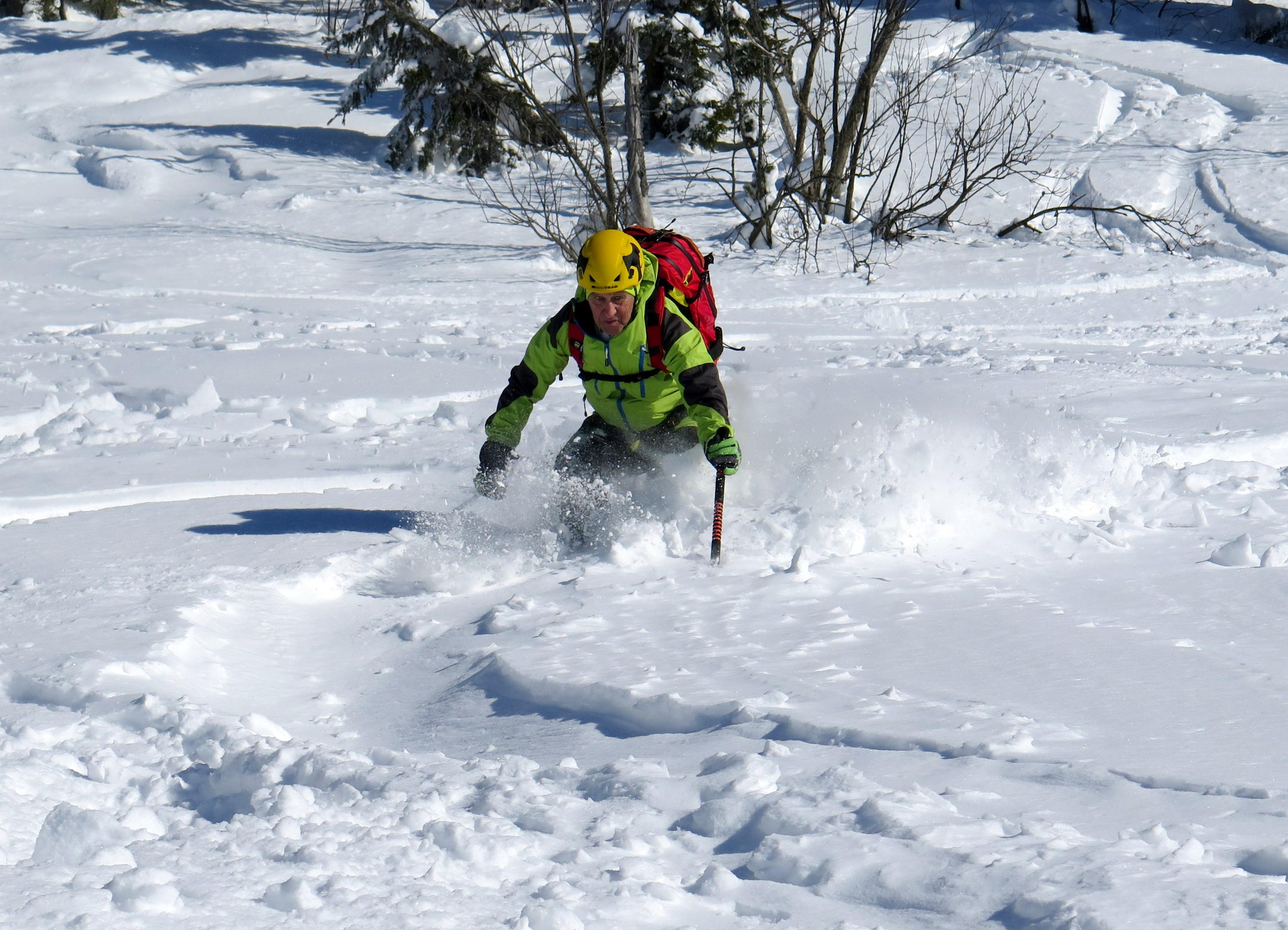 Aus dem schattig-kalten Tauglboden über Grundbichl und an der Storchenalm vorbei auf den W-exponierten Gipfelhang, nach zahlreichen Spitzkehren schließlich entlang des WNW-Gratrückens zum Gipfel. Die Schneefahnen auf allen Höhen rundum sprechen von kräftigem Südwind, der uns dann auch die Gipfelrast recht kurz halten lässt. Erhebliche Windverfrachtung und auch Sonnenwärme haben ihre Spuren im steileren Bereich des nach WSW schauenden Gipfelhanges hinterlassen - teilweise mehr als nur eine Haut auf dem tiefen Pulver! Bei günstigerem Sonneneinstrahlwinkel auf den flacheren Hängen im mittleren Abschnitt perfekter Raschel-Pulver, aber auch hier teilweise deutlicher Windeinfluss quer zum Hang, der alte Spuren einebnet. Im Waldgürtel bis hinunter nach Grundbichl genug Schnee für lustigen Natur-Slalom - nur fallweise etwas eng gesetzt.
