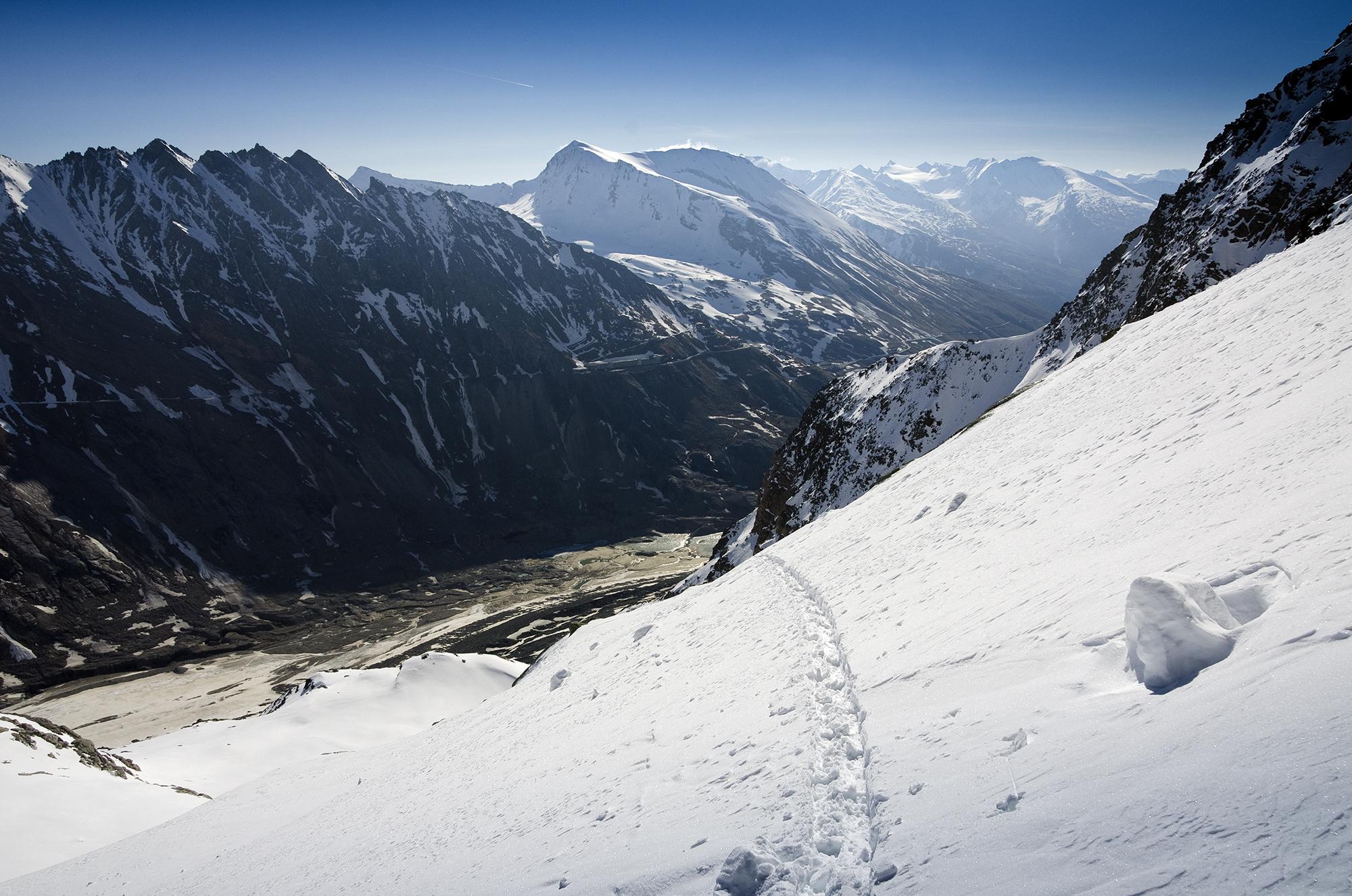 Von der Pasterze auf den Großglockner steigen, ja da muss man sogar selber spuren! Mach' ich ja gern, aber wenn es dann auch noch stollt.... ! Alles vergessen, wenn man allein im Sonnenschein eine Stunde am Gipfel genießen kann. Was für ein Saisonabschluß!