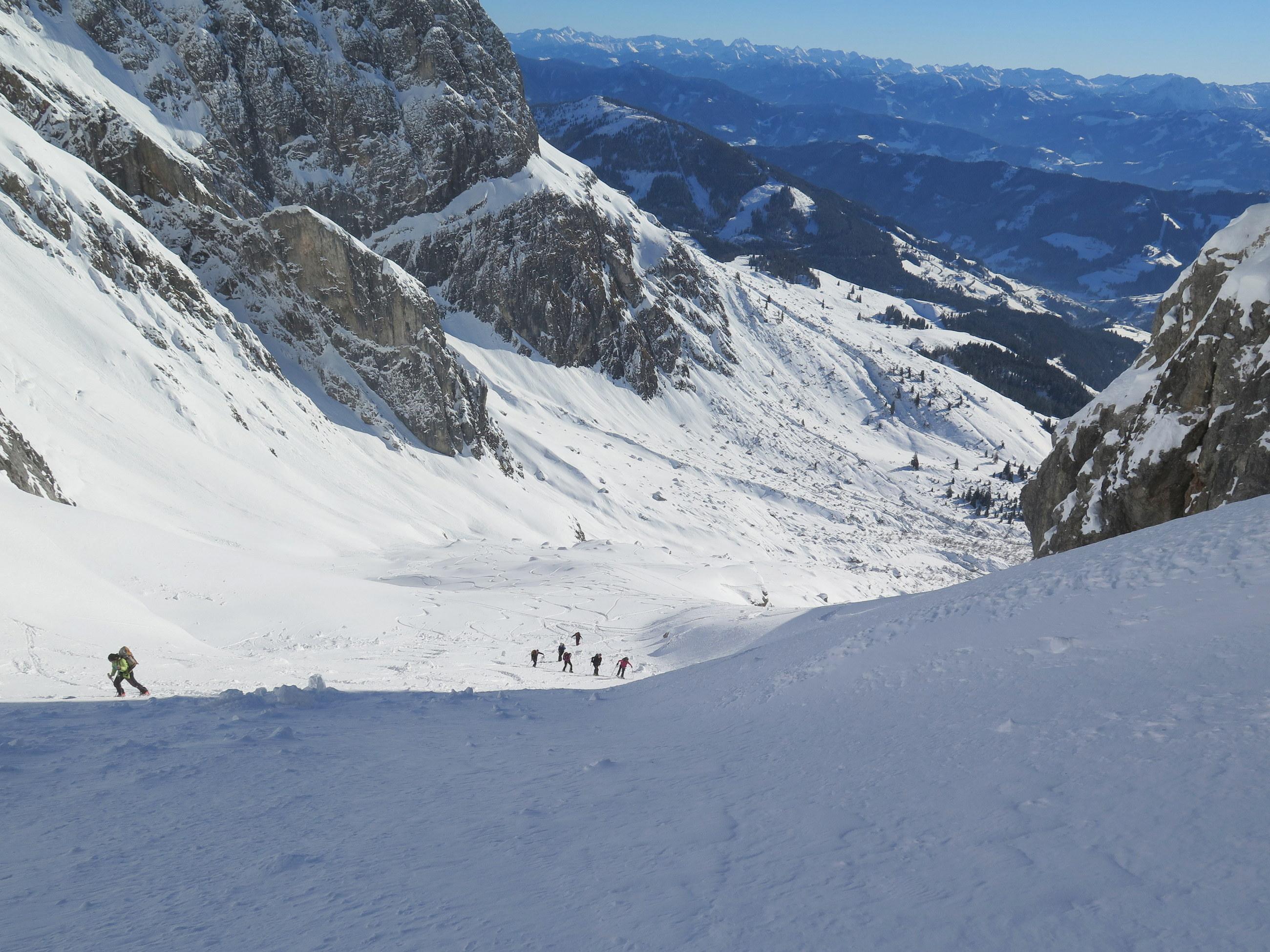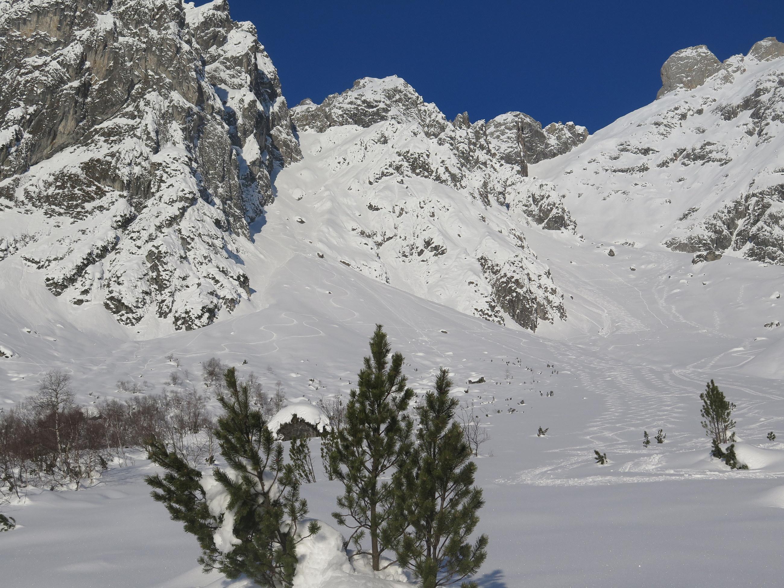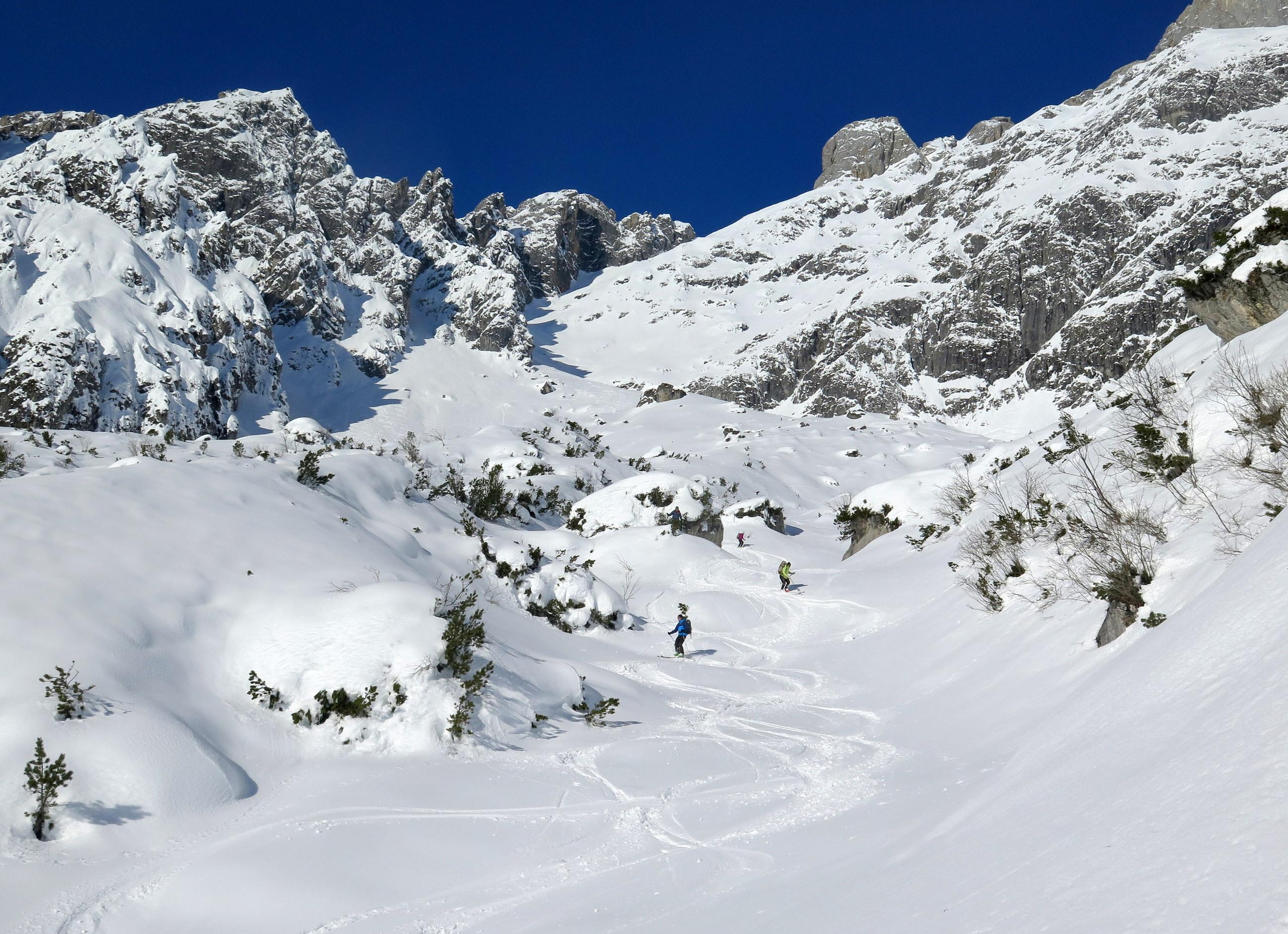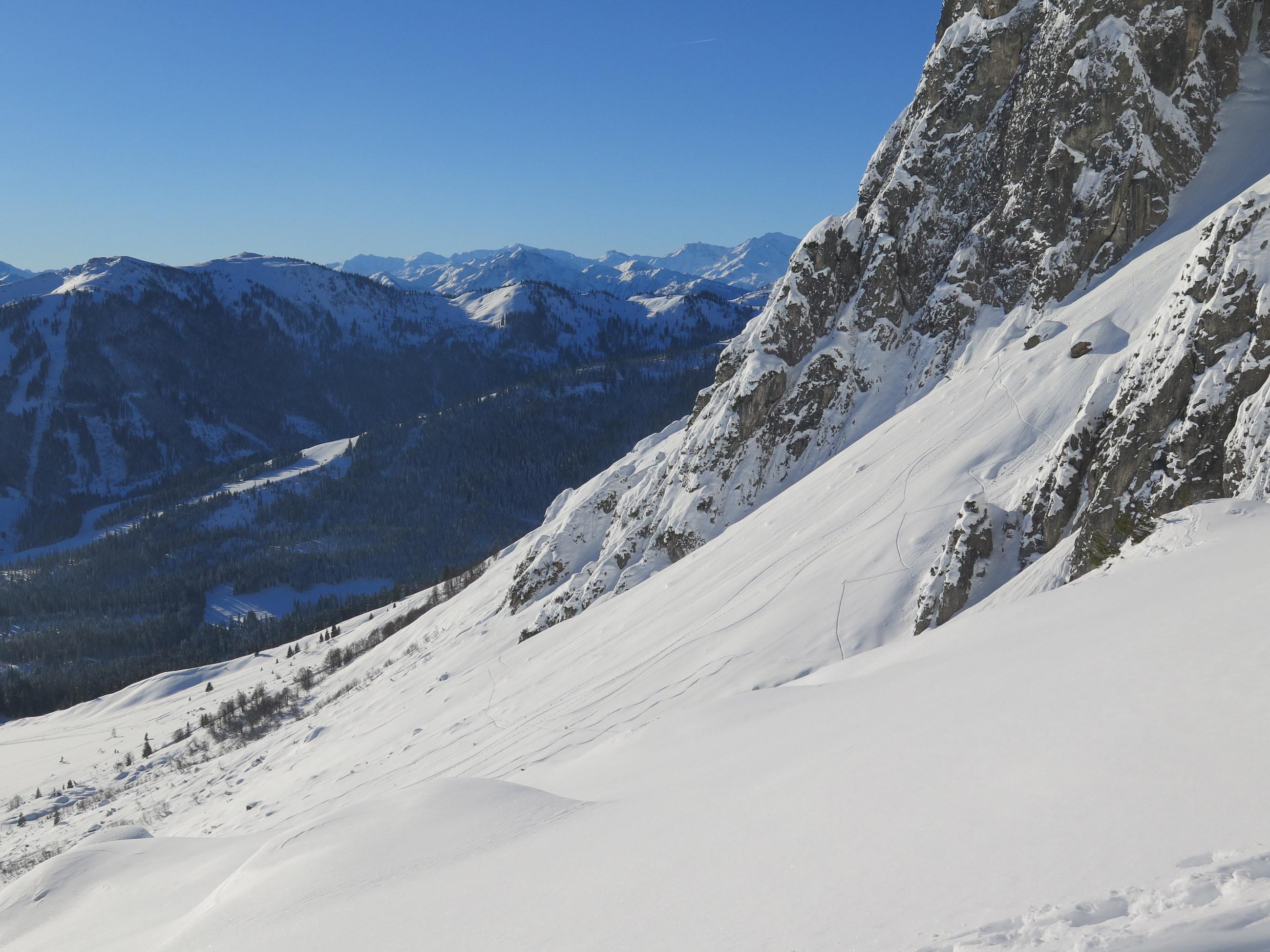 Der jüngste Eintrag von Bgf. W. Aschauer war Motivation genug, uns heute auch im Birgkar auf die Suche nach dem perfekten Pulver zu machen. Wir wurden nicht enttäuscht. Praktisch windstill, grandiose Fernsicht und verhältnismäßig milde Temperaturen im sonnigen Anstieg - ein Tag wie ein Geschenk! Oberhalb des Jausensteins ist bis zur angedeuteten Einsattelung noch gut gesetzter Pulver mit eher geringer Einsinktiefe anzutreffen, darüber wird der Schnee zunehmend verdichtet, vermutlich durch die Kaltluft, die von der Engstelle über der ersten Aufsteilung aus dem Birgkar herunterstreicht. Außerdem liegen in diesem Bereich auch zahlreiche teilweise ziemlich kompakte Bruchstücke von Wechten, die von den darüberliegenden Felsen in Richtung Taghaube stammen dürften. In der Abfahrt sind die eher östlich schauenden Geländeabschnitte zu bevorzugen, hier ist der Pulver noch völlig unverdorben. Aber auch weiter unten finden sich ausreichend Mulden und Gräben, in denen man zwischen Sonnseite (= schon mit Haut!) und Schattseite (=mit bestens gesetztem Pulver in Raschel-Qualität) unterscheiden kann. Zahlreiche Varianten in Richtung Taghaube sind angespurt. Wer beim Aufstieg die Augen aufmacht, der kann auch nach dem guten Besuch im Birgkar heute sicherlich immer noch einiges an attraktiven unverspurten Hangabschnitten finden.