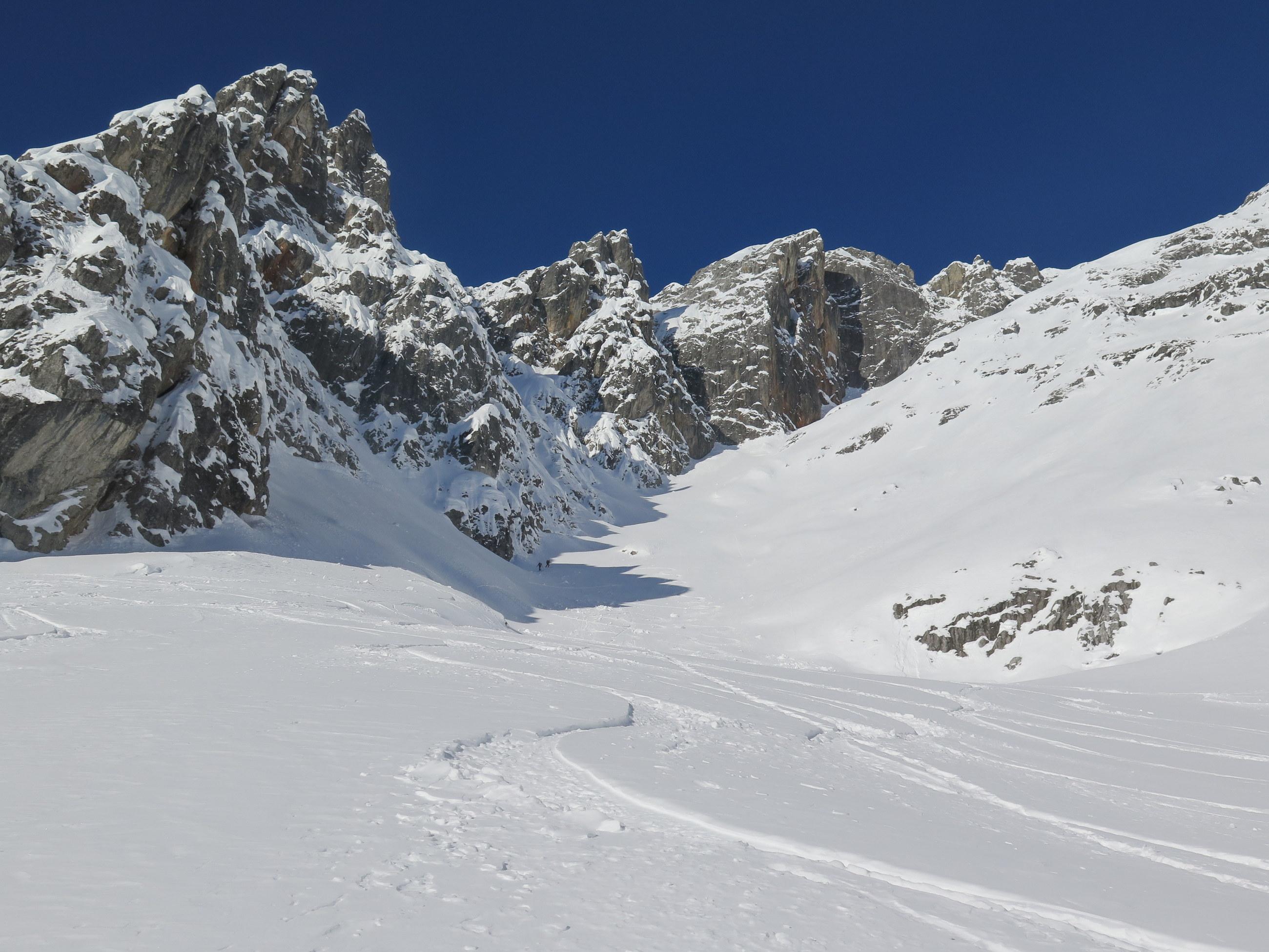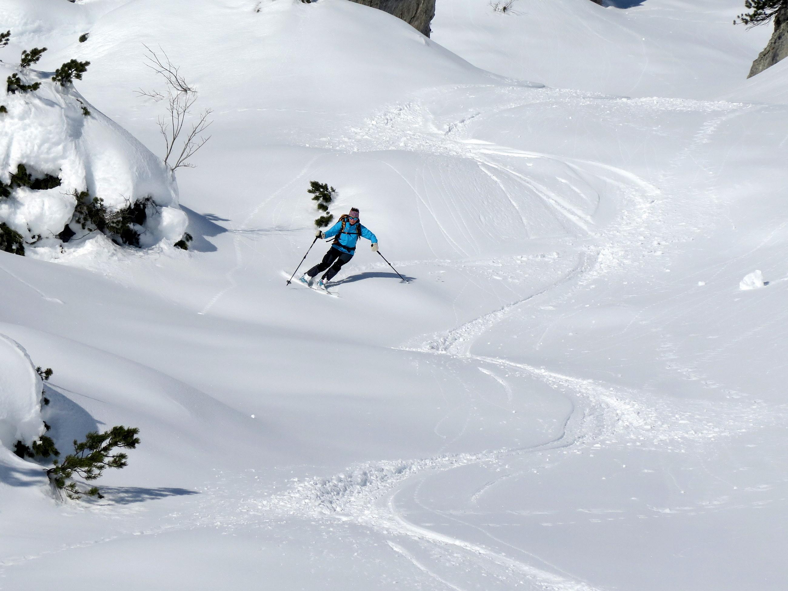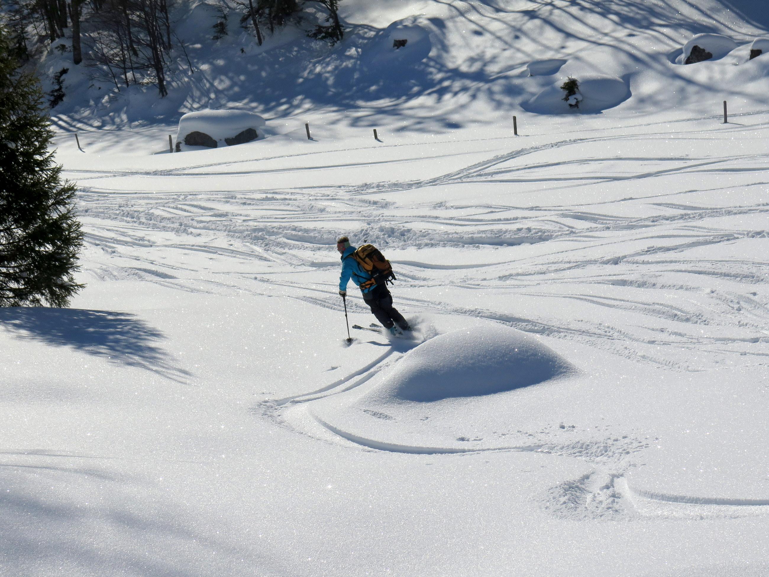 Der jüngste Eintrag von Bgf. W. Aschauer war Motivation genug, uns heute auch im Birgkar auf die Suche nach dem perfekten Pulver zu machen. Wir wurden nicht enttäuscht. Praktisch windstill, grandiose Fernsicht und verhältnismäßig milde Temperaturen im sonnigen Anstieg - ein Tag wie ein Geschenk! Oberhalb des Jausensteins ist bis zur angedeuteten Einsattelung noch gut gesetzter Pulver mit eher geringer Einsinktiefe anzutreffen, darüber wird der Schnee zunehmend verdichtet, vermutlich durch die Kaltluft, die von der Engstelle über der ersten Aufsteilung aus dem Birgkar herunterstreicht. Außerdem liegen in diesem Bereich auch zahlreiche teilweise ziemlich kompakte Bruchstücke von Wechten, die von den darüberliegenden Felsen in Richtung Taghaube stammen dürften. In der Abfahrt sind die eher östlich schauenden Geländeabschnitte zu bevorzugen, hier ist der Pulver noch völlig unverdorben. Aber auch weiter unten finden sich ausreichend Mulden und Gräben, in denen man zwischen Sonnseite (= schon mit Haut!) und Schattseite (=mit bestens gesetztem Pulver in Raschel-Qualität) unterscheiden kann. Zahlreiche Varianten in Richtung Taghaube sind angespurt. Wer beim Aufstieg die Augen aufmacht, der kann auch nach dem guten Besuch im Birgkar heute sicherlich immer noch einiges an attraktiven unverspurten Hangabschnitten finden.