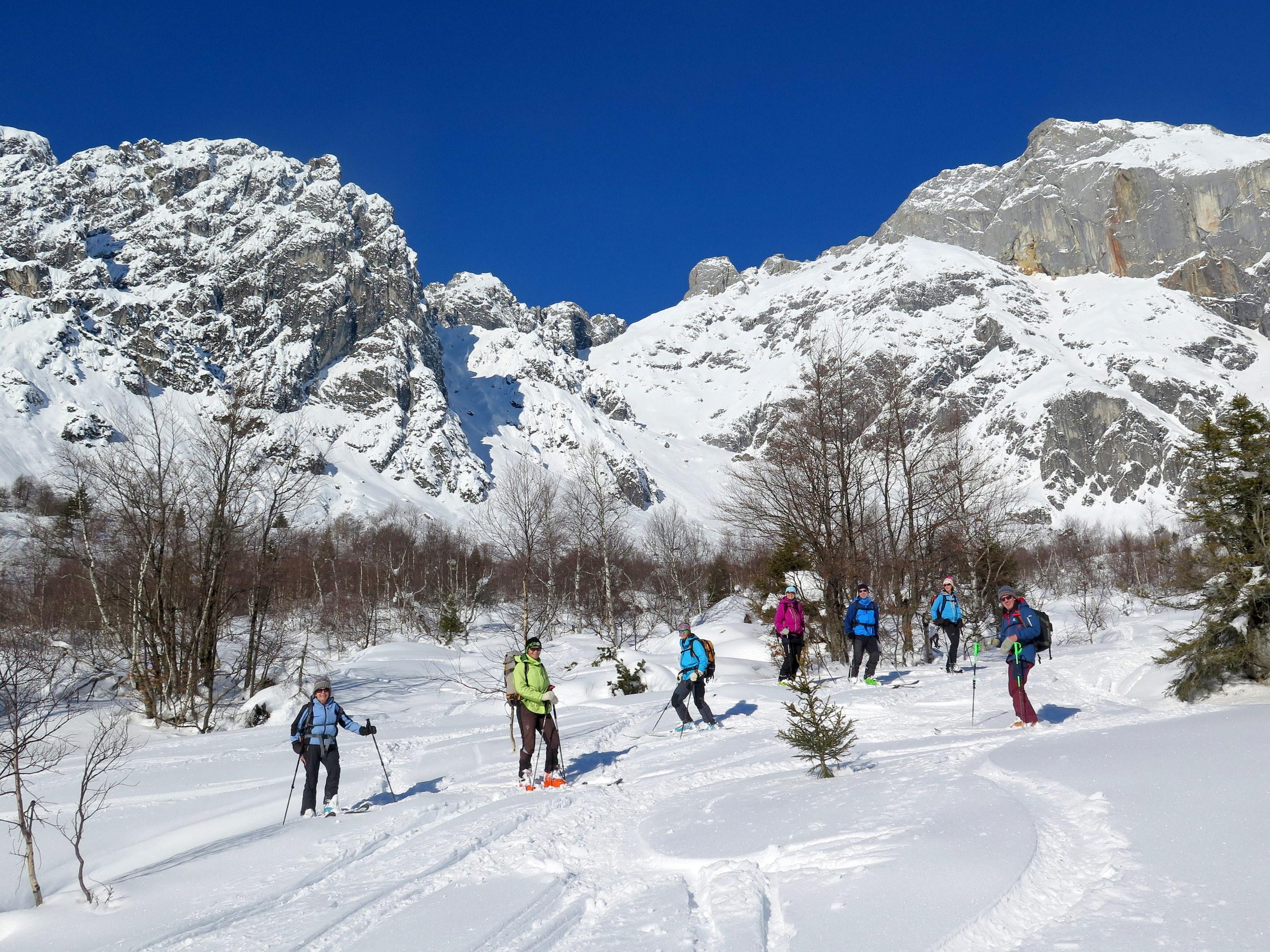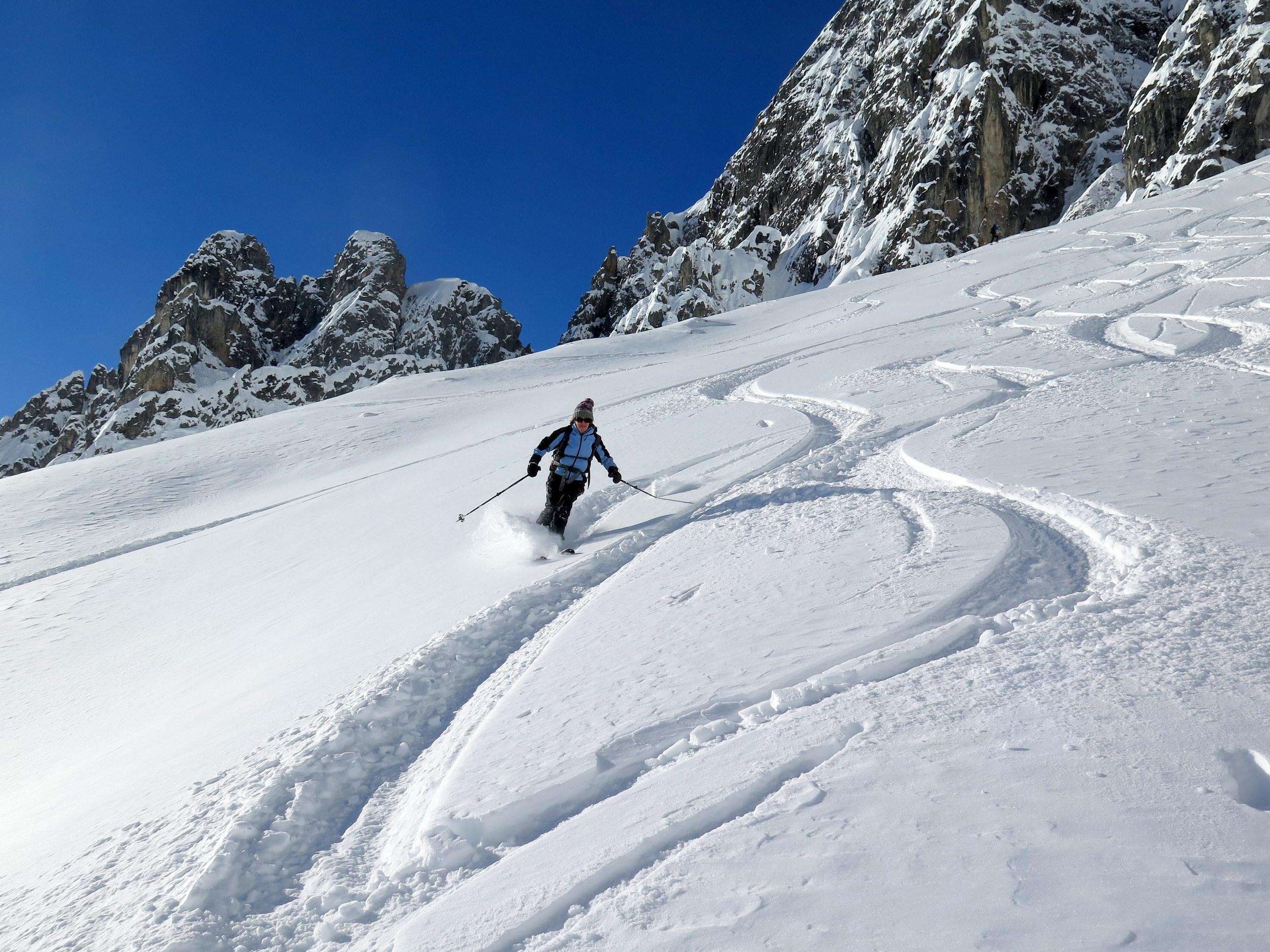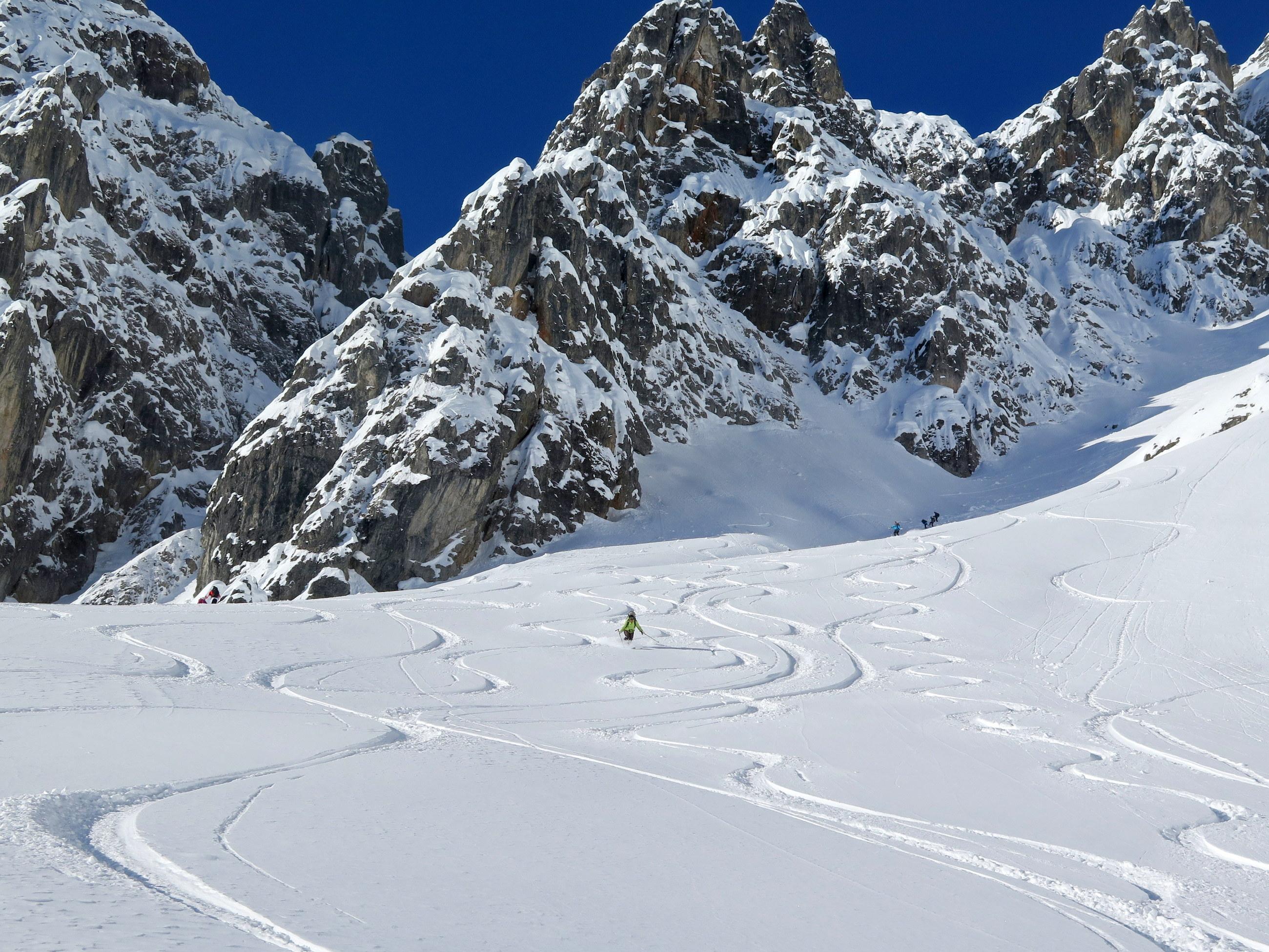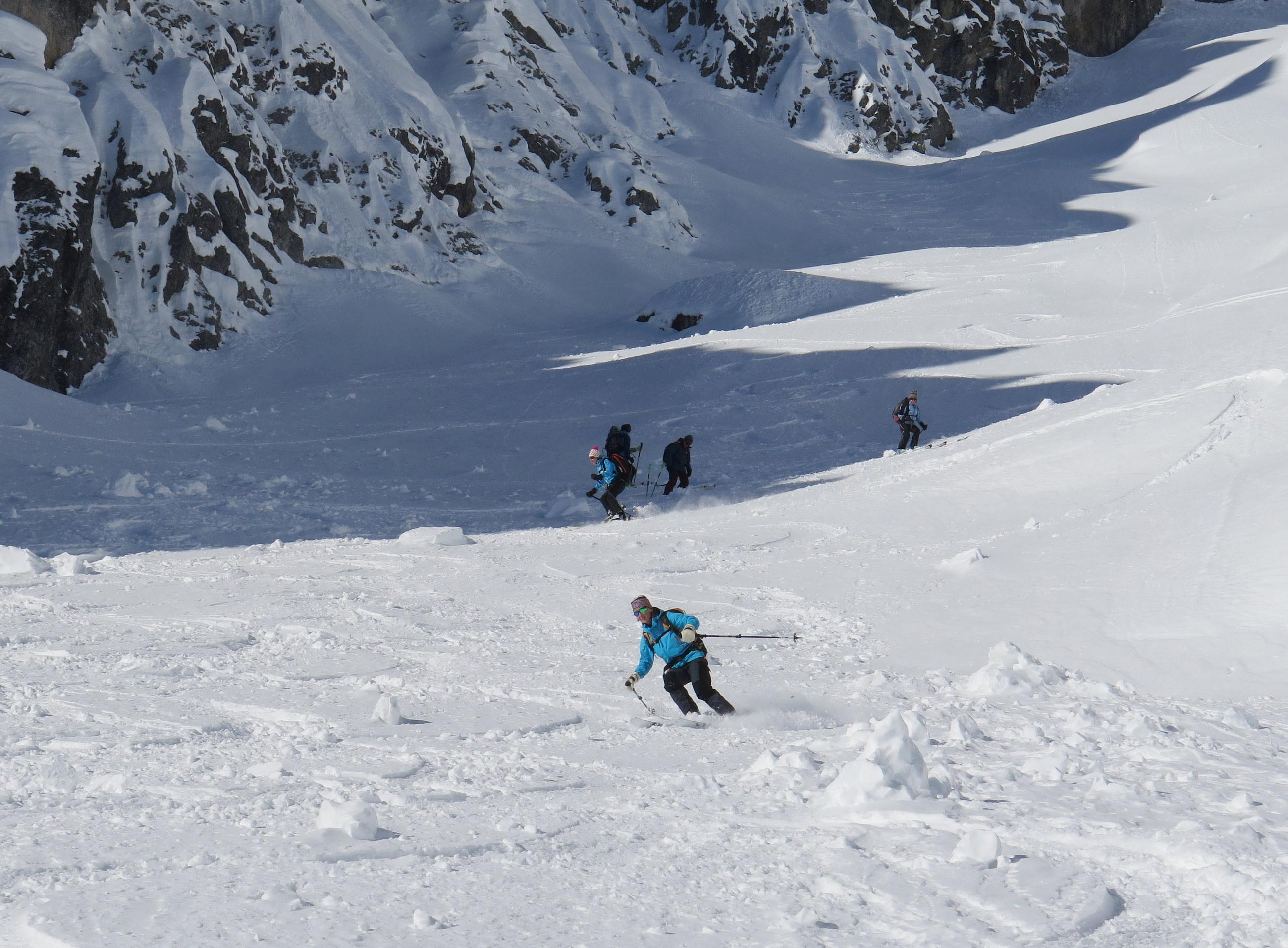 Der jüngste Eintrag von Bgf. W. Aschauer war Motivation genug, uns heute auch im Birgkar auf die Suche nach dem perfekten Pulver zu machen. Wir wurden nicht enttäuscht. Praktisch windstill, grandiose Fernsicht und verhältnismäßig milde Temperaturen im sonnigen Anstieg - ein Tag wie ein Geschenk! Oberhalb des Jausensteins ist bis zur angedeuteten Einsattelung noch gut gesetzter Pulver mit eher geringer Einsinktiefe anzutreffen, darüber wird der Schnee zunehmend verdichtet, vermutlich durch die Kaltluft, die von der Engstelle über der ersten Aufsteilung aus dem Birgkar herunterstreicht. Außerdem liegen in diesem Bereich auch zahlreiche teilweise ziemlich kompakte Bruchstücke von Wechten, die von den darüberliegenden Felsen in Richtung Taghaube stammen dürften. In der Abfahrt sind die eher östlich schauenden Geländeabschnitte zu bevorzugen, hier ist der Pulver noch völlig unverdorben. Aber auch weiter unten finden sich ausreichend Mulden und Gräben, in denen man zwischen Sonnseite (= schon mit Haut!) und Schattseite (=mit bestens gesetztem Pulver in Raschel-Qualität) unterscheiden kann. Zahlreiche Varianten in Richtung Taghaube sind angespurt. Wer beim Aufstieg die Augen aufmacht, der kann auch nach dem guten Besuch im Birgkar heute sicherlich immer noch einiges an attraktiven unverspurten Hangabschnitten finden.