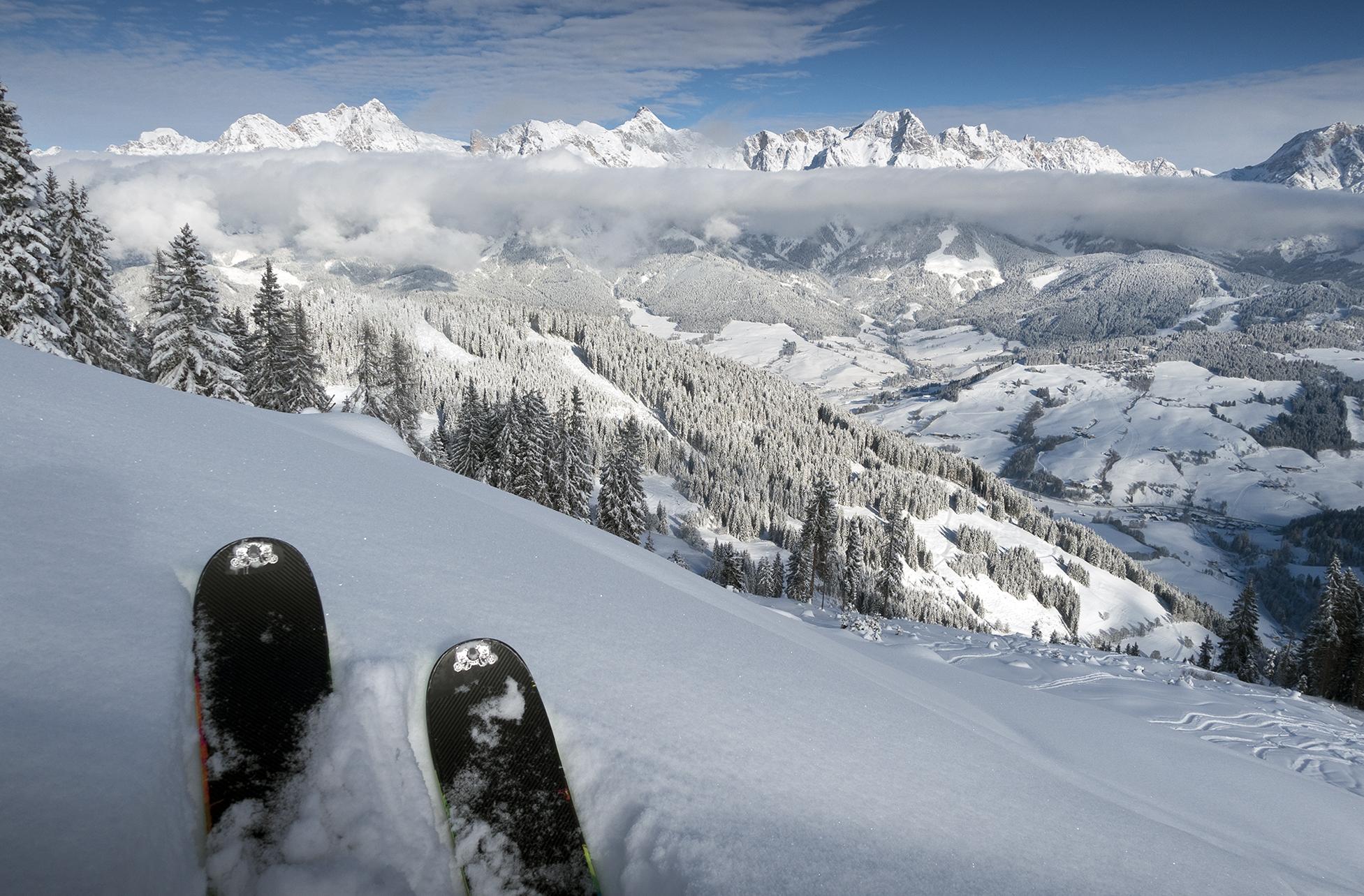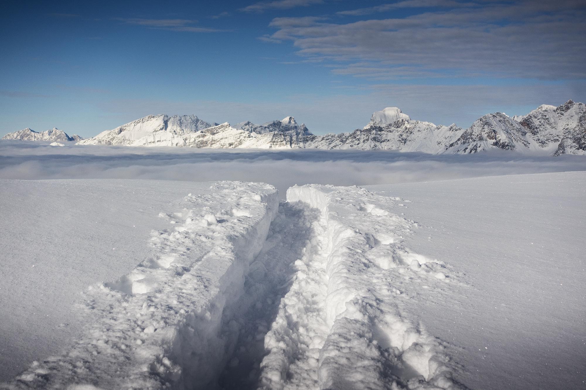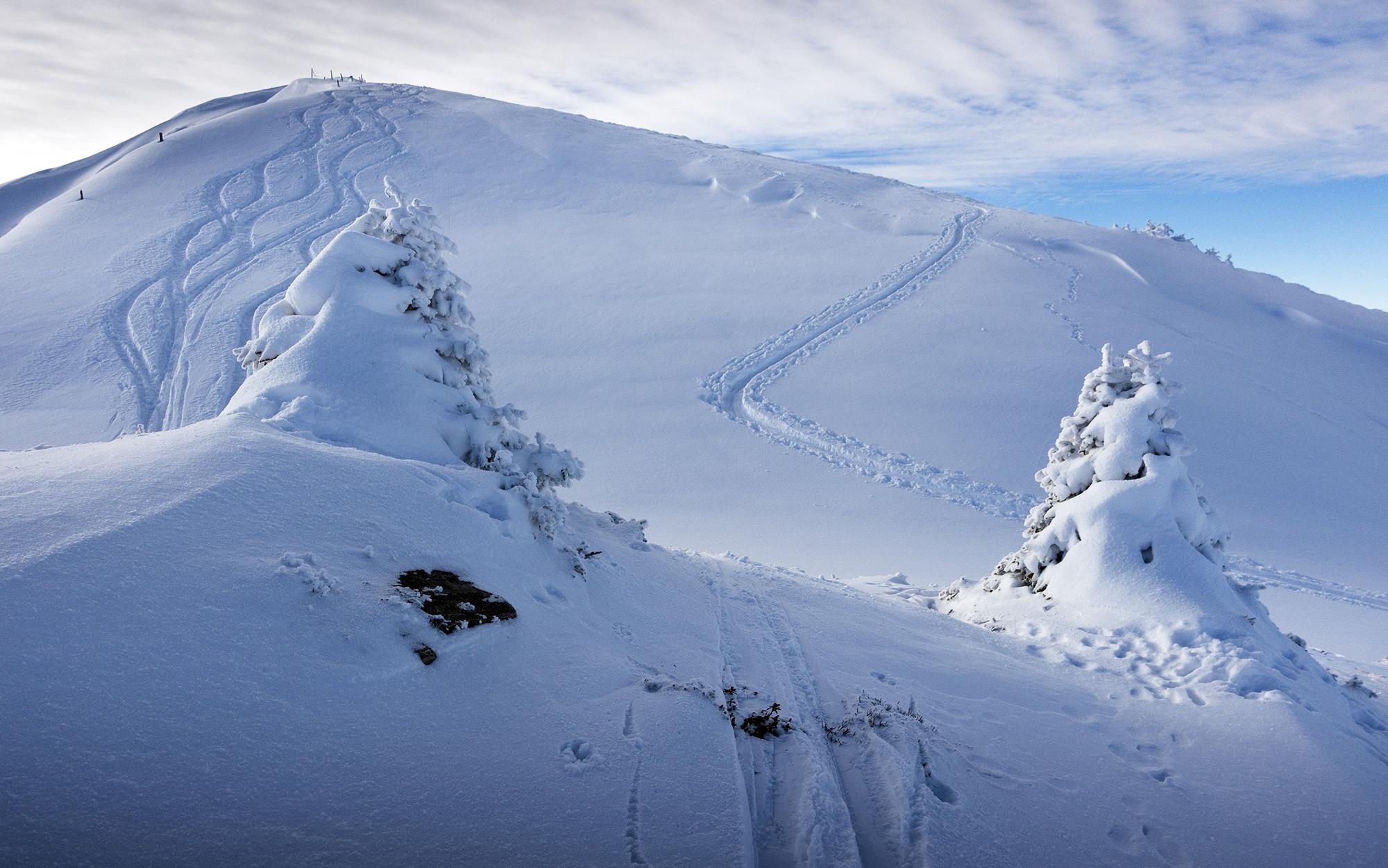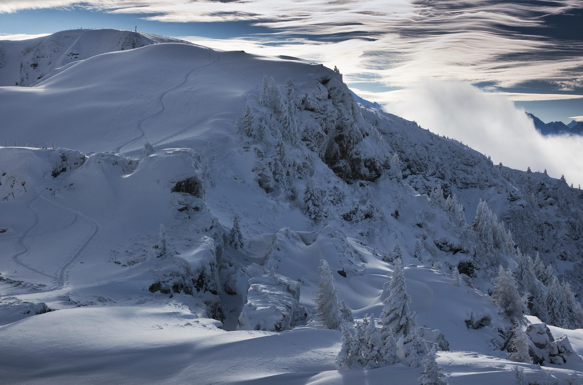 Durchgehend Minustemperaturen sorgten für durchgehend Pulverschnee. Vom Start weg in Unterberg 50cm Pulver, die unterste Schicht ist schon etwas gesetzt, darüber ca 30cm lockerer ungebundener Schnee. Am Gipfelkamm zwischen Brunnkopf und Schwalbenwand war mehr Schnee als erwartet, man konnte durchgehend mit Ski auch vom Schwalbenwandgipfel abfahren. Hier oben war der Schnee natürlich vom Wind gepresst, fest und ungleichmäßig verteilt. Aber inzwischen ist es windarm. Grundberührung war mit meinem breiten Ski kein Thema, ich kann mir jedoch vorstellen, dass man mit einem schmaleren Ski hier und da mal auf Fels oder Vegetation stößt.