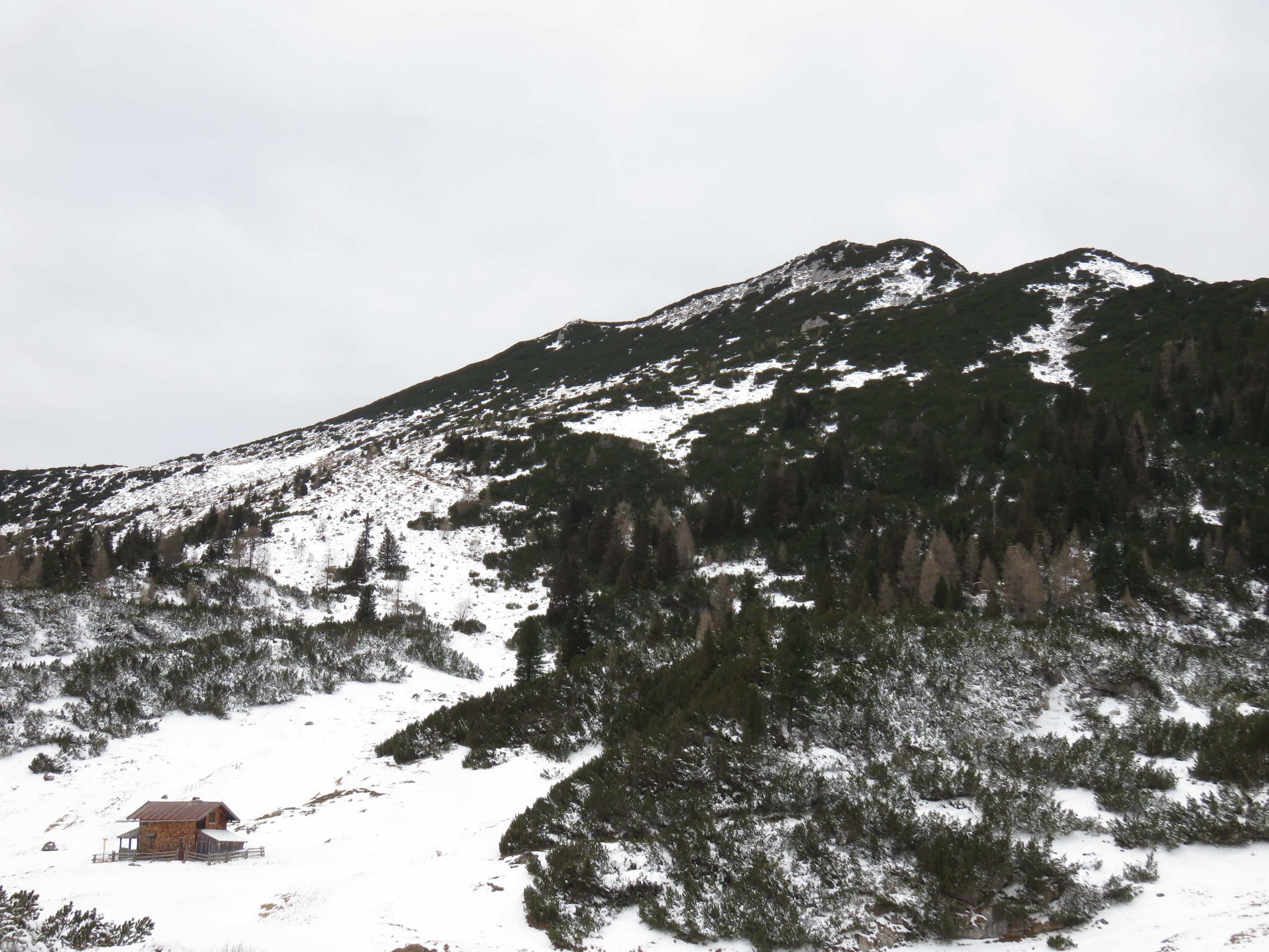 Neue Traunsteiner Hütte zum Großen Weitschartenkopf Sommermarkierung noch gut sichtbar. Kleinräumig hatte der Schnee einen leichten Deckel sonst durchwegs Pulverschnee.
