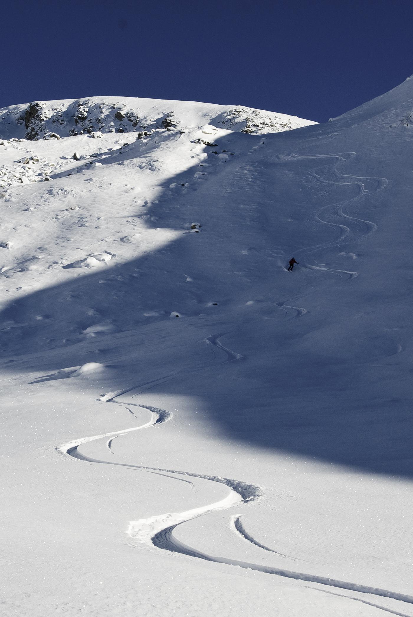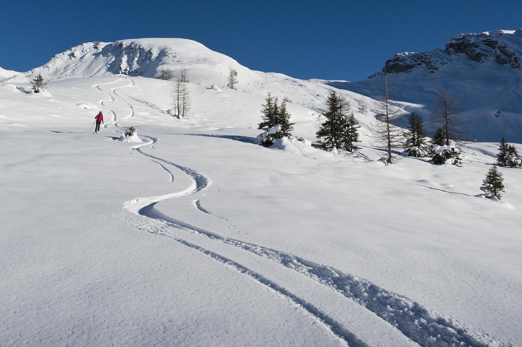 Zu den Verhältnissen: Siehe Tour Kolmkarspitze. Sonnseitig hat sich der Schnee heute schon angewärmt und ist schwer geworden. Schattseitig noch Pulver. Im Filzenkar ist weniger Schnee als im Kolmkar.
